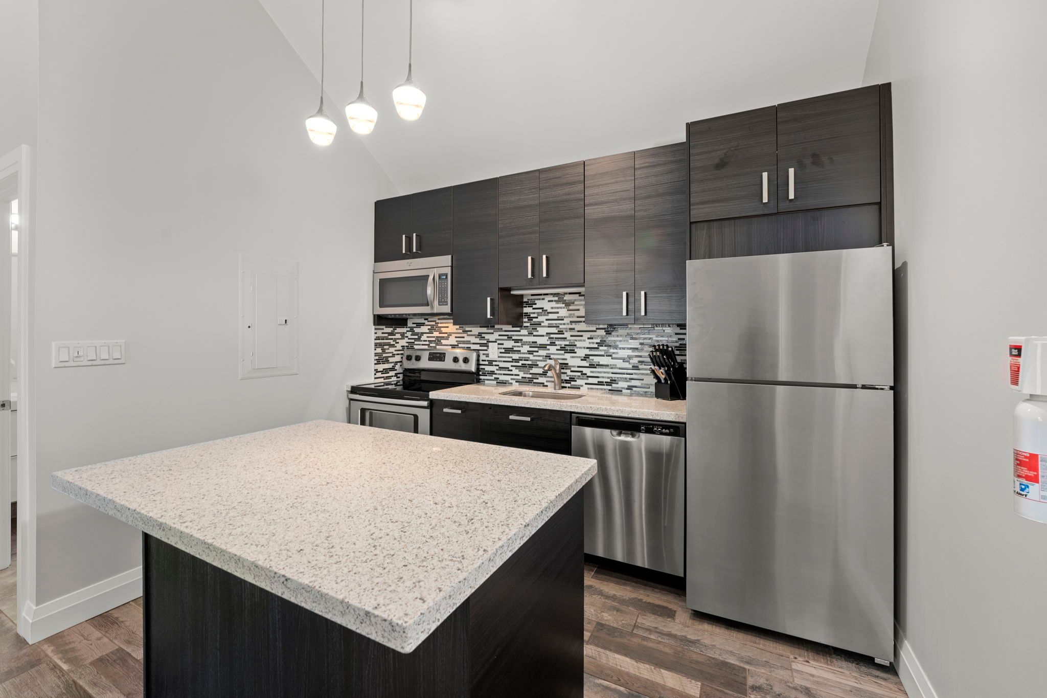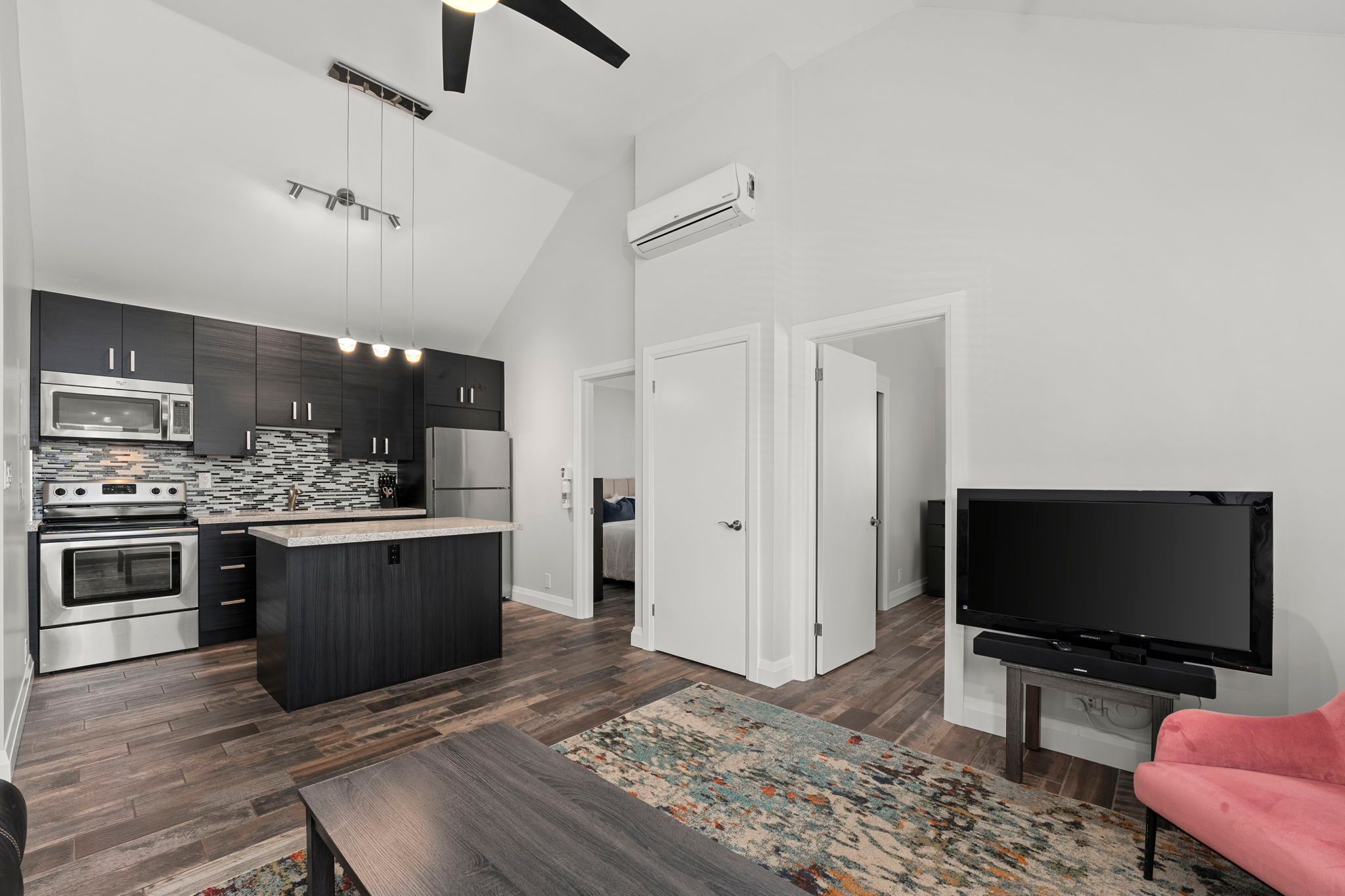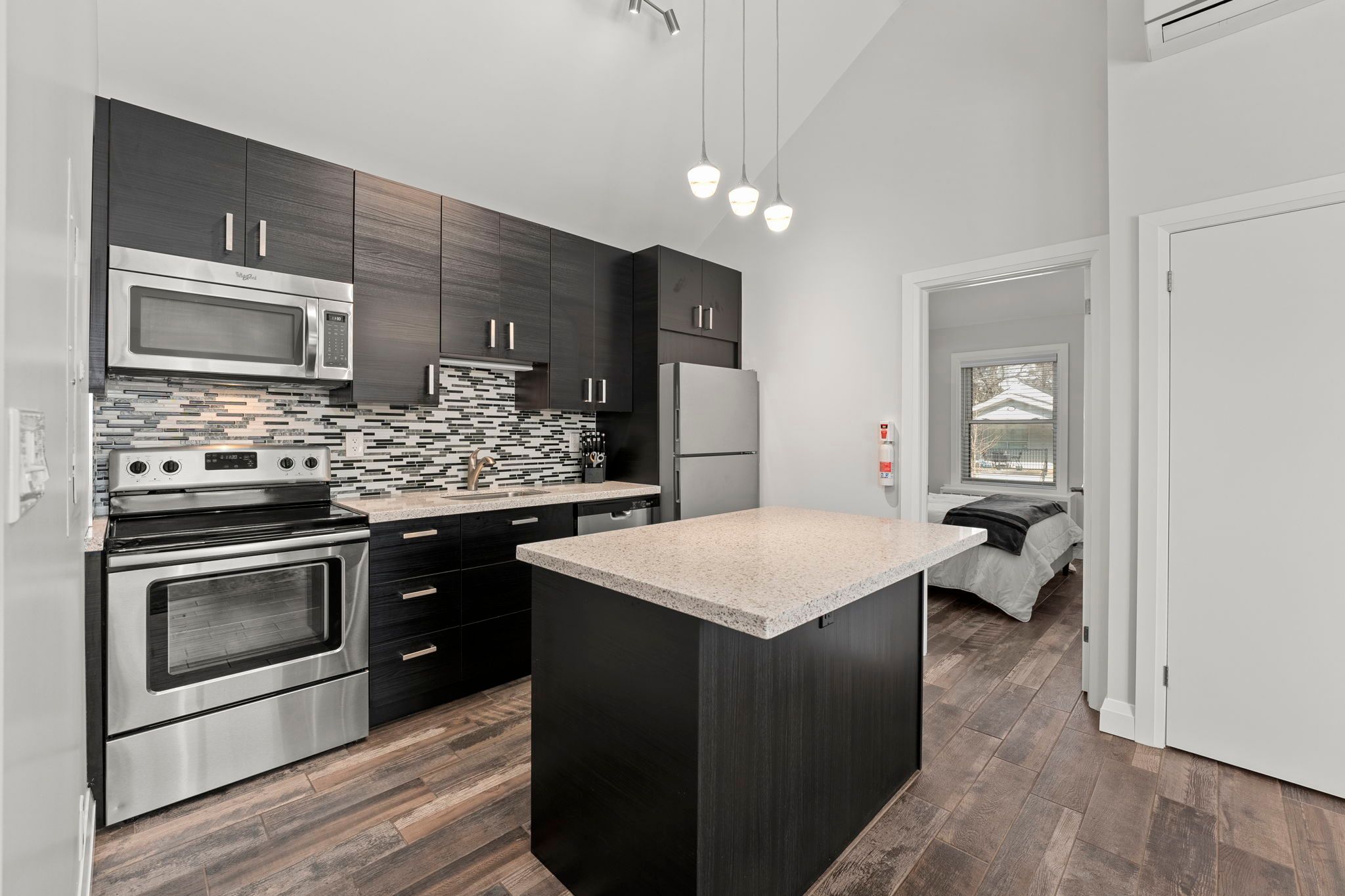 • Open concept kitchen featuring stainless steel appliances for modern living.