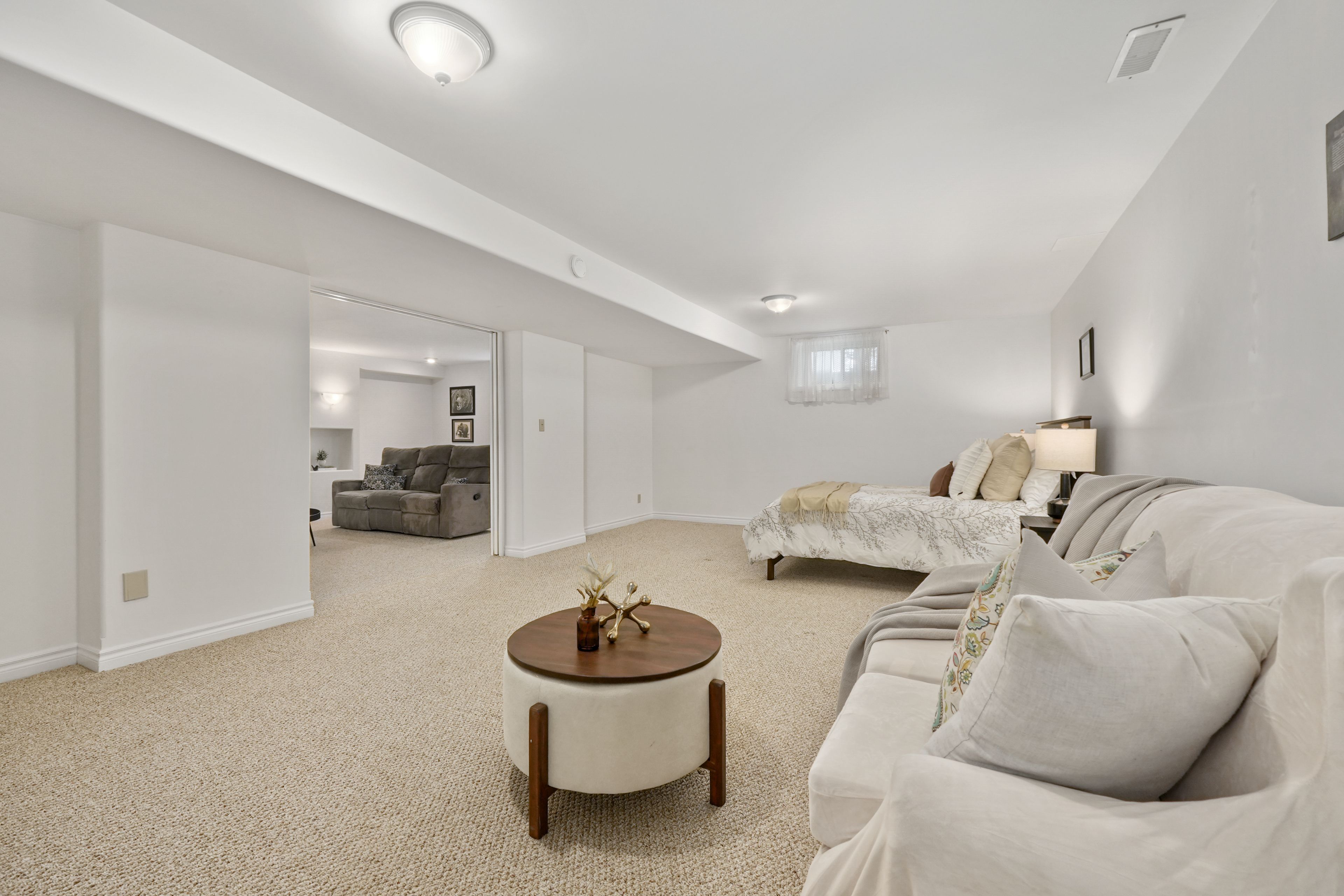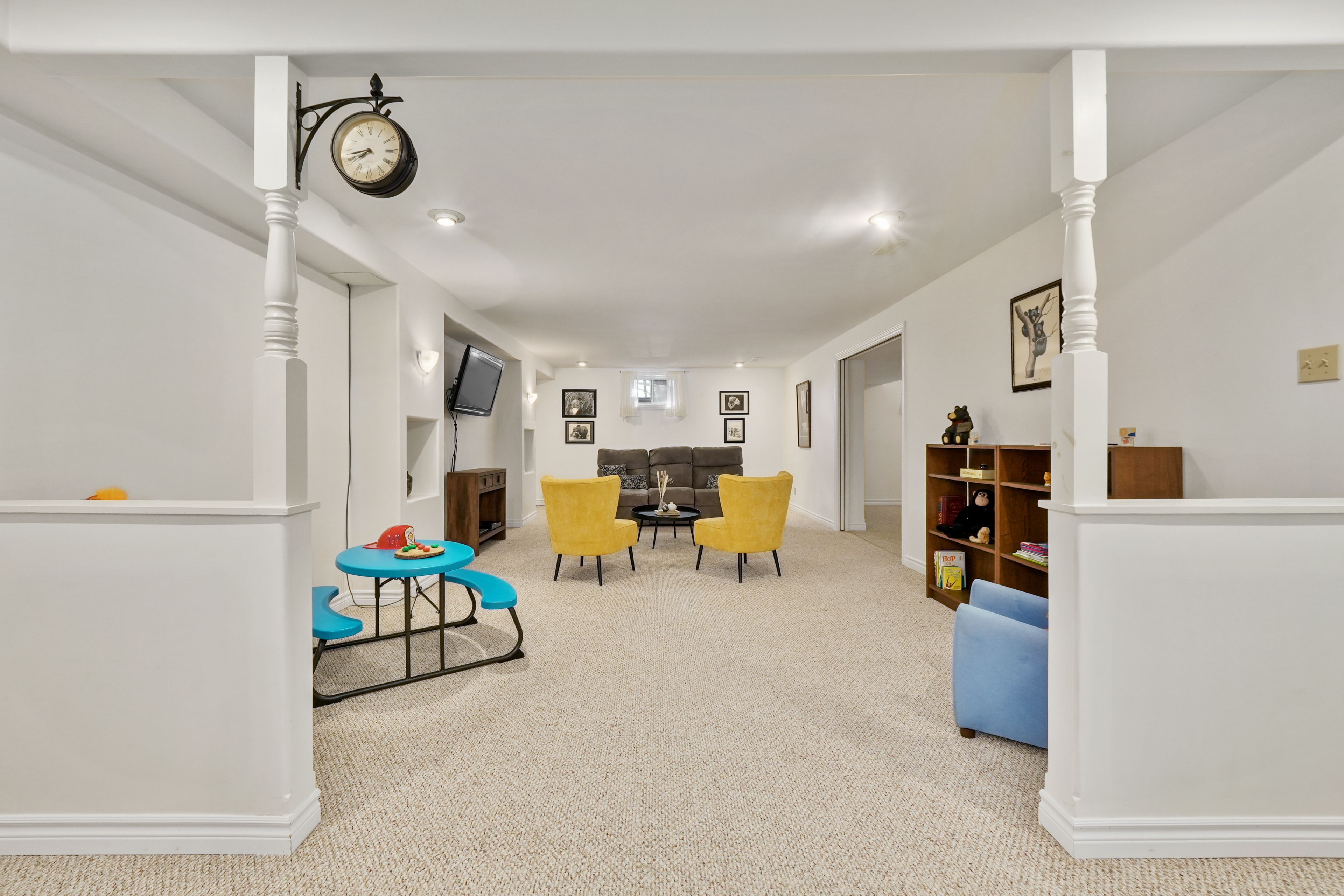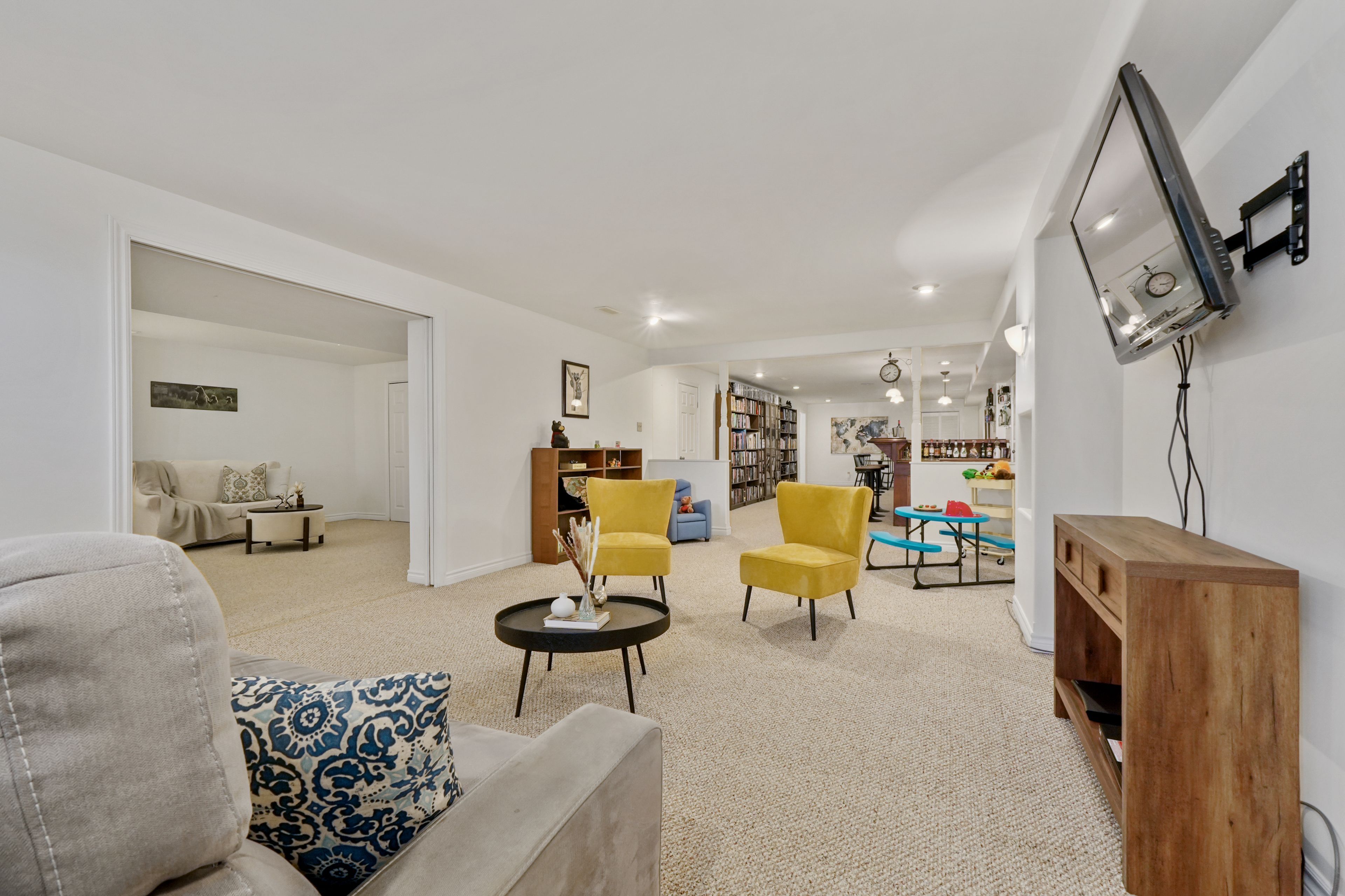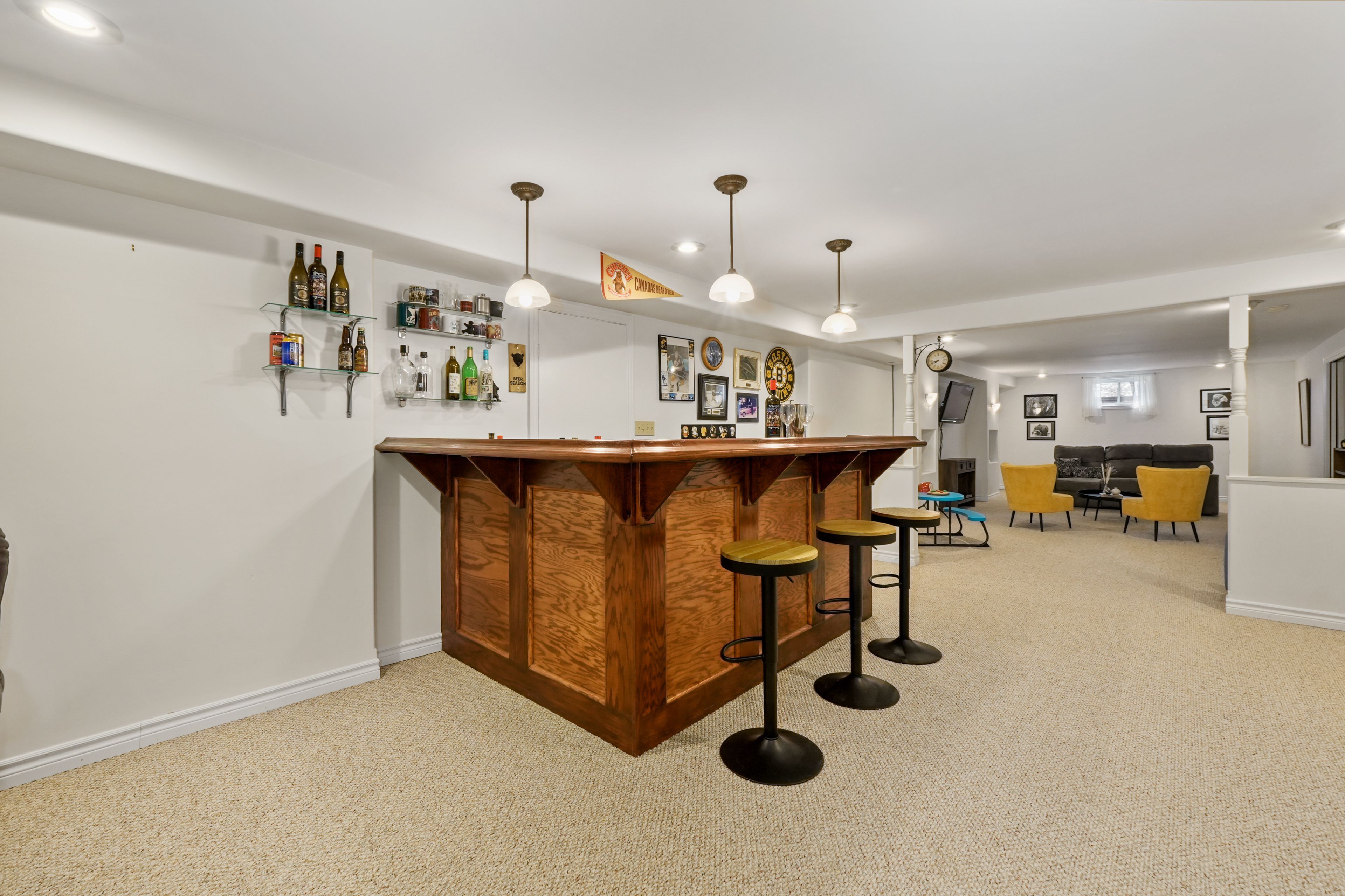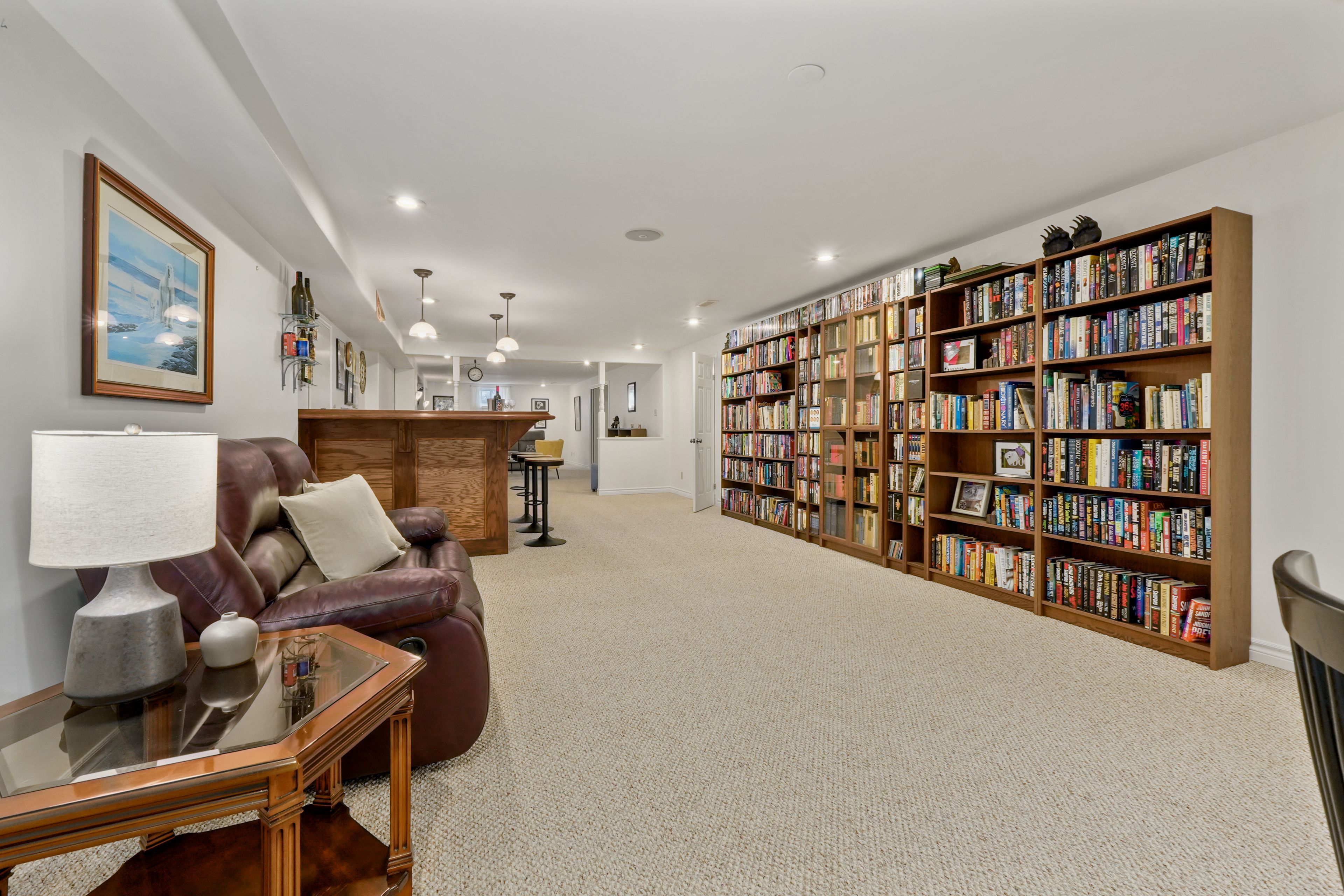 • Finished lower level with rec room, built-in bar, and guest room.