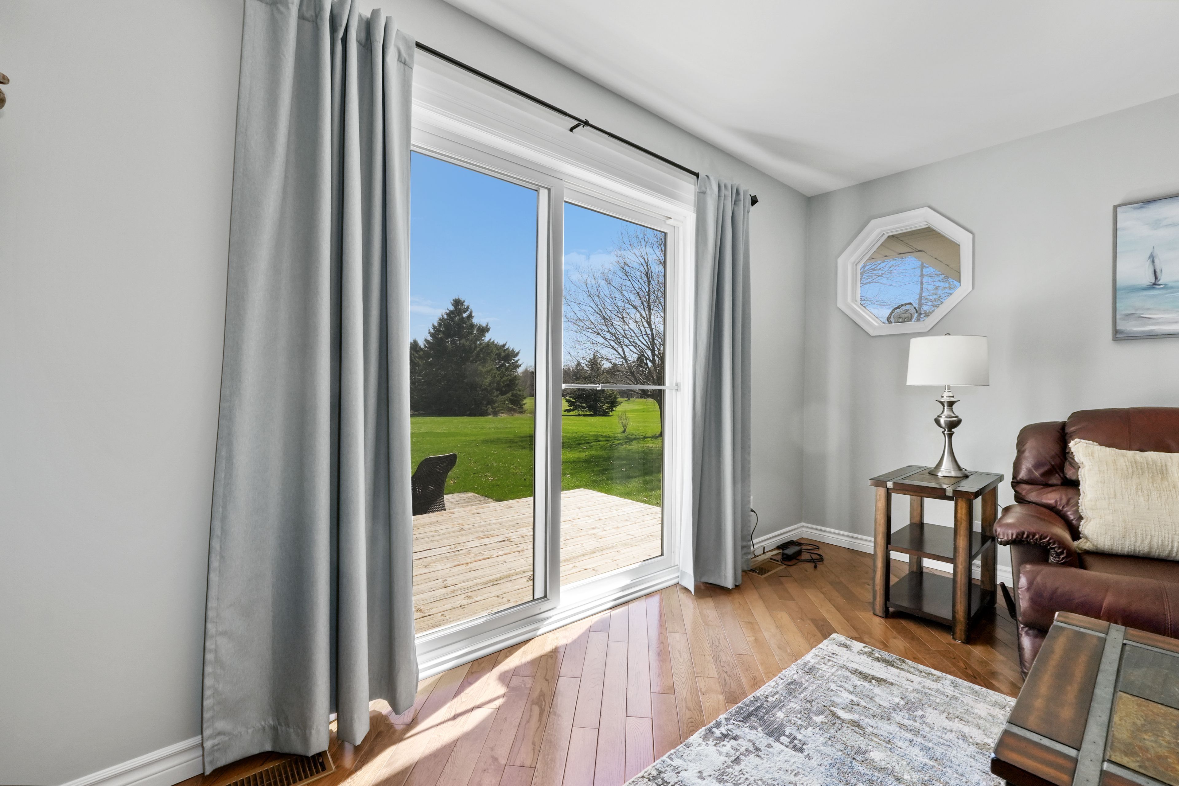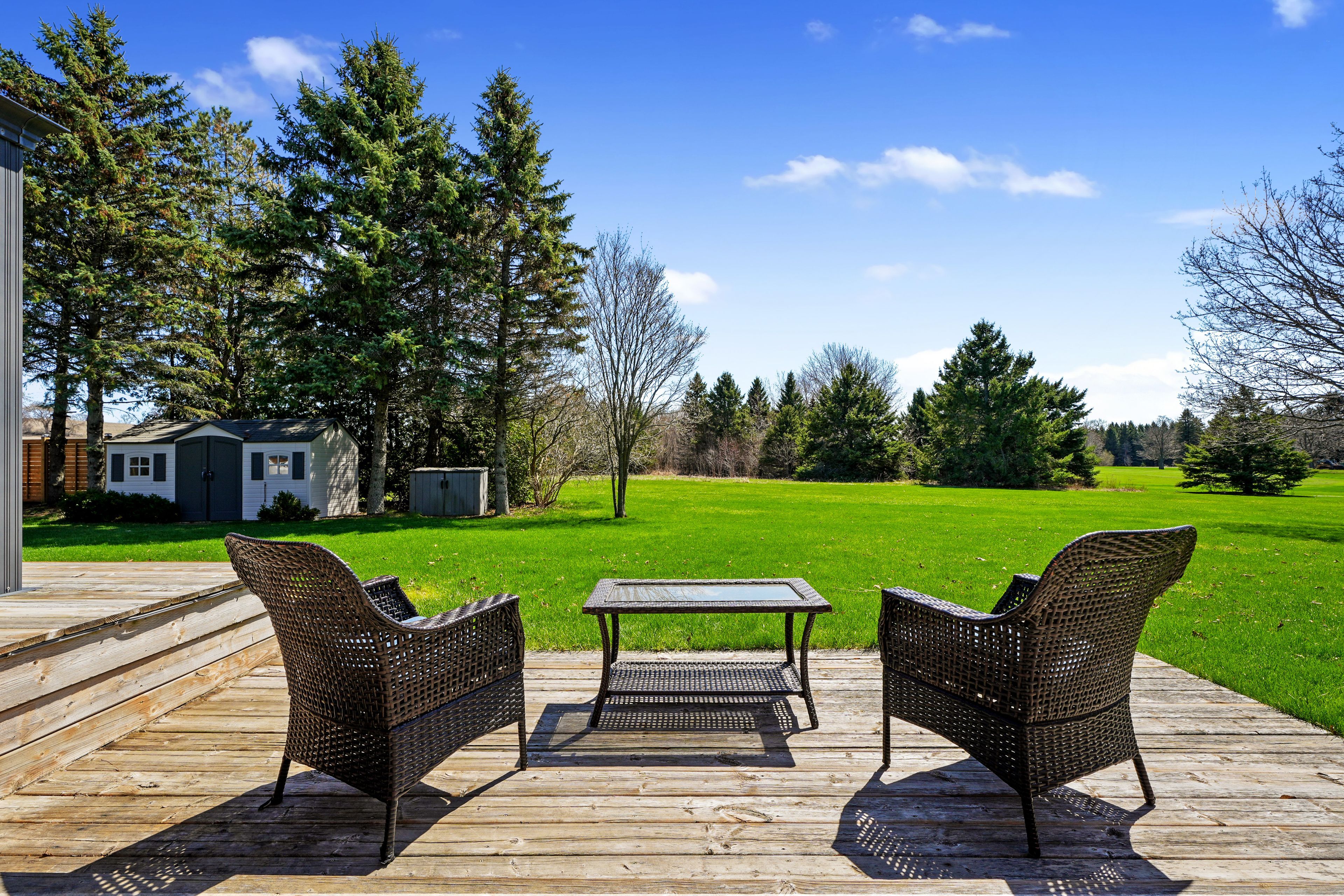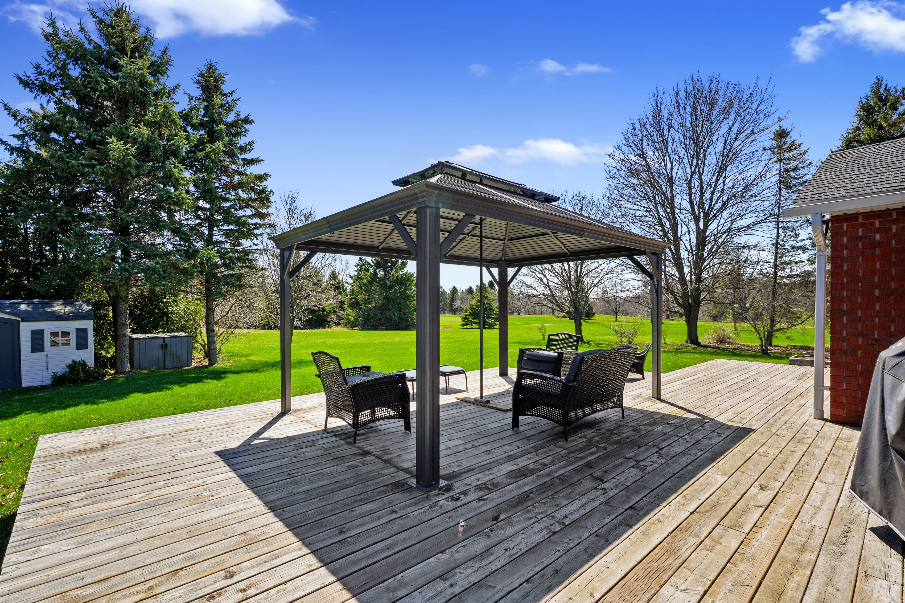 • Large deck and scenic backyard with stunning golf course views.