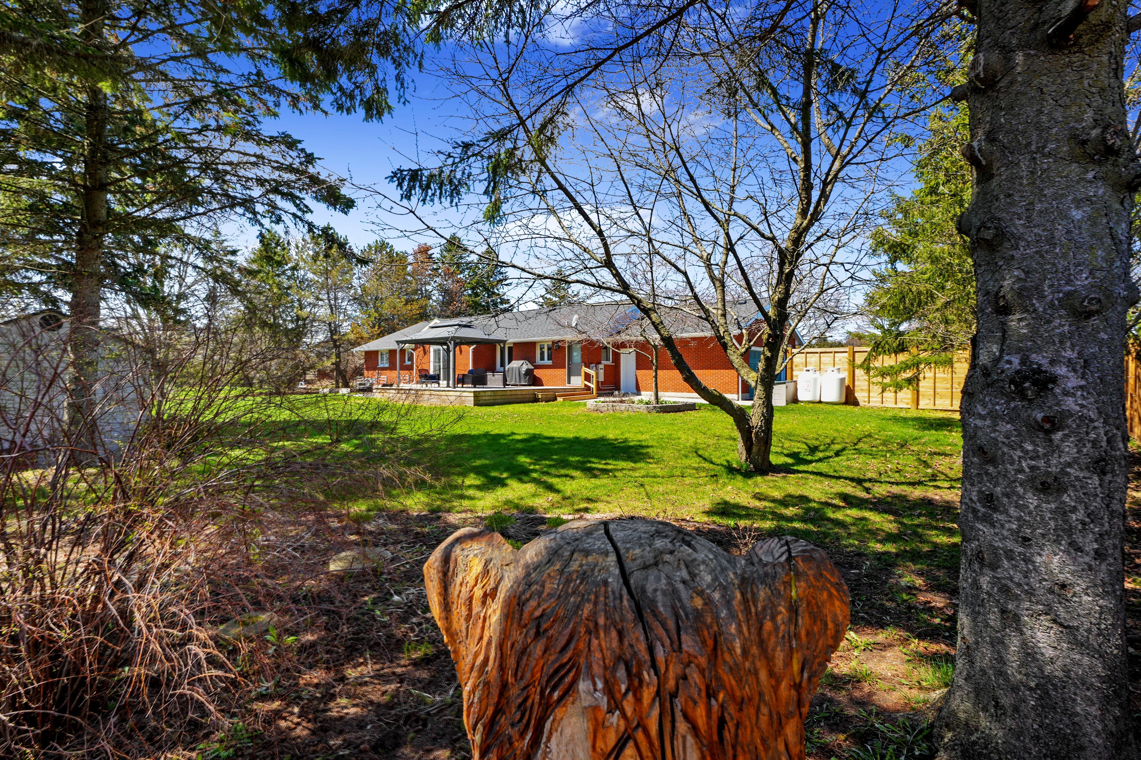 Beautifully updated bungalow with an attached garage and finished basement, backing onto dalewood golf course. An ideal setting for golf enthusiasts and those seeking peaceful, scenic surroundings. Step into the open front foyer, where diagonally laid flooring flows seamlessly through the main living areas. Glass french doors lead into a bright living room featuring a wall of windows and elegant crown moulding. The spacious dining room is perfectly suited for hosting large gatherings and holiday dinners. The modern eat-in kitchen offers a generous, informal dining area, ideal for everyday meals. Thoughtfully designed, it showcases sleek countertops that extend seamlessly into the backsplash, stainless steel appliances including a hood vent, ample cabinetry and counter space, a breakfast bar, pendant lighting, and open shelving. A convenient walkout enhances functionality and flow. The main floor family room provides a comfortable space to unwind, complete with a walkout to the backyard for effortless indoor-outdoor living. The primary suite is warm and inviting, featuring crown moulding and a private ensuite with a glass shower enclosure. Two additional bedrooms, a full bathroom with double vanity, and a dedicated laundry room complete the main level. The finished lower level expands the living space with a sprawling rec and games room, offering distinct areas for media, lounging, and entertaining. A built-in bar and games area make it perfect for hosting, while a large guest room and additional bathroom add versatility. Outdoors, enjoy a spacious deck with a propane bbq hookup, ideal for summer entertaining. The property boasts ample green space, perennial gardens, and mature trees that provide privacy and a sense of seclusion, all complemented by stunning golf course views. A generac generator offers added peace of mind. Conveniently located near amenities, this home offers the perfect balance of relaxed country living and everyday convenience.