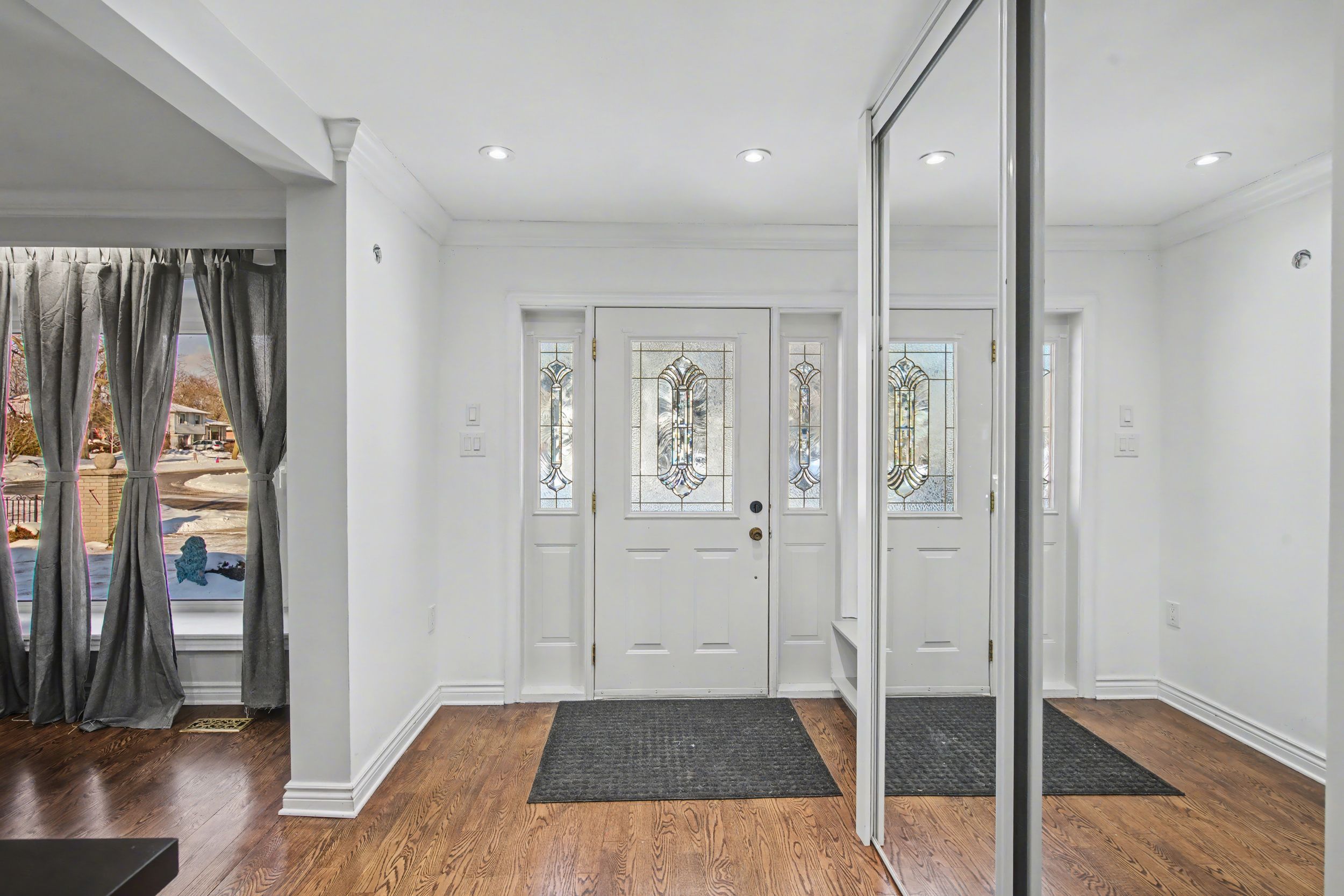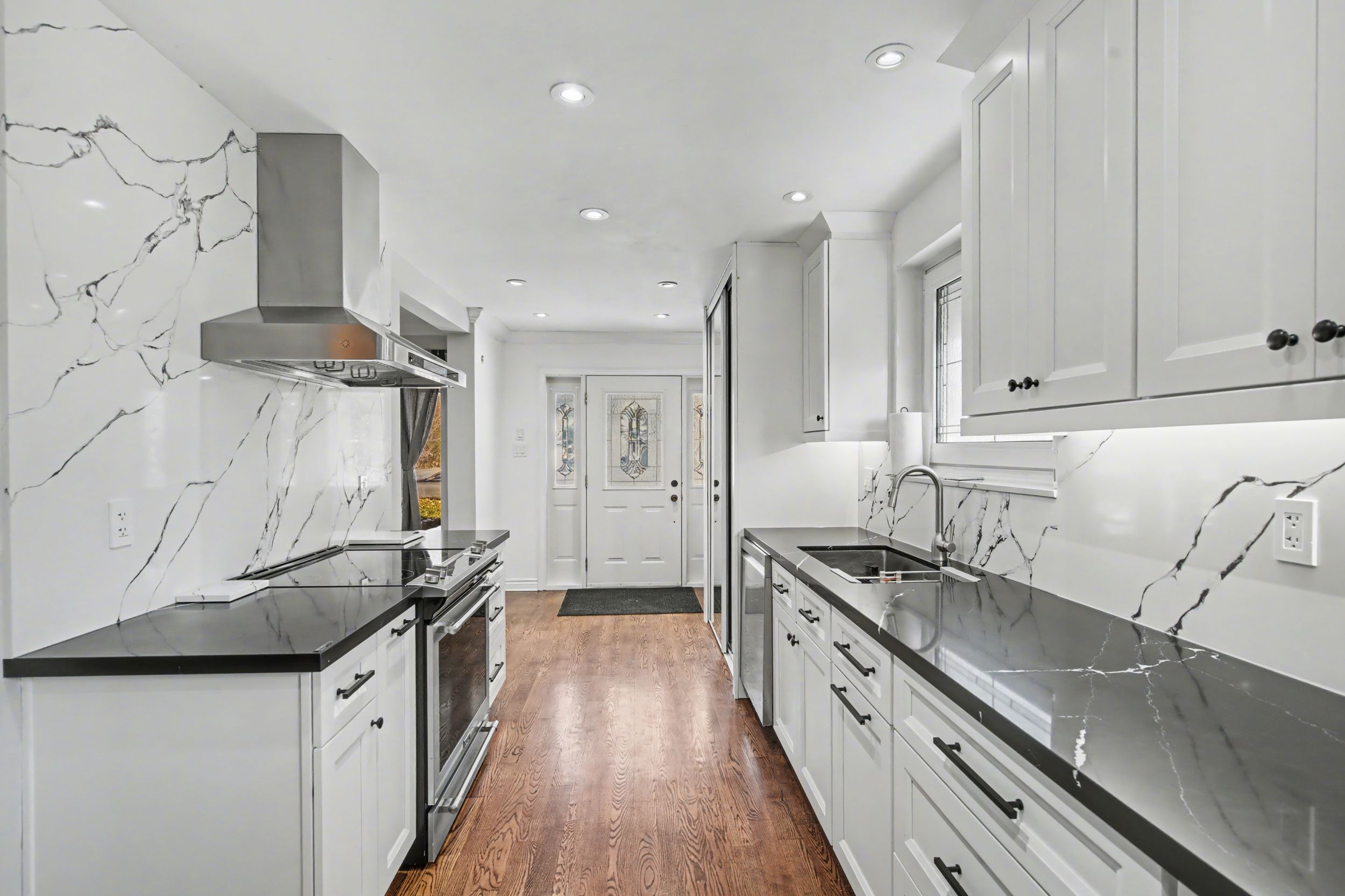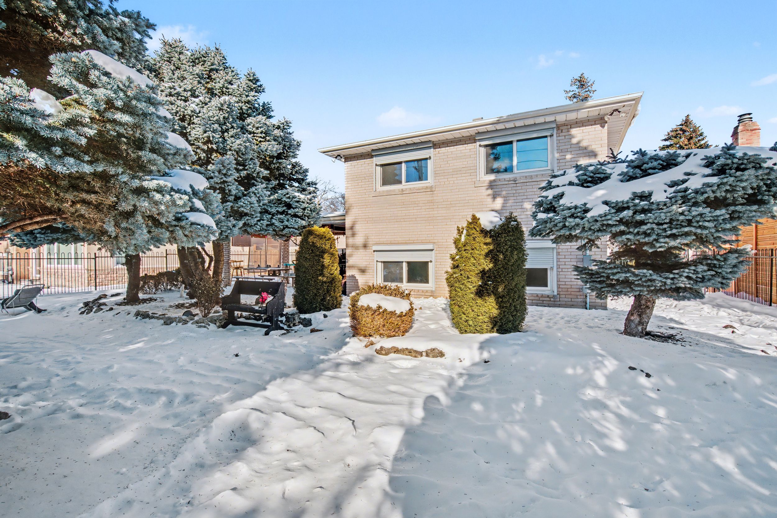 Set on a beautifully landscaped lot, this elegant four-level backsplit offers timeless curb appeal and refined interior living. Boasting approximately 1,802 sq ft of thoughtfully designed space, the home features four spacious bedrooms and two full bathrooms, complemented by a series of tasteful upgrades. Enjoy a brand-new 2025 custom kitchen with quartz slab backsplash, sleek black stone countertops, high-end stainless steel appliances, and classic white cabinetry with elegant black hardware. Recent upgrades include new windows, renovated bathrooms, hardwood floors, front porch, garage door, furnace, central air conditioning, roof, and washer/dryer. A separate side entrance leads to a private, fenced backyard with covered patio-perfect for relaxing or entertaining. Move-in ready and meticulously maintained, this home is a true showpiece.
