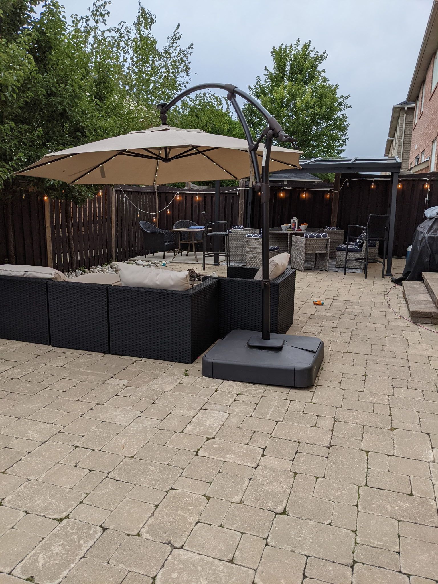 • Backyard oasis with patterned concrete, great for summer barbecues.