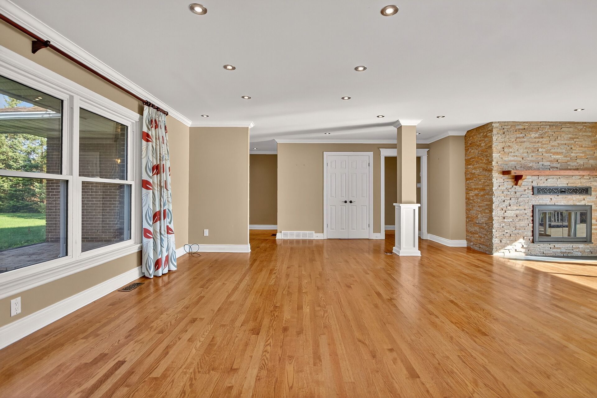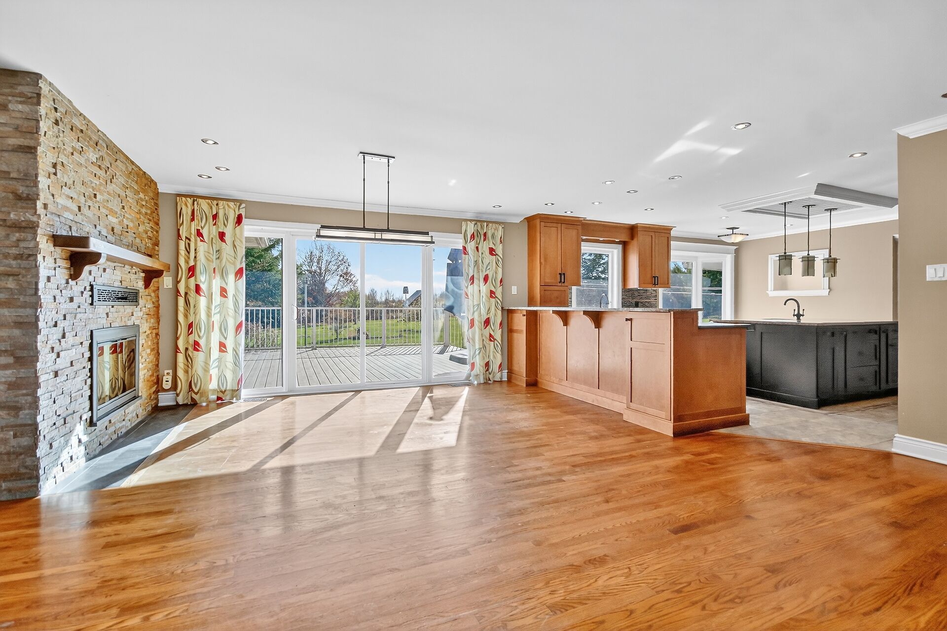 • Open-concept main floor with a cozy wood-burning fireplace.