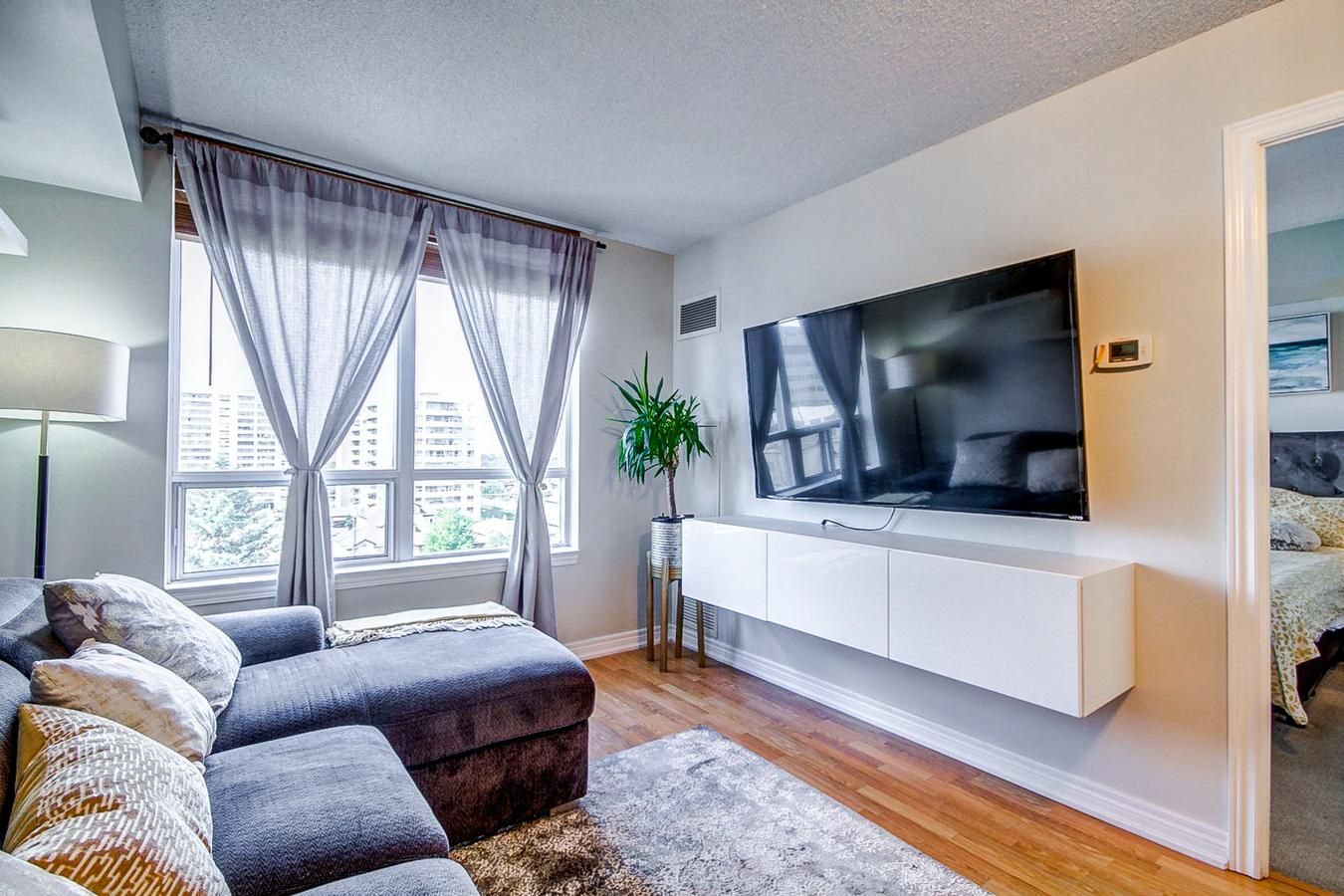 Bright & spacious 1+den, 2 bath suite with 2 parking spots & locker included! Move-in ready and designed for comfortable living, this sun-filled unit features a functional layout with a versatile den behind double doors-perfect as a home office, guest room, or even a second bedroom for added flexibility. The primary bedroom offers a private ensuite bath and closet organizer, while the second full bathroom adds everyday convenience for guests or family. Enjoy the ease of ensuite laundry and an open-concept living space filled with natural light-ideal for entertaining or relaxing after a long day. Perfect for young professionals needing a dedicated work-from-home space, small families looking for extra room, or downsizers seeking low-maintenance living without compromise. Located in a boutique, well-maintained building with great amenities including a gym and rec room. Just minutes to york university, humber river hospital, and quick access to highways 401 400. Steps to ttc transit, shopping, grocery stores, restaurants, and everyday essentials-everything you need right at your doorstep! A fantastic opportunity to live in a well-connected, walkable community with space, convenience, and comfort all in one. Don't miss it!
