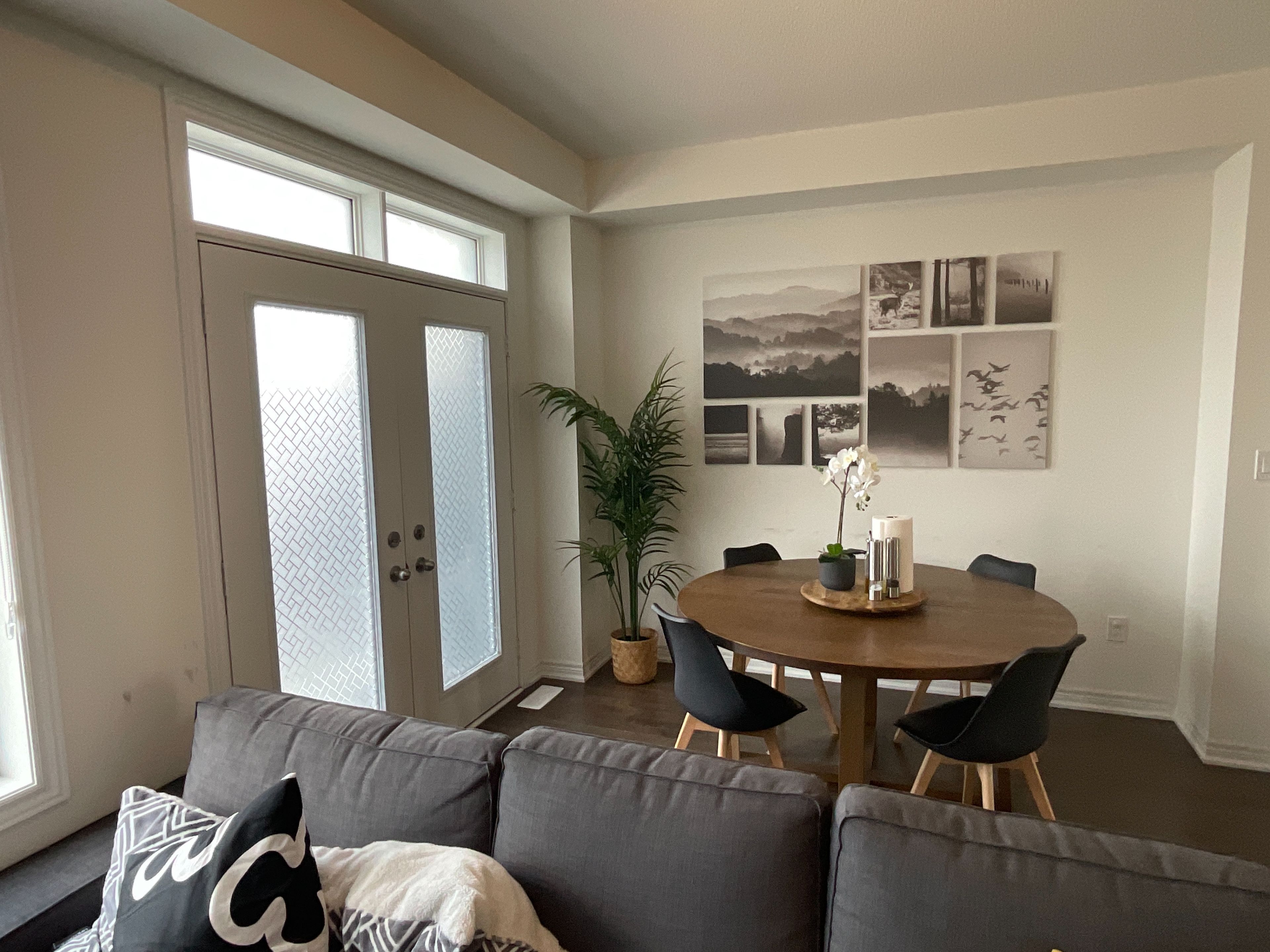 Main & upper level only. Tenant pays 80% utilities. Bright and beautifully designed, this modern freehold end-unit townhome offers exceptional space, style, and functionality. Enjoy direct access to a spacious double-car garage, along with an extended double driveway rear lane. Sunlight pours through large windows in every room, creating an airy and inviting atmosphere throughout. The contemporary kitchen features built-in oven and stove, overlooking a generous family room complete with an electric fireplace. Step out onto the expansive double balcony and take in the serene eastern views-perfect for morning coffee or relaxing evenings. Elegant hardwood flooring flows seamlessly throughout the home, with no carpet in sight. The second floor offers two sleek glass showers-one in the ensuite and one in the main bathroom-alongside a well-sized laundry room with a utility sink, washer, and dryer for added convenience. Ideally located near foxtail green park, featuring a children's splash pad and playground, as well as scenic walking trails and lush green spaces. Situated in a growing, vibrant community with easy access to highways 407 and 401, schools, and everyday amenities. A perfect blend of comfort, and location-this is a home you'll be proud to call your own.