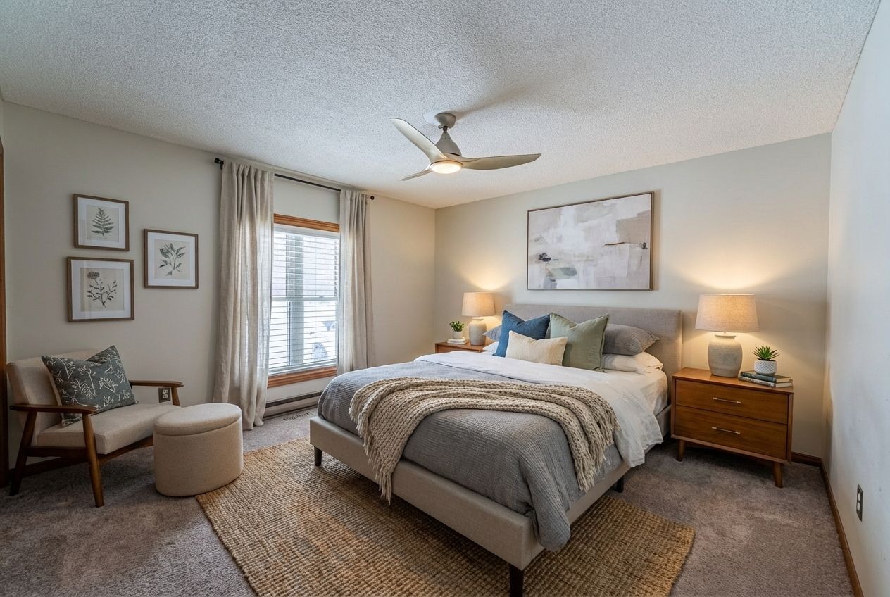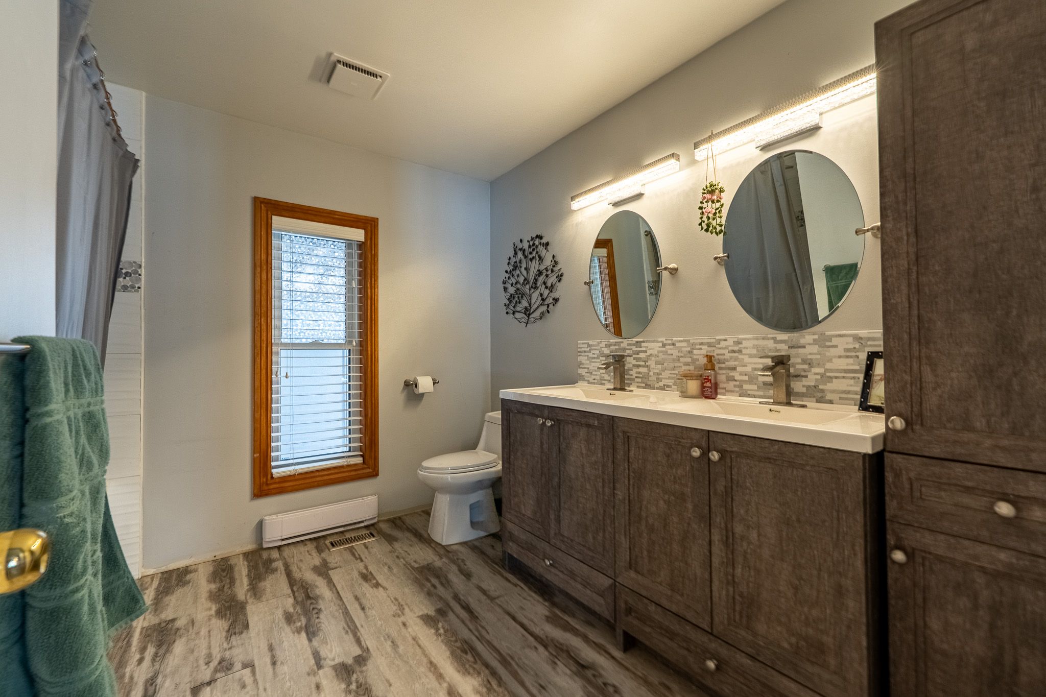 • Spacious primary suite with his-and-hers closets and large bathroom.