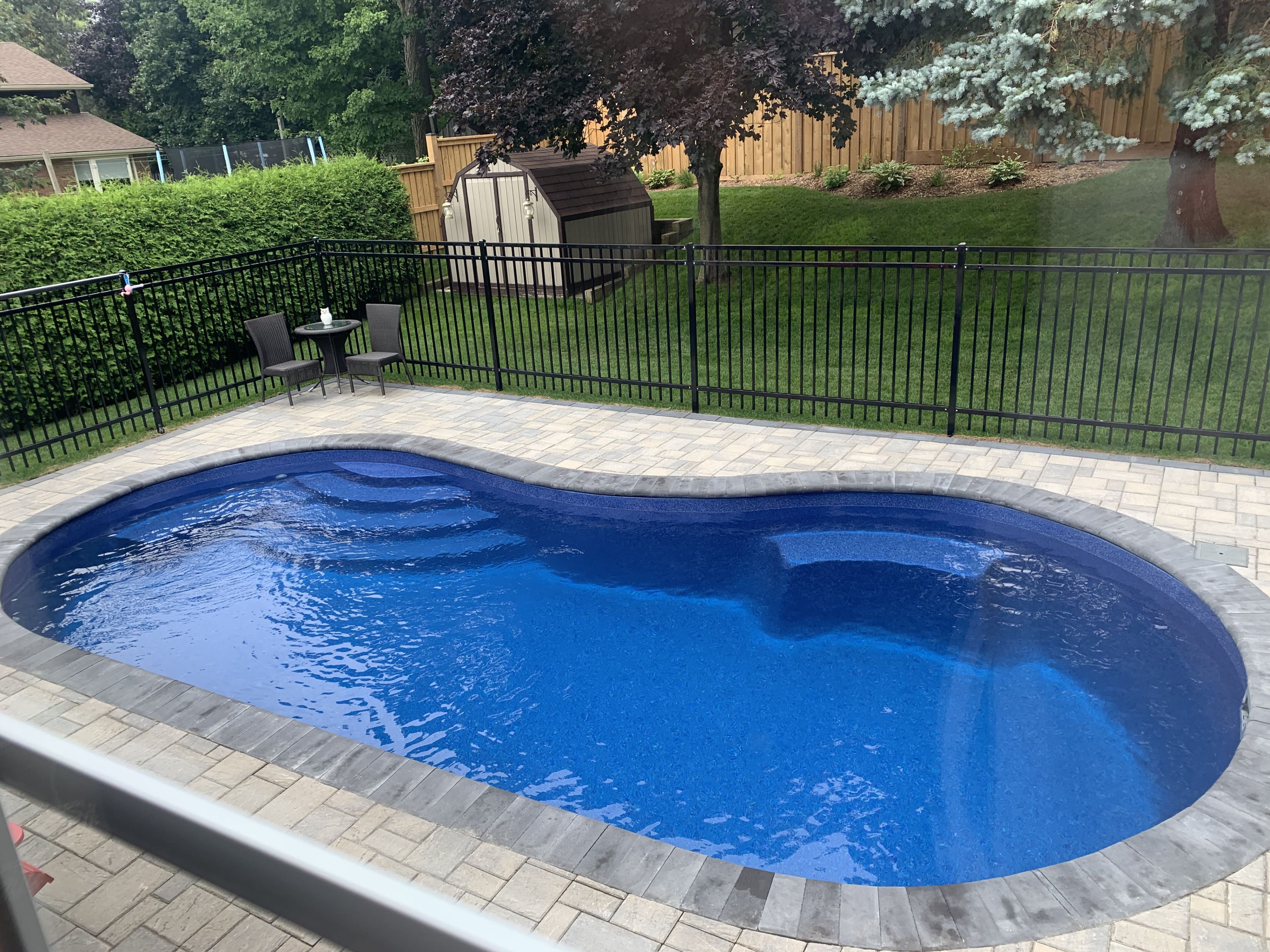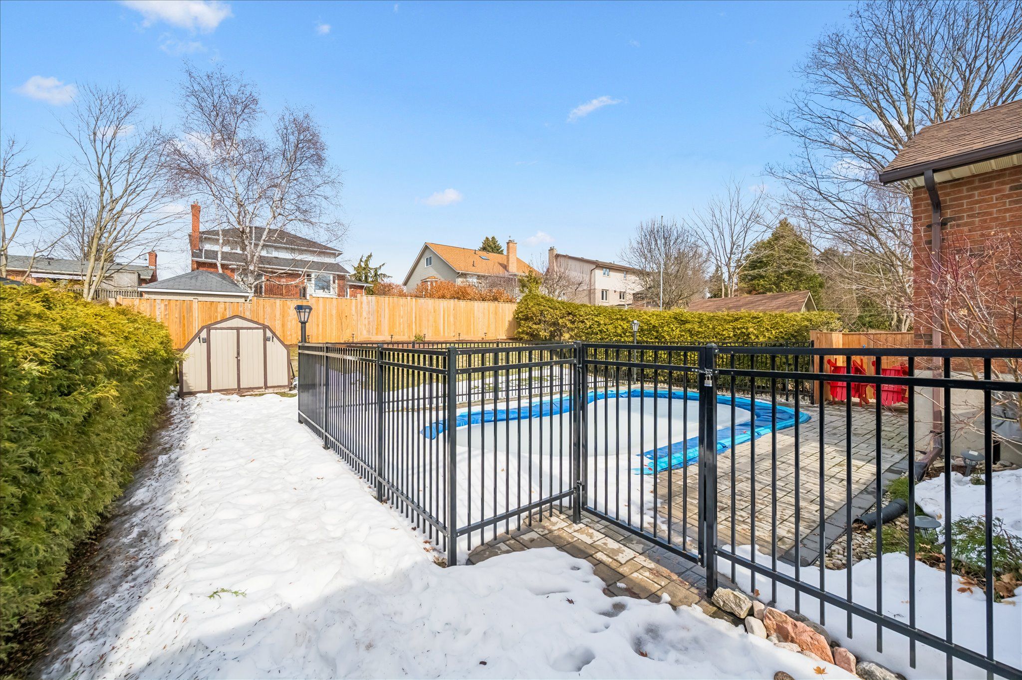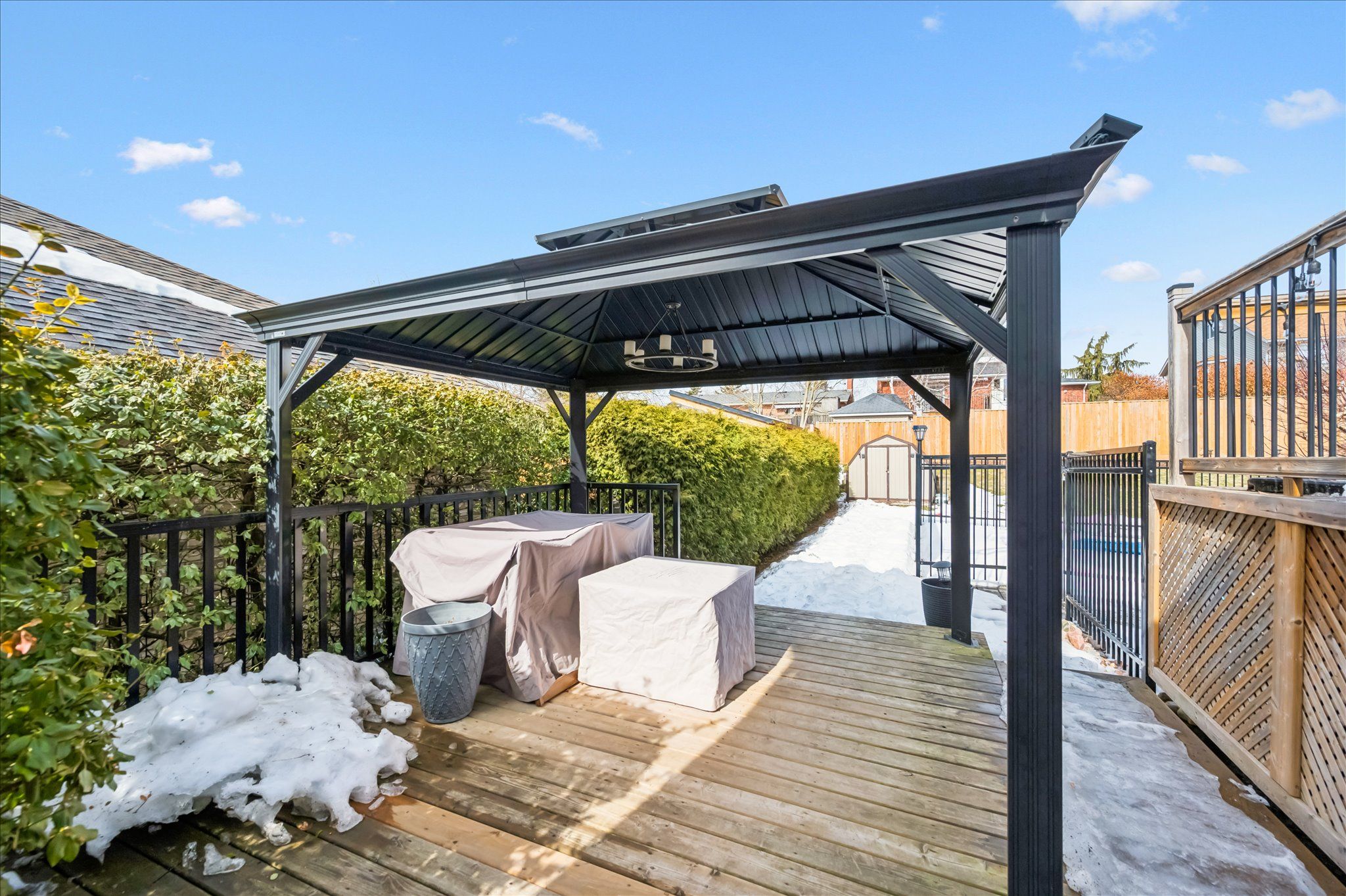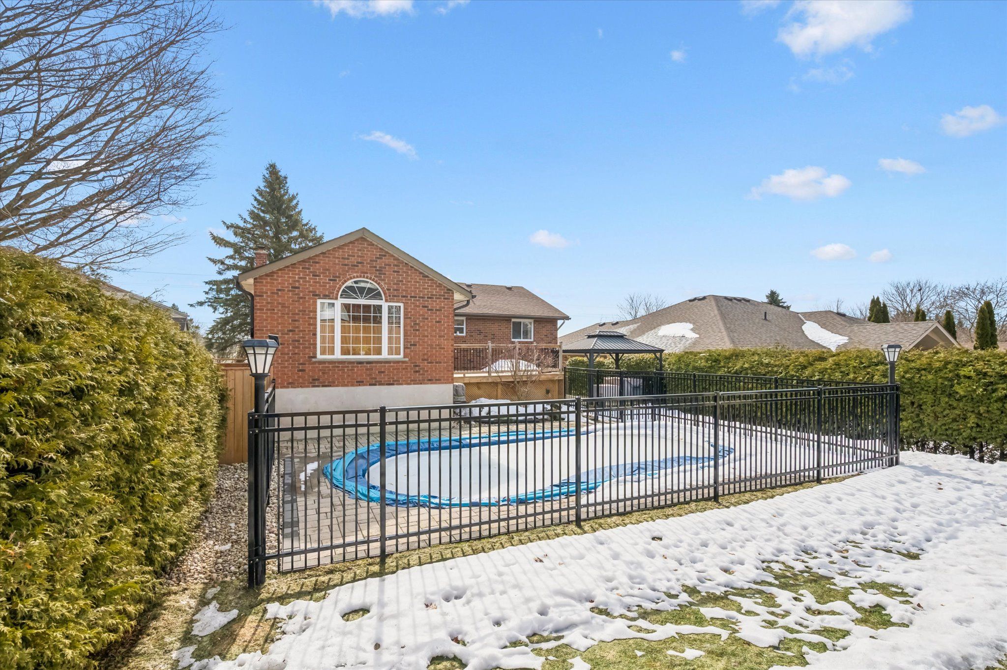 • Inground salt water pool with hardscaping and gazebo in the backyard.