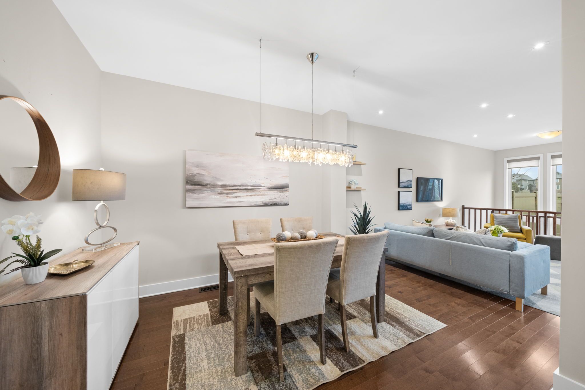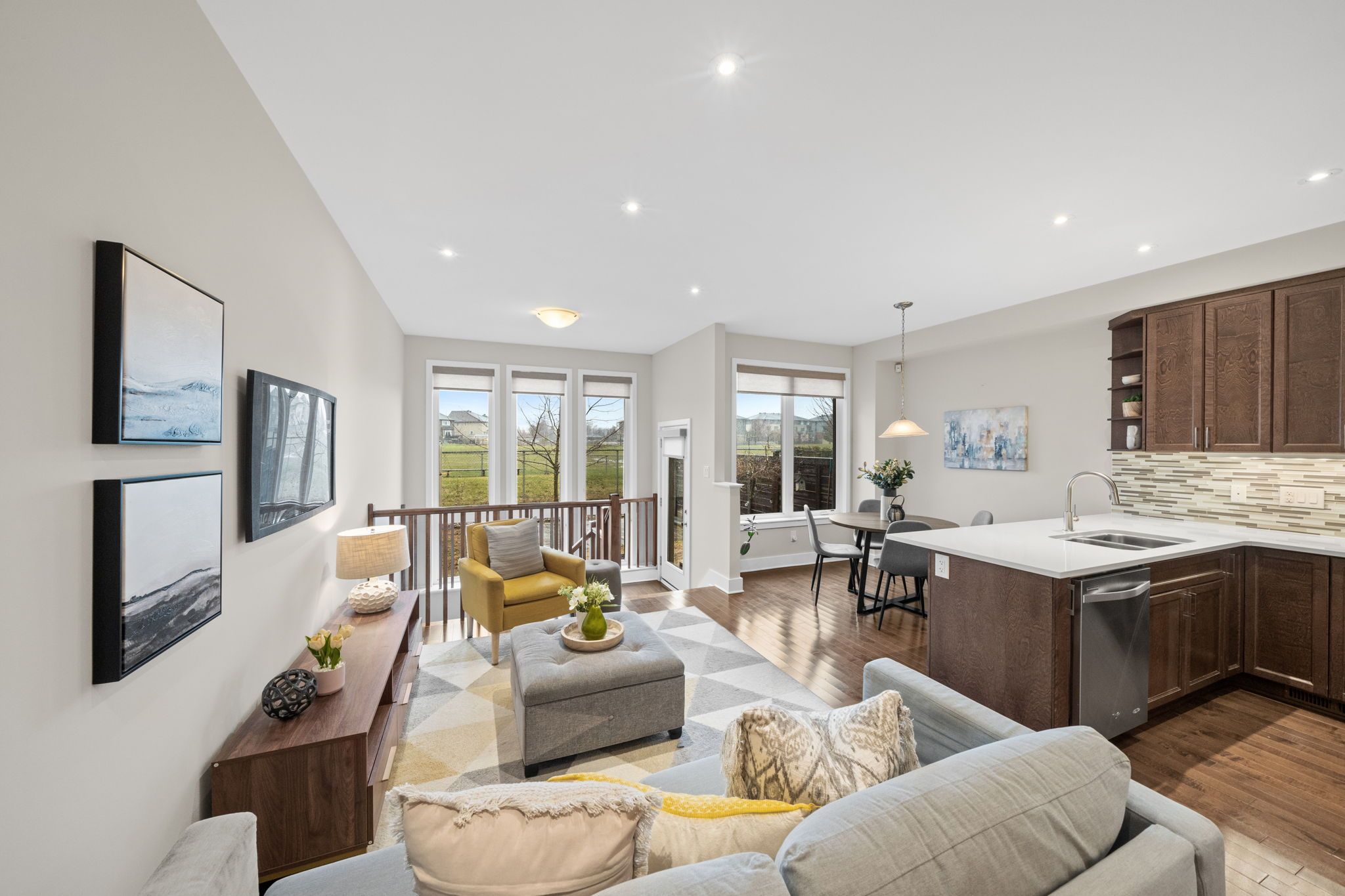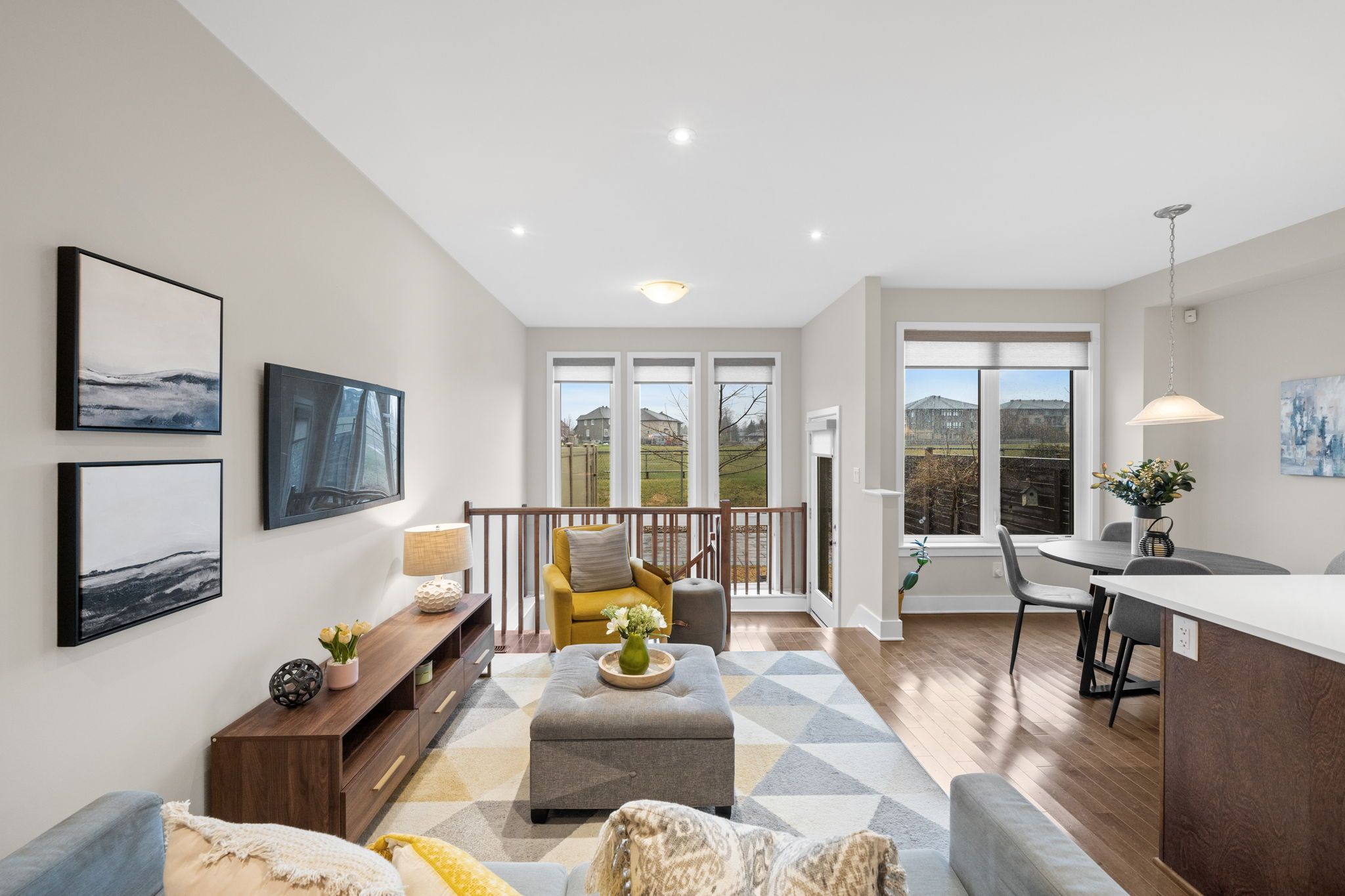 • Bright open living areas with a wall of windows and hardwood floors.