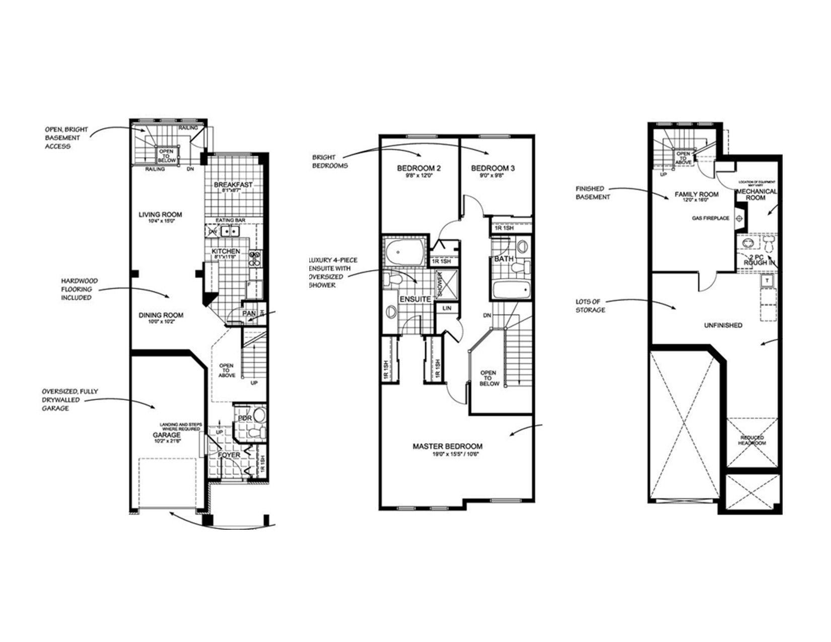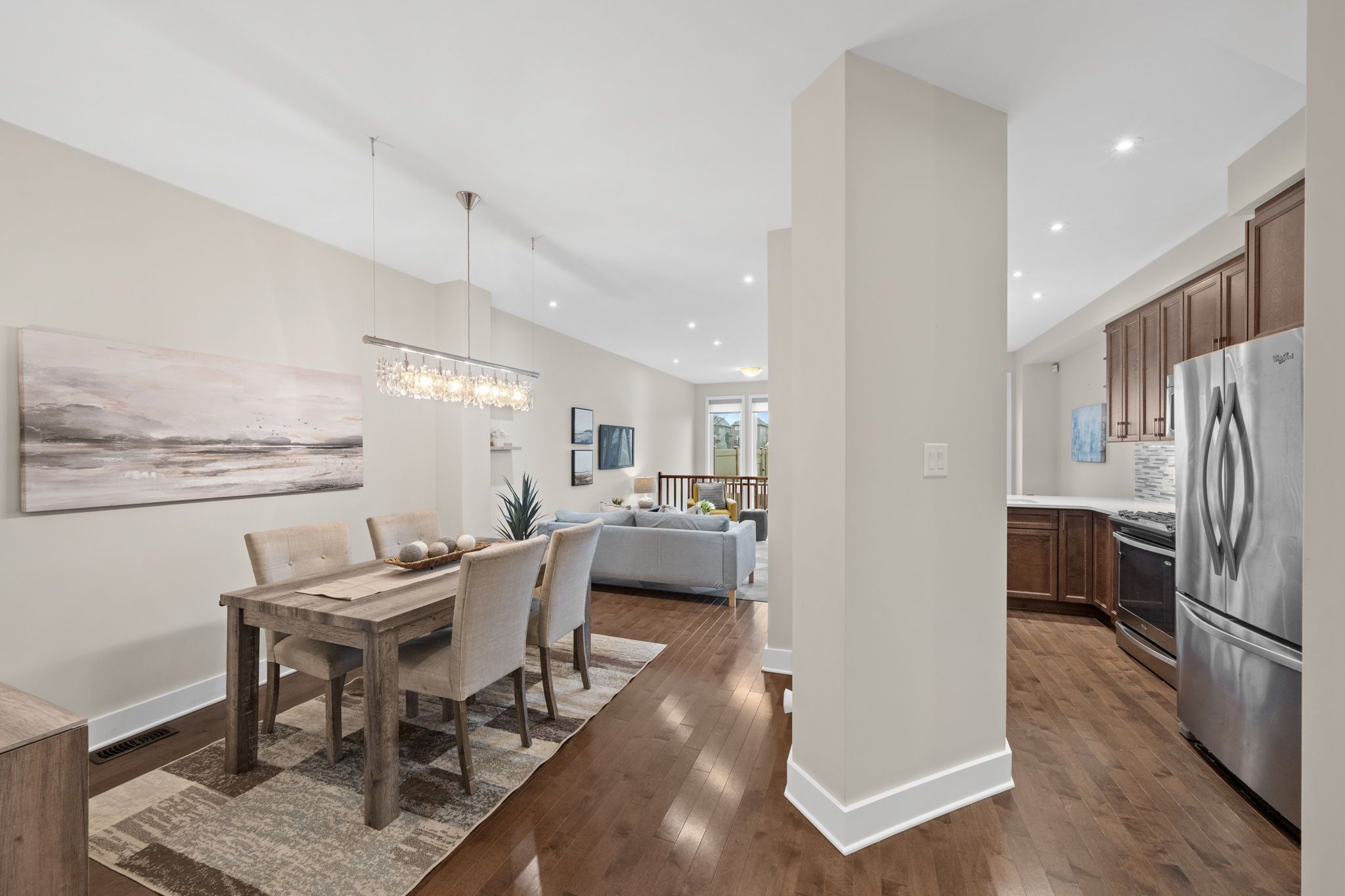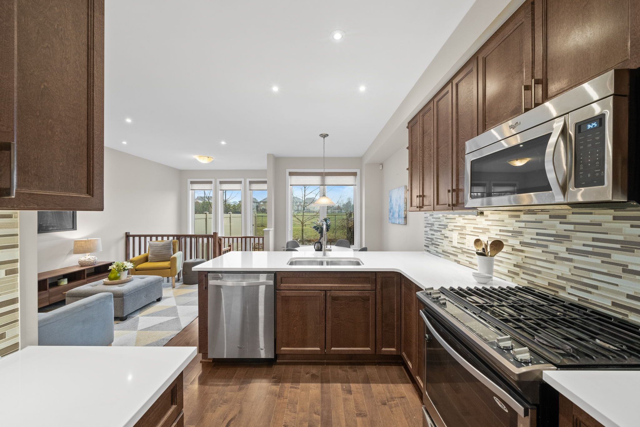 • Bright open living areas with a wall of windows and hardwood floors.