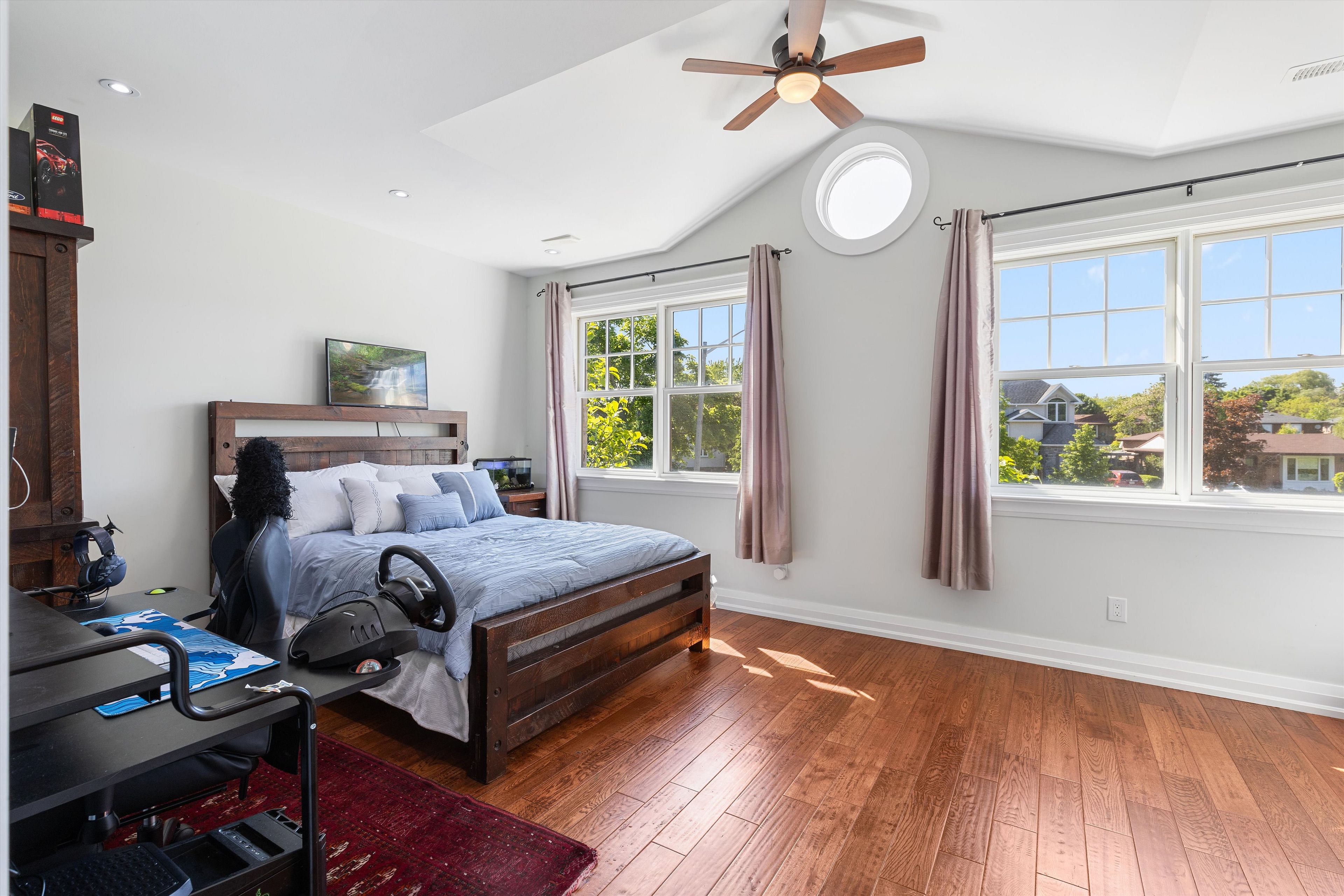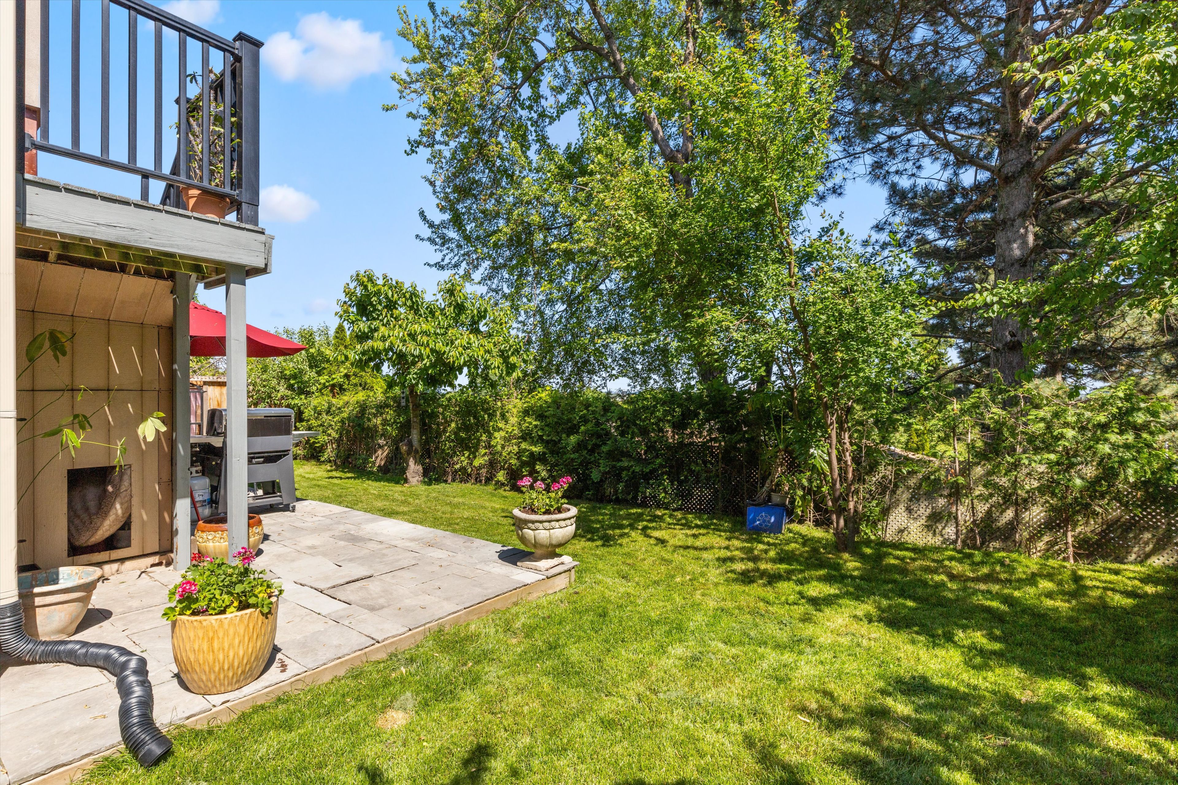 • Beautifully landscaped backyard surrounded by mature greenery for outdoor enjoyment.