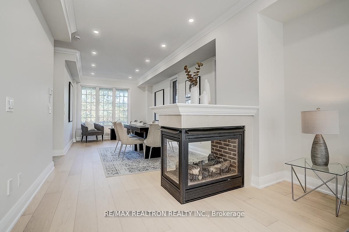 • Modern open-concept layout with 9' ceilings and two-sided gas fireplace.