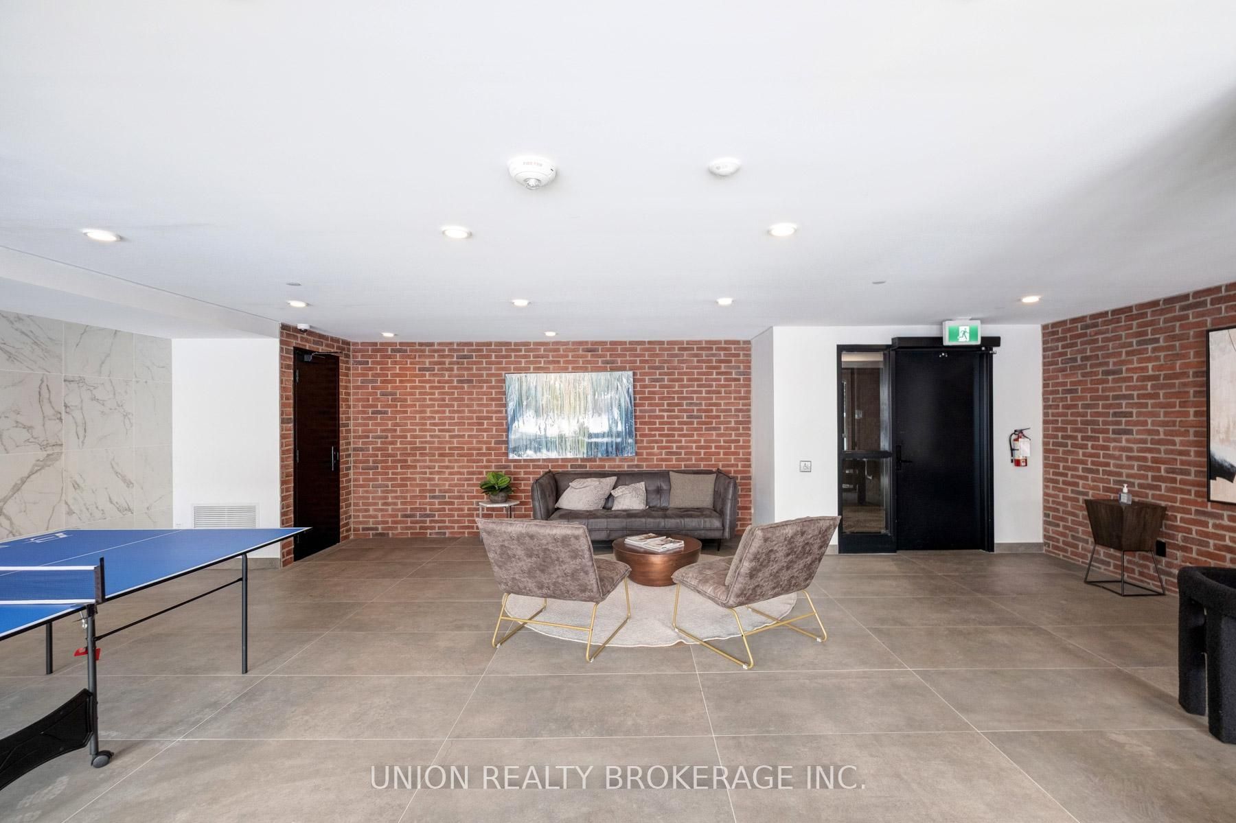 • Building amenities include a fitness center, media room, and BBQ patio.
