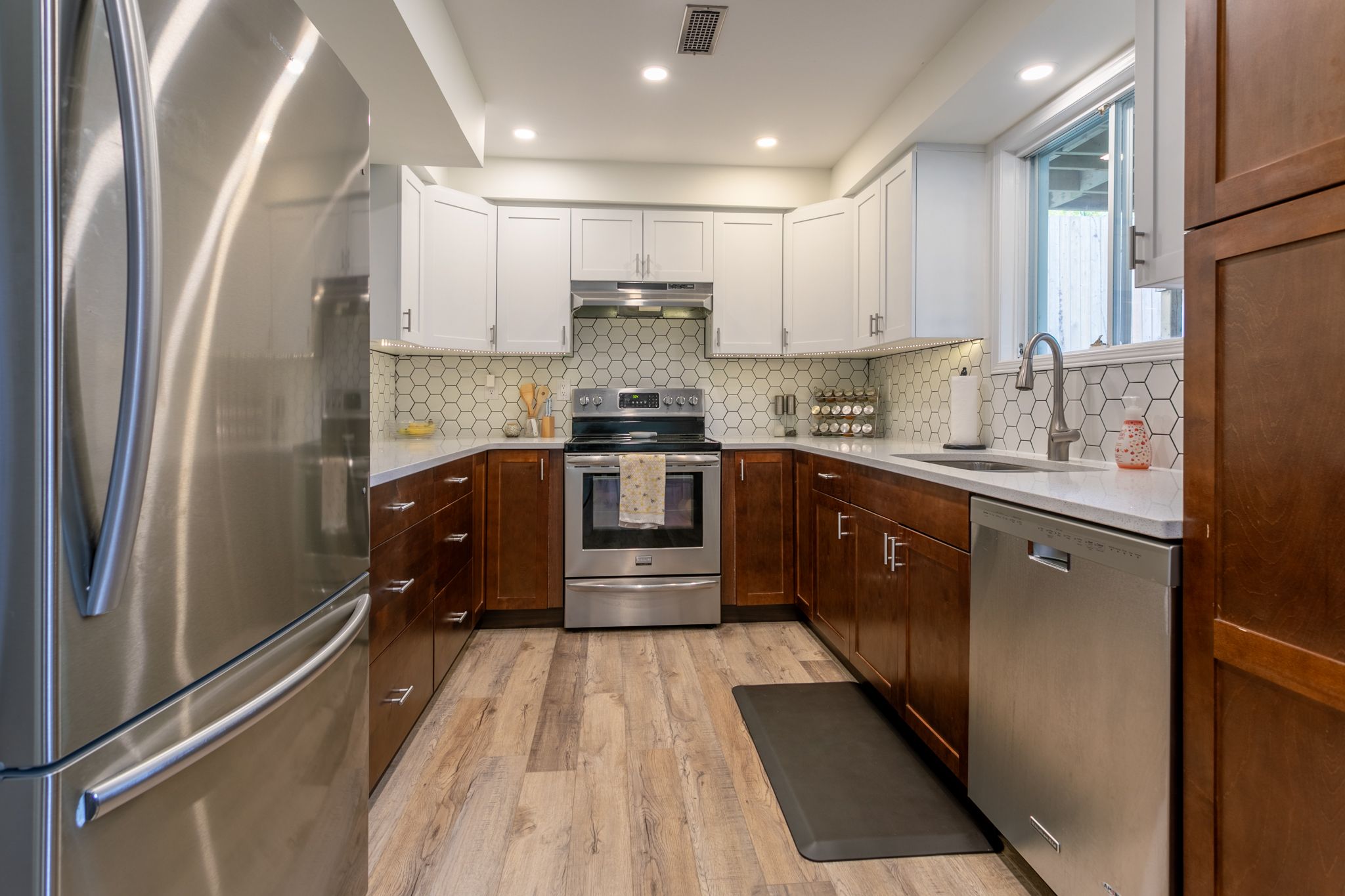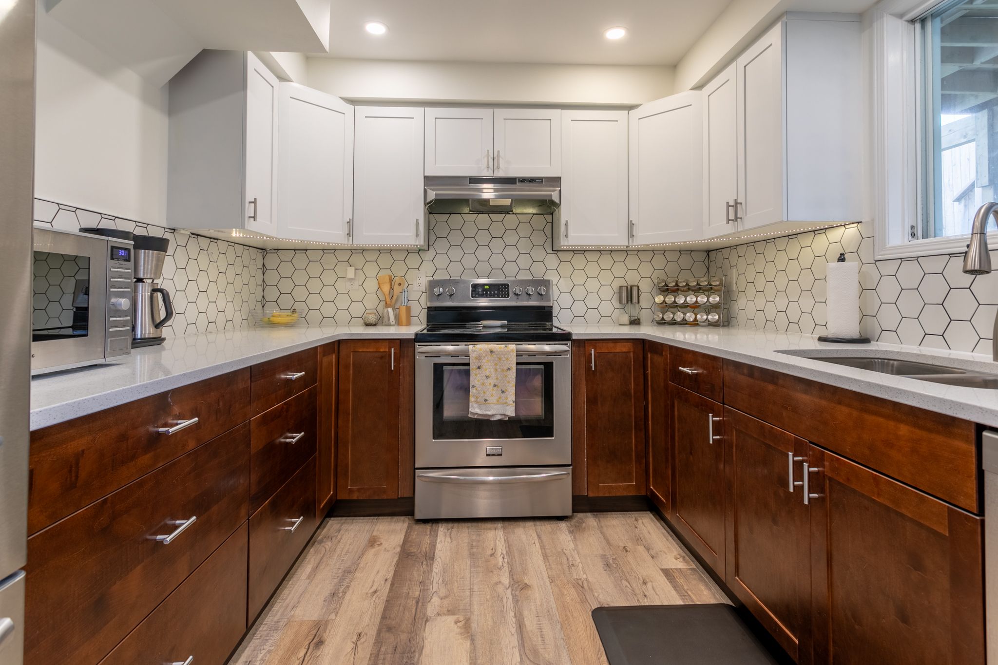 • Modern kitchen with quartz countertops and stainless steel appliances.