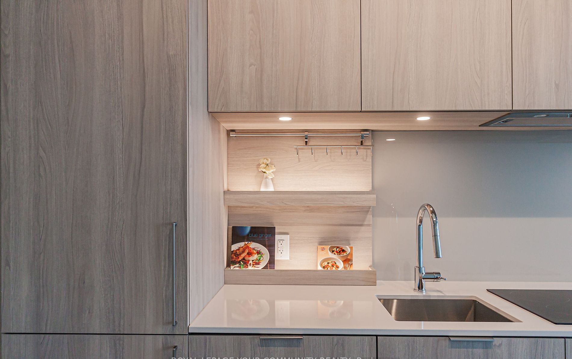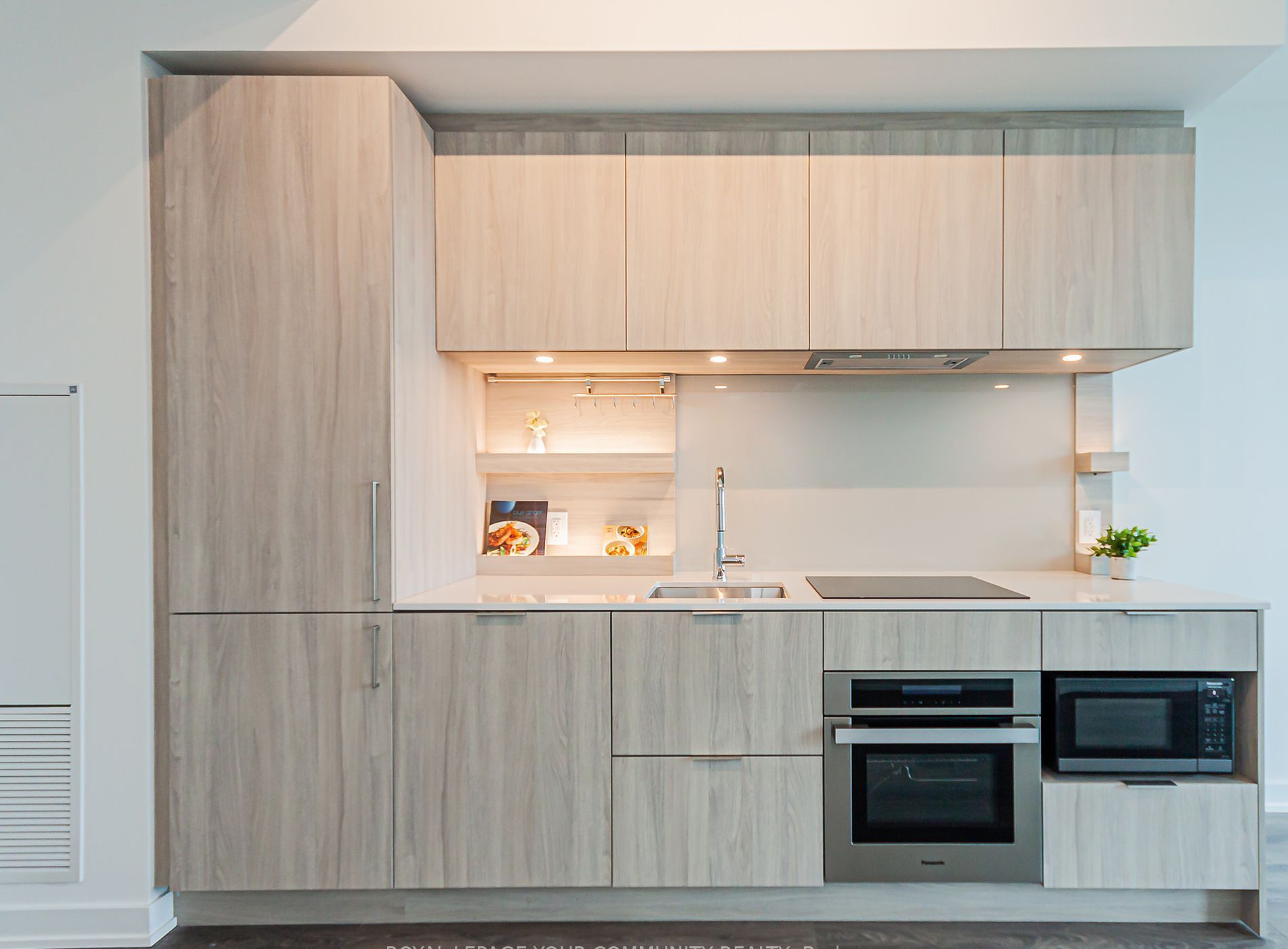 • Luxurious kitchen with modern integrated appliances and under-cabinet lighting.