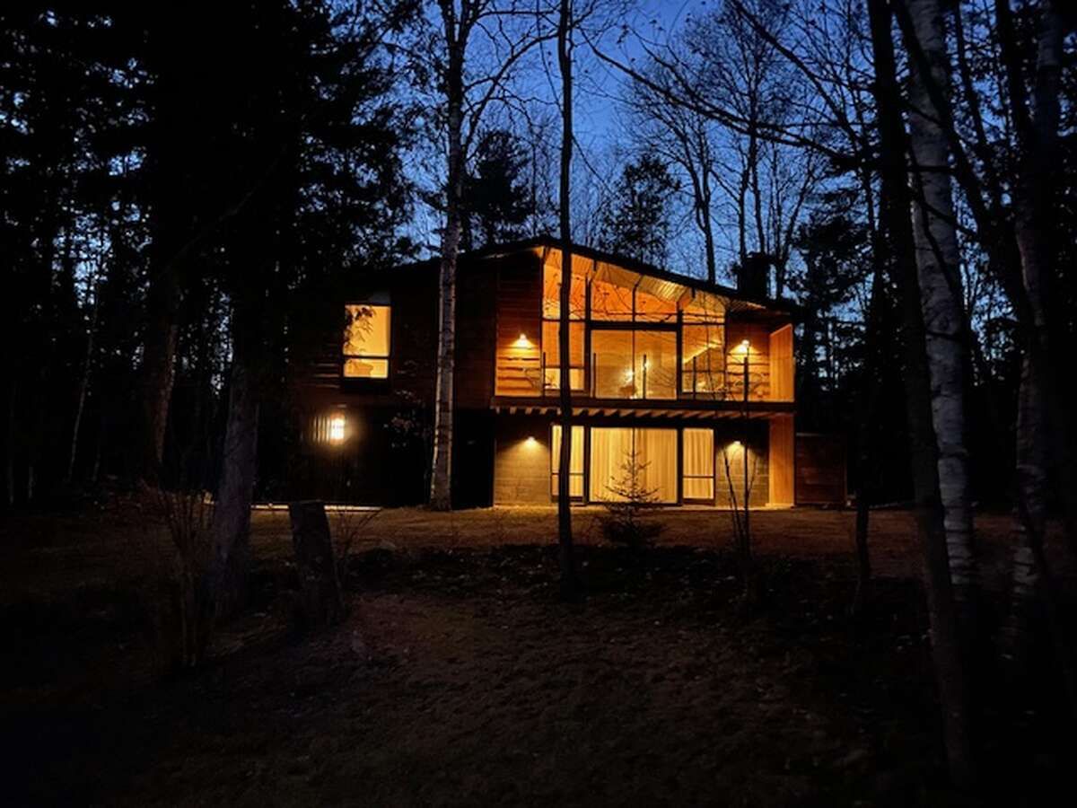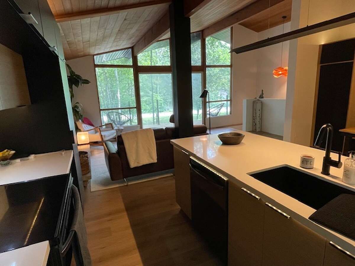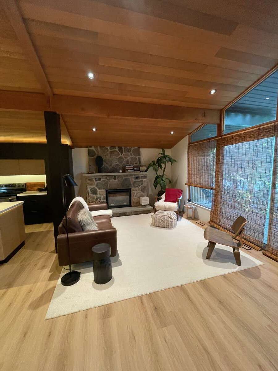 For more info on this property, please click the brochure button. Welcome to this mid-century modern four-season home, just a short walk from the sandy shores of wasaga beach. Nestled on a quiet cul-de-sac and surrounded by mature trees, this 90' x 187' lot offers a peaceful and private setting with easy access to forest trails, biking paths, and outdoor recreation. This property is ideal for those seeking a full-time residence, a tranquil weekend retreat, or a high-end investment opportunity. This fully renovated property blends original charm with thoughtful upgrades. The interior features preserved 1970s cedar ceilings (15ft high), natural materials, and clean architectural lines. Slab on grade construction. No basement. Main level: entry, office, 1 bdrm, 1 full bath with steam shower, and family room with f/p, bar/sink. Second level: kitchen/dining, living room with f/p, 2 bdrms, 1 full bath/tub and laundry. Large windows offering calming views of the trees and natural surroundings. Recent upgrades include a new steel roof (2021), 80,000 btu gas furnace (2025), central a/c (2022), updated plumbing, and full electrical rewire with new panel (2022). Kitchen and dining area feature custom cabinetry, quartz countertops and new appliances incl. Bosch extra quiet dishwasher. Private, fully treed half-acre lot includes a firepit, natural landscaping, and offers a 5 minute walk to the beach via quiet, private pathways. Designed with inspiration from japanese minimalism and scandinavian warmth, the home offers calm, curated spaces throughout, making it a rare opportunity in one of wasaga beach's most desirable locations.