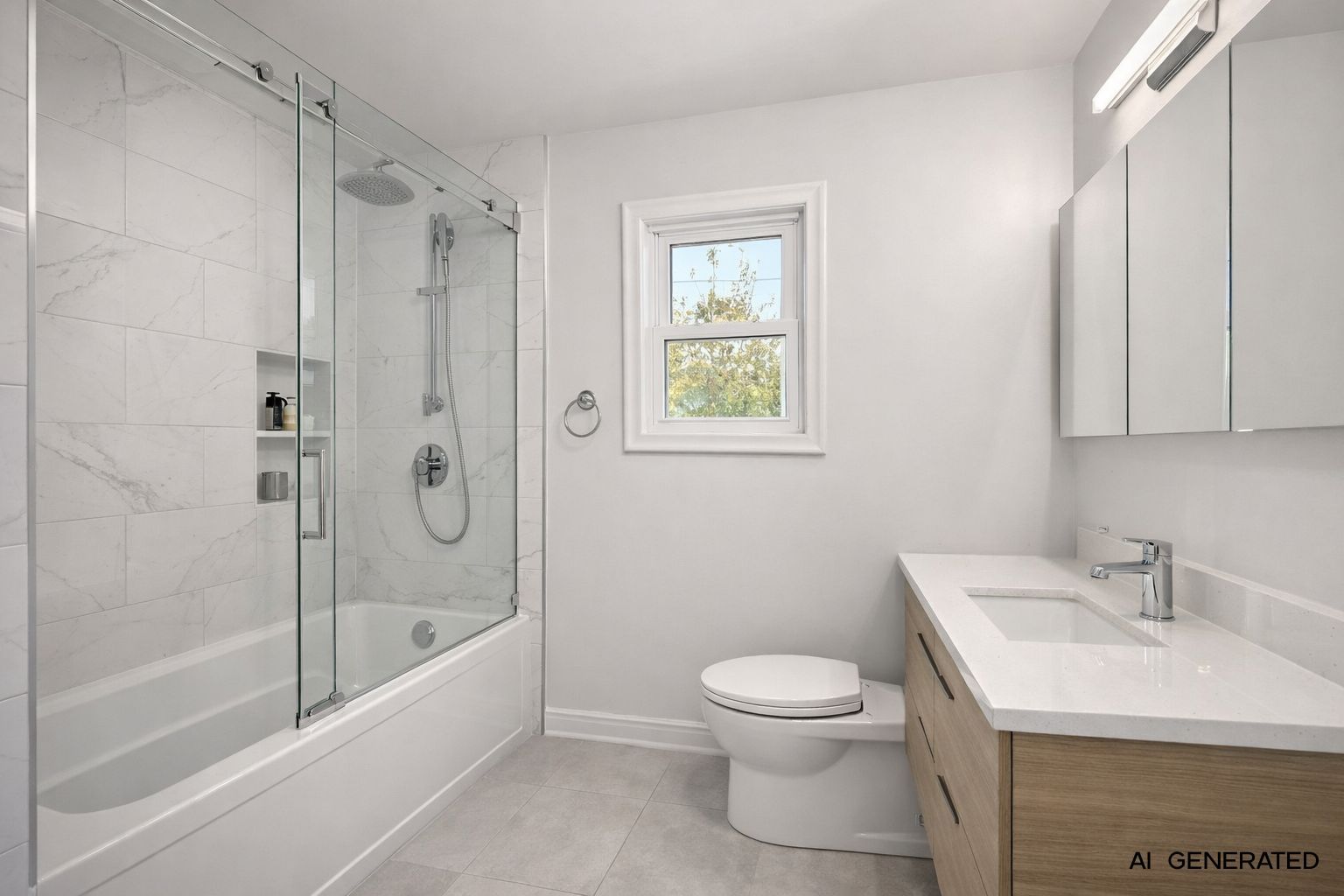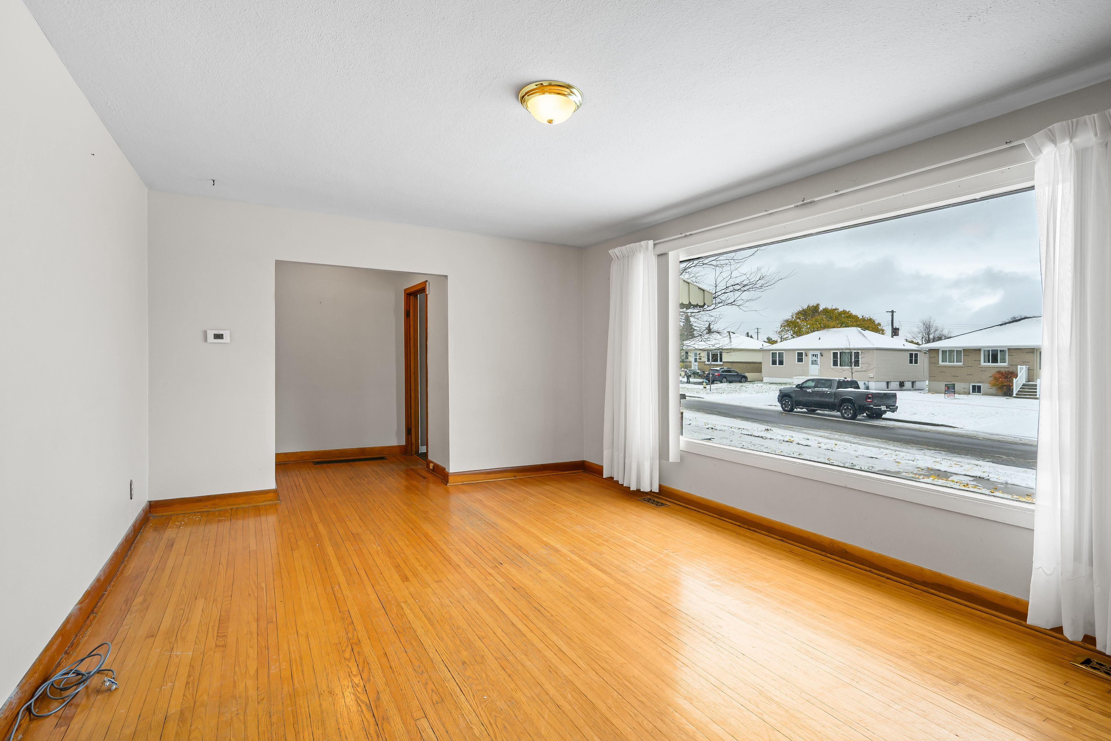• Bright living space with oversized window and electric fireplace for comfort.