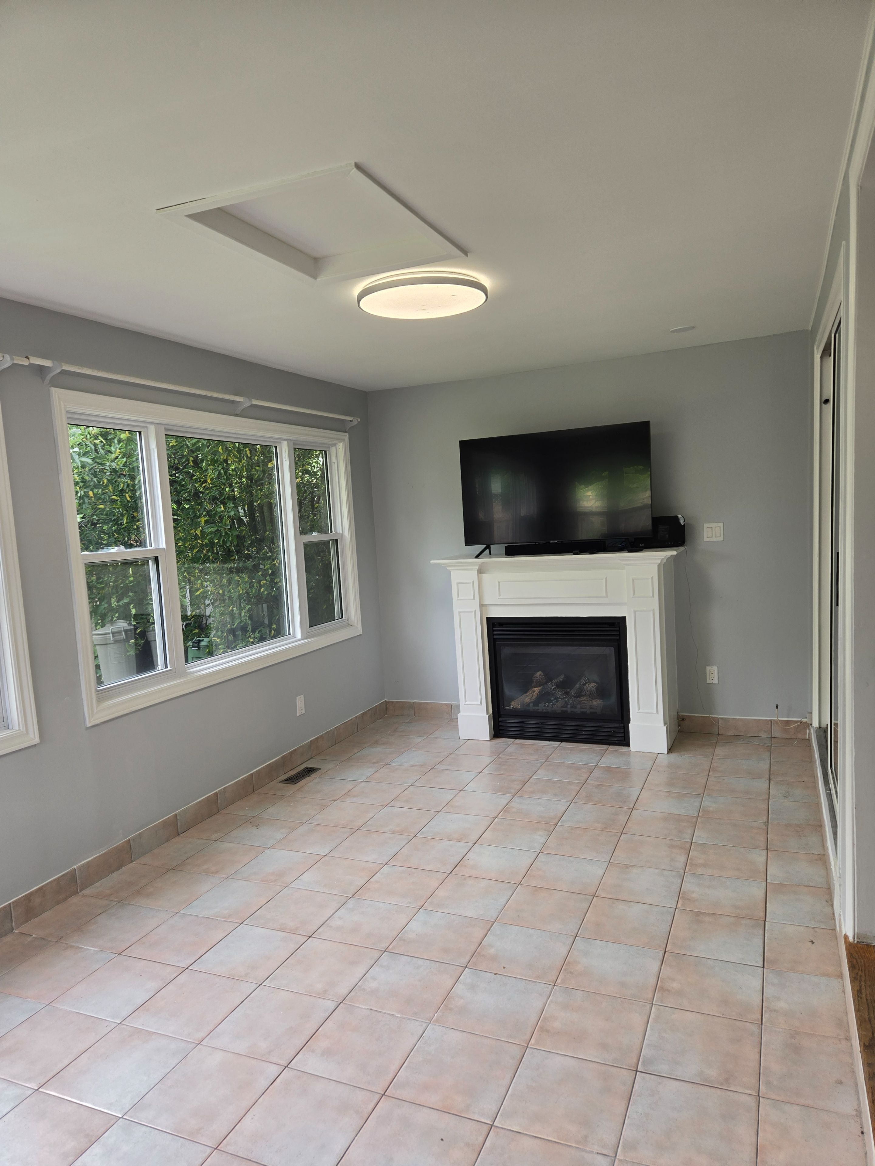 • Bright family room extension with large windows and gas fireplace.