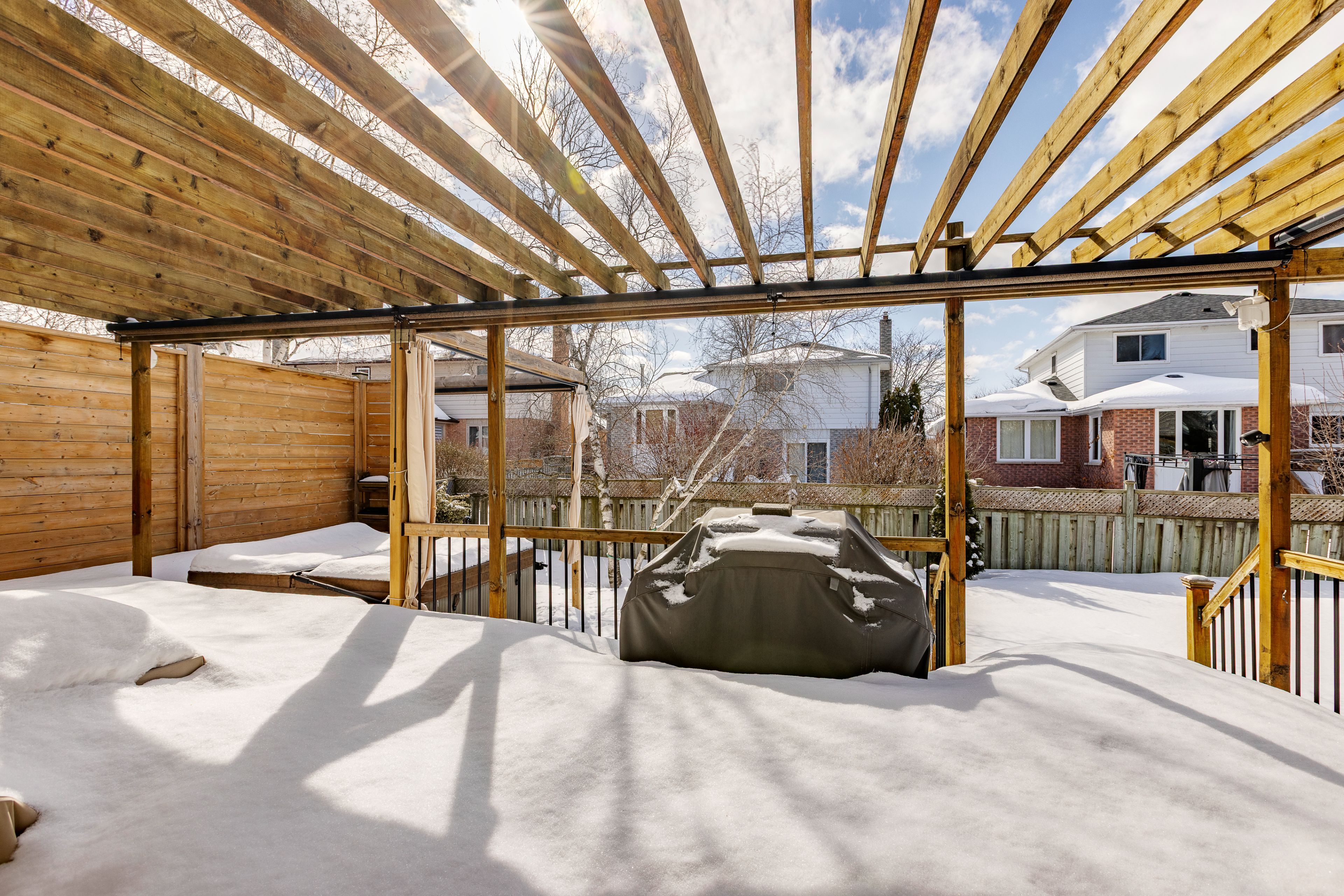 • Dream backyard with a large deck, pergola, privacy wall, and hot tub.