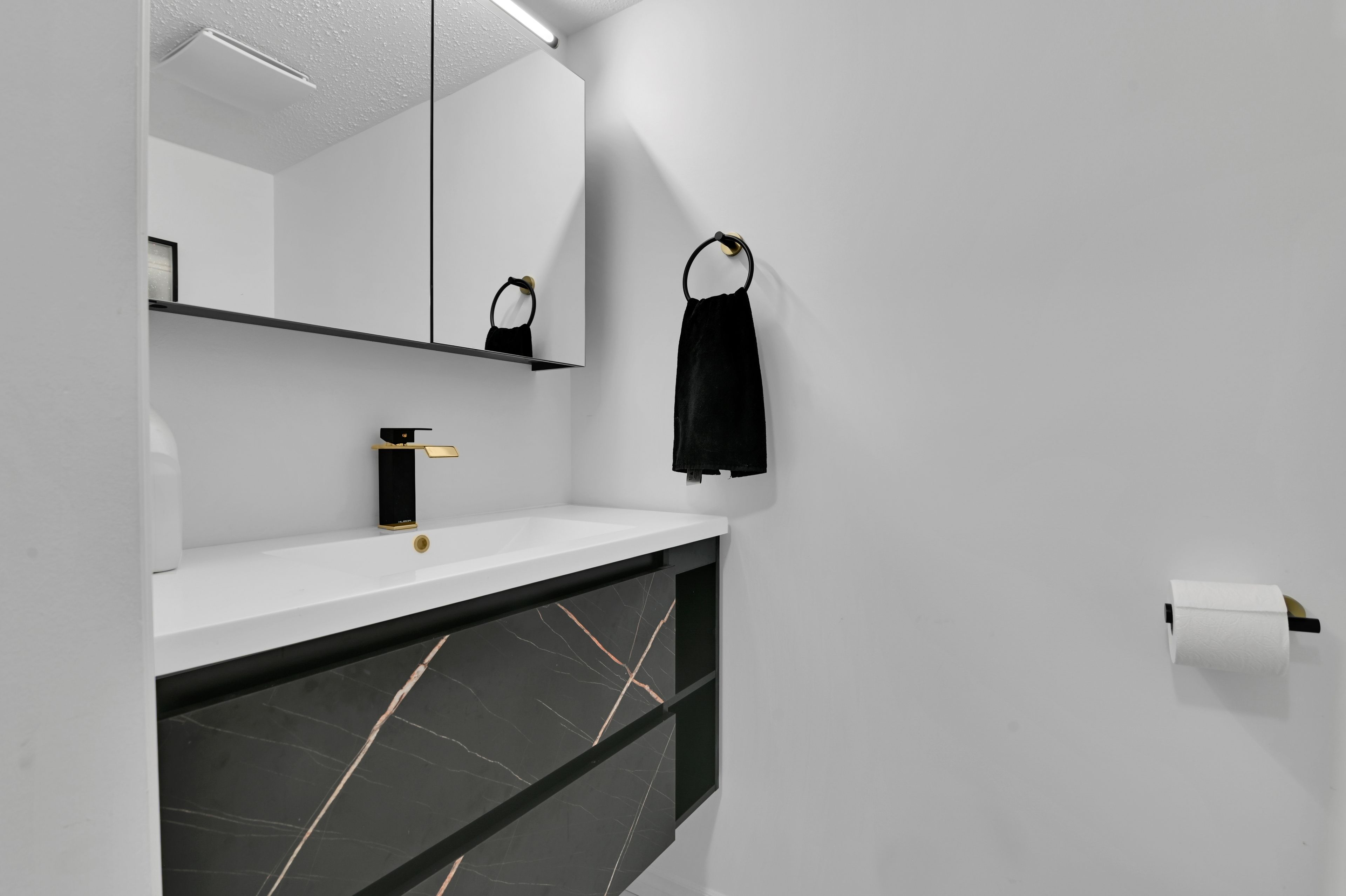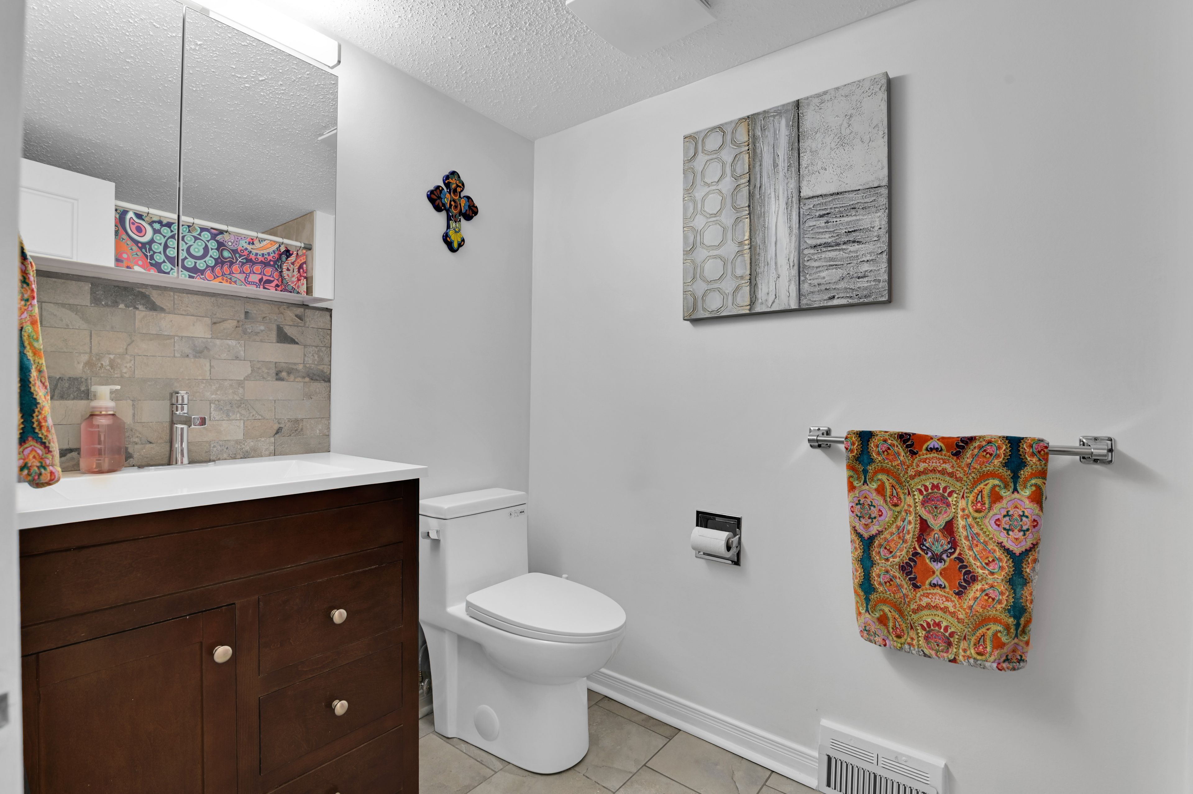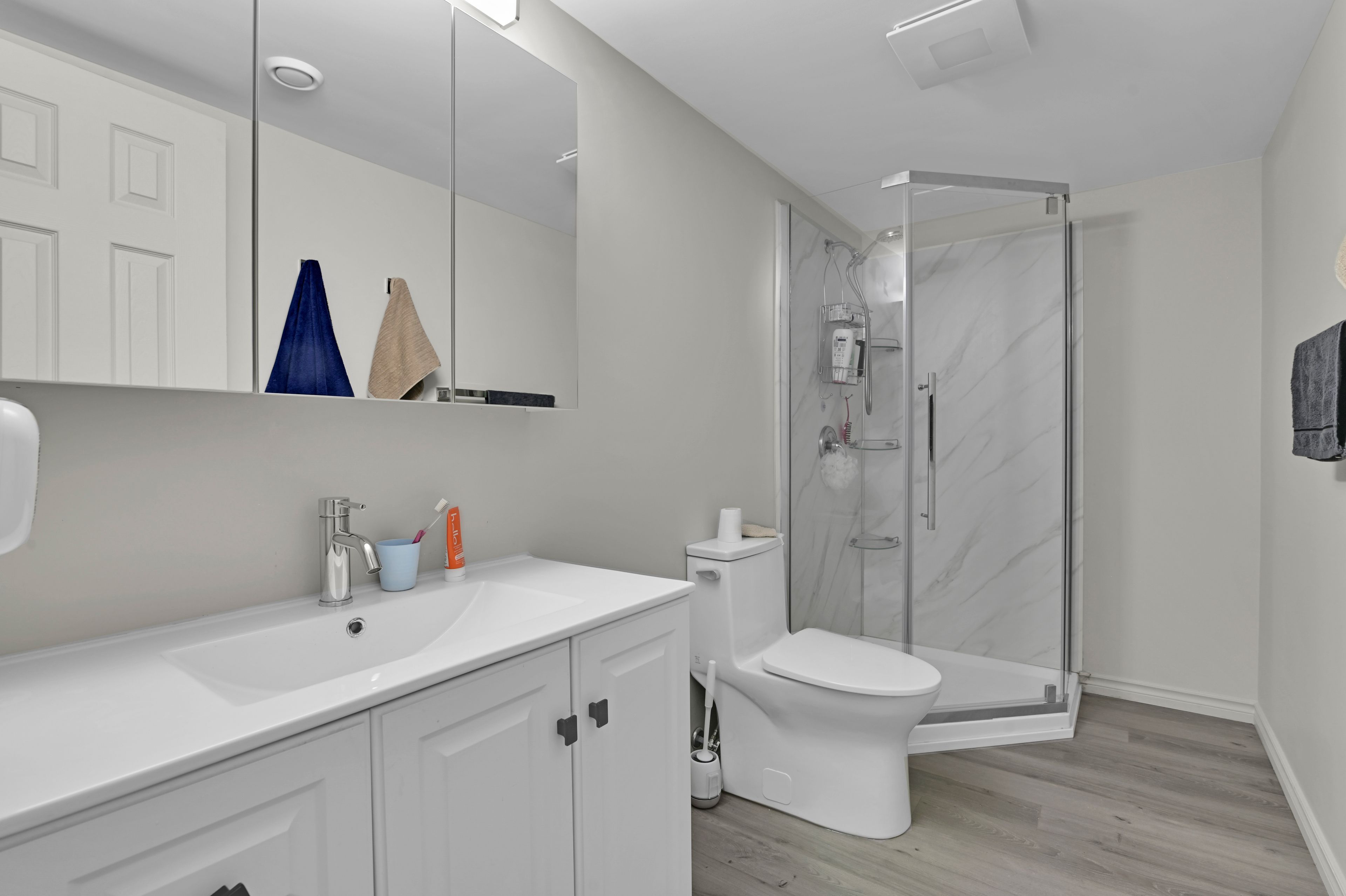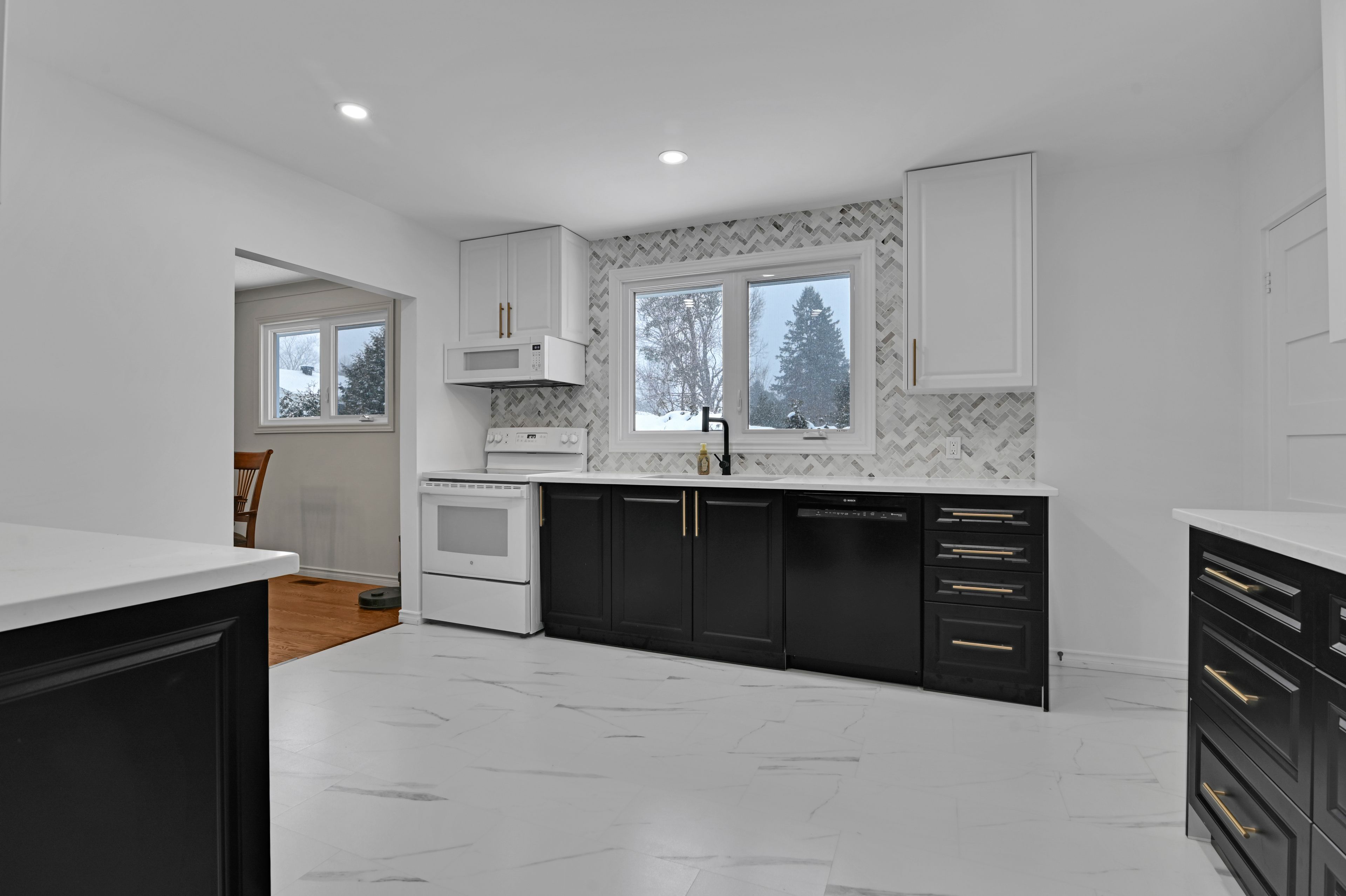 • Three updated bedrooms with a modern kitchen featuring quartz counters and new appliances.