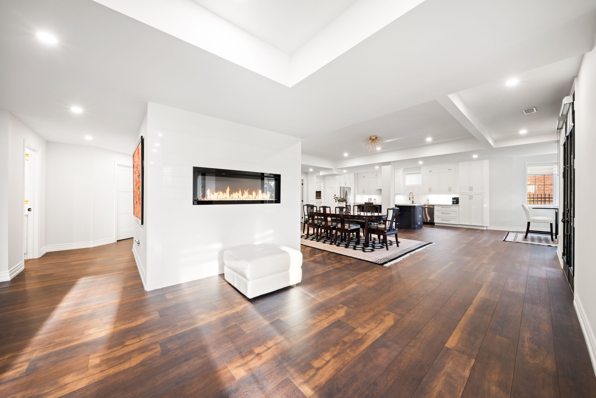 Located in the heart of king city, this beautiful bungaloft offers more than 6,900 square feet of finished living space in a community prized for its parks, trails, excellent schools, and quick access to the king city go station. The home is introduced by a stone-and-stucco façade, a three-car garage, and landscaped grounds with a terrace and rear patio overlooking the ravine. Inside, soaring ceilings, hardwood floors, and detailed millwork set an elegant tone. The front foyer rises two storeys, leading to a series of principal rooms defined by coffered ceilings: a paneled office, a formal living and dining room, and a family room anchored by a gas fireplace. At the centre of the main level, the kitchen is fitted with dark-stained cabinetry, quartz counters, and a full suite of wolf and sub-zero appliances. The adjoining breakfast area opens directly to the terrace. A main-floor primary suite with a spa-like ensuite and walk-in closet provides a private retreat, while a second bedroom with its own ensuite adds flexibility for family or guests. An elevator connects all three levels. The upper floor includes two additional bedrooms, a full bath, and a den well suited for children, extended family, or a separate study. The fully finished lower level is above grade, with oversized windows and french doors leading to the rear patio. This home includes total of 4 + 2 bed and 4 + 2 bath. Designed as a complete secondary living area, it includes a full kitchen with quartz counters and samsung appliances, a dining area, a large recreation room with fireplaces, two bedrooms, and additional baths. This thoughtful layout makes the property especially accommodating for multi-generational living. Every detail of this residence reflects quality and enduring design, offering a rare opportunity in one of king city's most desirable settings.