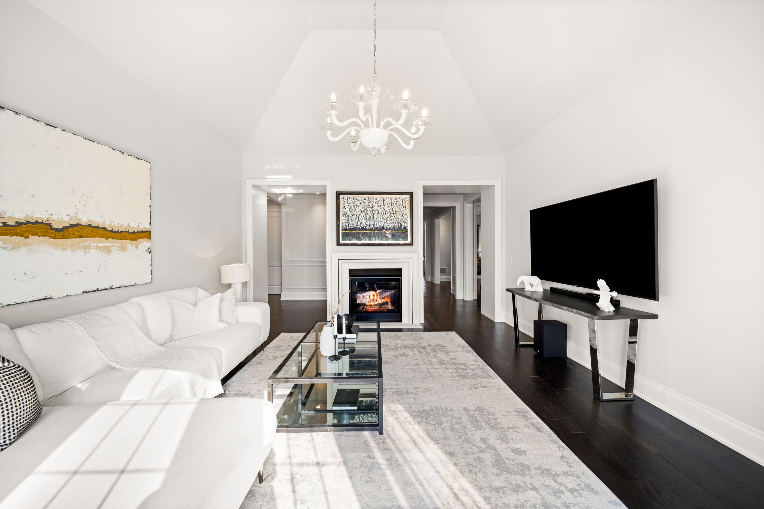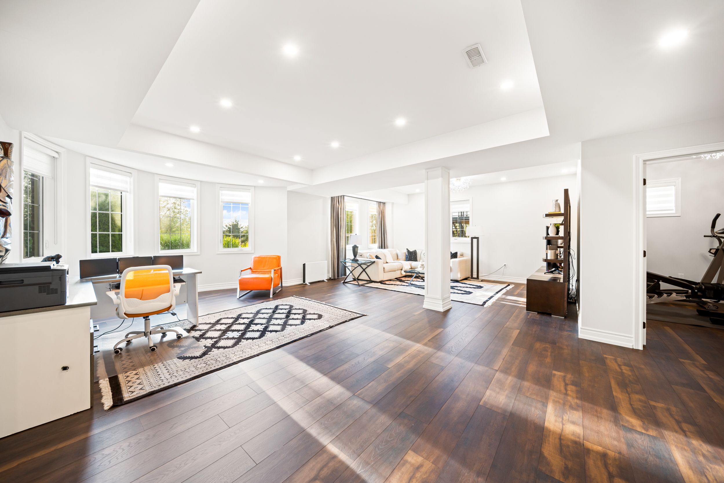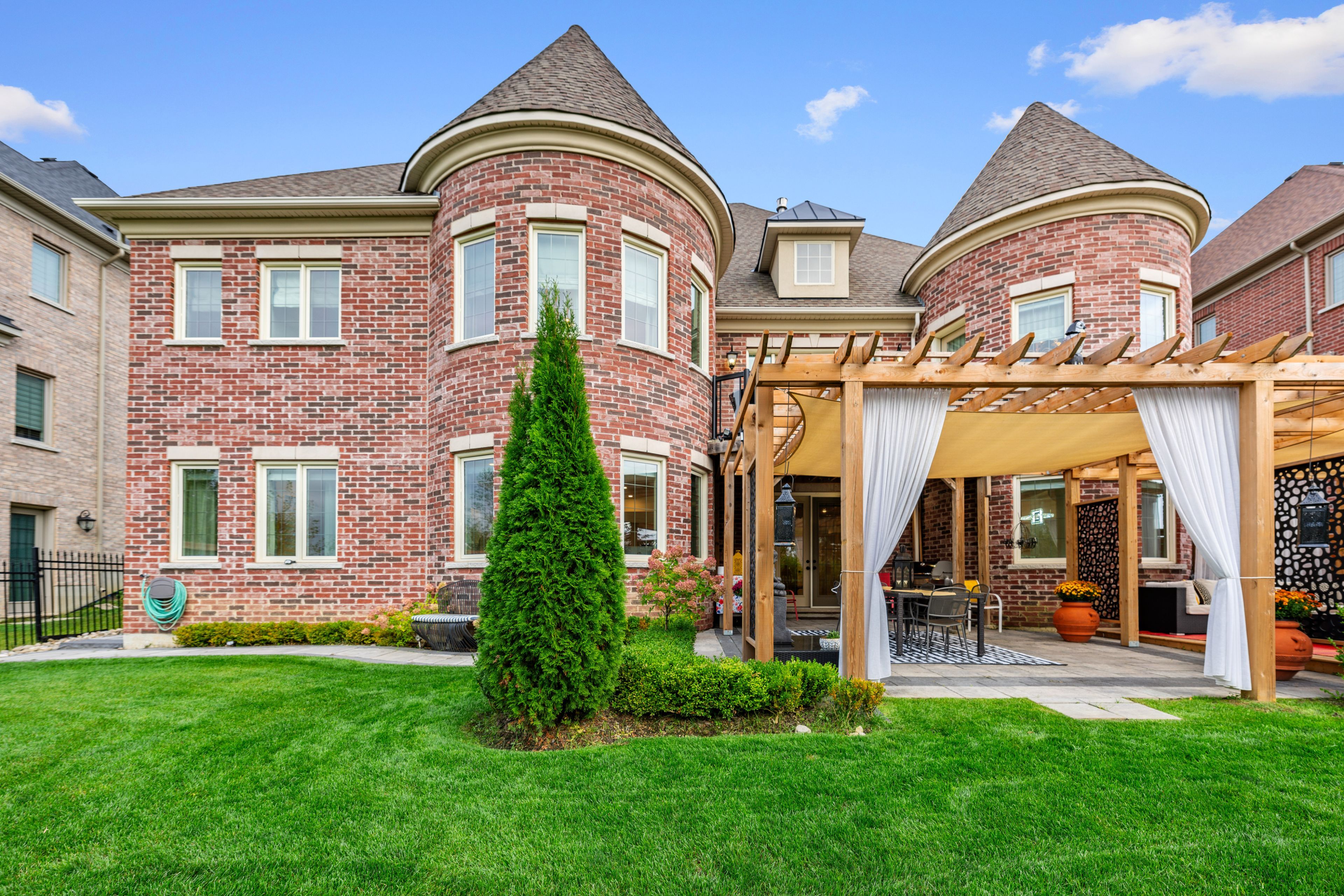 Located in the heart of king city, this beautiful bungaloft offers more than 6,900 square feet of finished living space in a community prized for its parks, trails, excellent schools, and quick access to the king city go station. The home is introduced by a stone-and-stucco facade, a three-car garage, and landscaped grounds with a terrace and rear patio overlooking the ravine. Inside, soaring ceilings, hardwood floors, and detailed millwork set an elegant tone. The front foyer rises two storeys, leading to a series of principal rooms defined by coffered ceilings: a paneled office, a formal living and dining room, and a family room anchored by a gas fireplace. At the centre of the main level, the kitchen is fitted with dark-stained cabinetry, quartz counters, and a full suite of wolf and sub-zero appliances. The adjoining breakfast area opens directly to the terrace. A main-floor primary suite with a spa-like ensuite and walk-in closet provides a private retreat, while a second bedroom with its own ensuite adds flexibility for family or guests. An elevator connects all three levels. The upper floor includes two additional bedrooms, a full bath, and a den well suited for children, extended family, or a separate study. The fully finished lower level is above grade, with oversized windows and french doors leading to the rear patio. This home includes total of 4 + 2 bed and 4 + 2 bath. Designed as a complete secondary living area, it includes a full kitchen with quartz counters and samsung appliances, a dining area, a large recreation room with fireplaces, two bedrooms, and additional baths. This thoughtful layout makes the property especially accommodating for multi-generational living. Every detail of this residence reflects quality and enduring design, offering a rare opportunity in one of king city's most desirable settings.