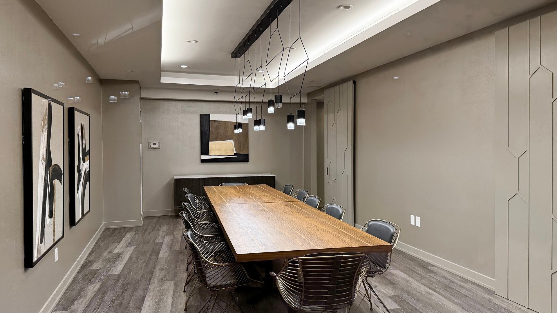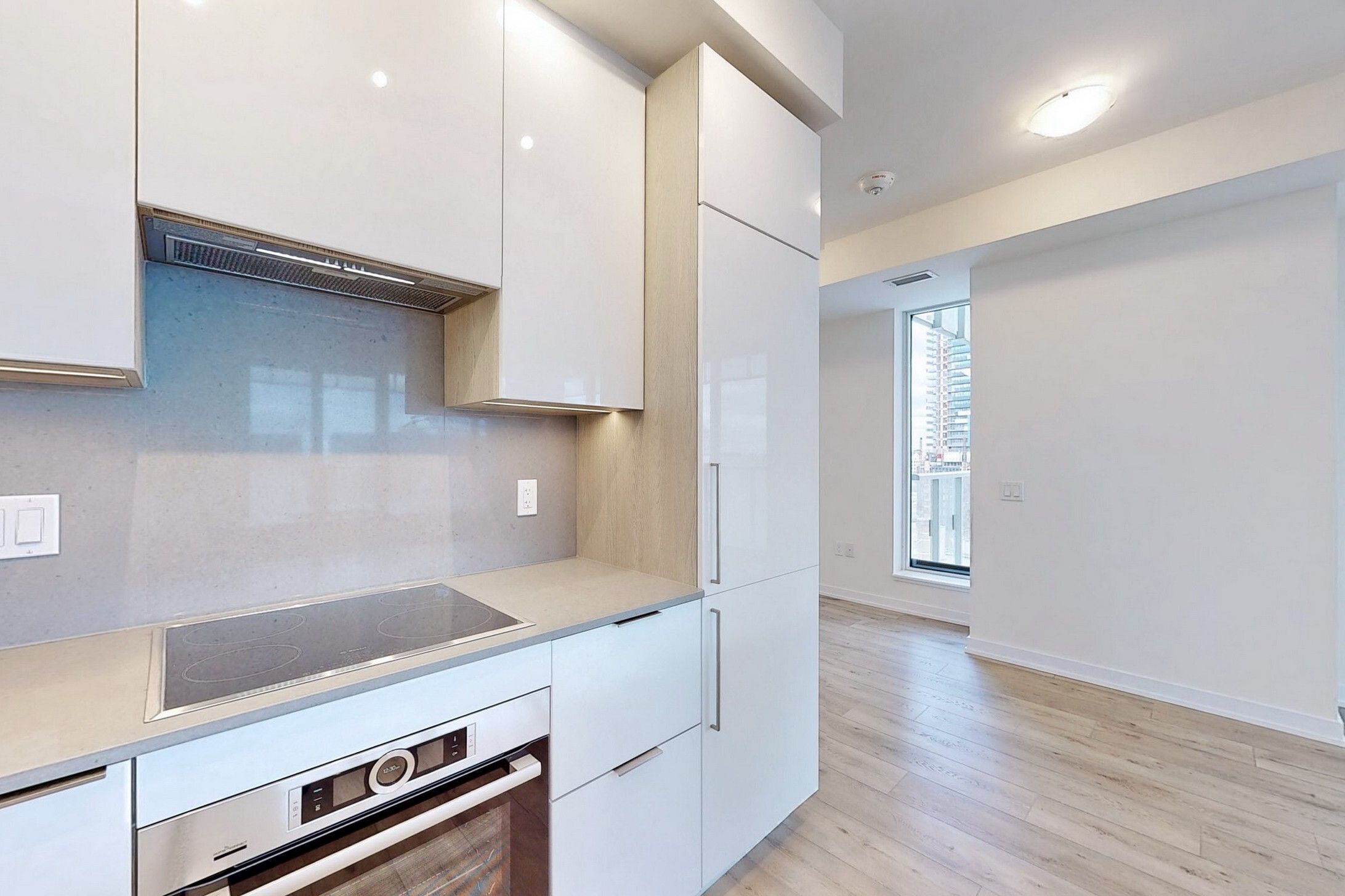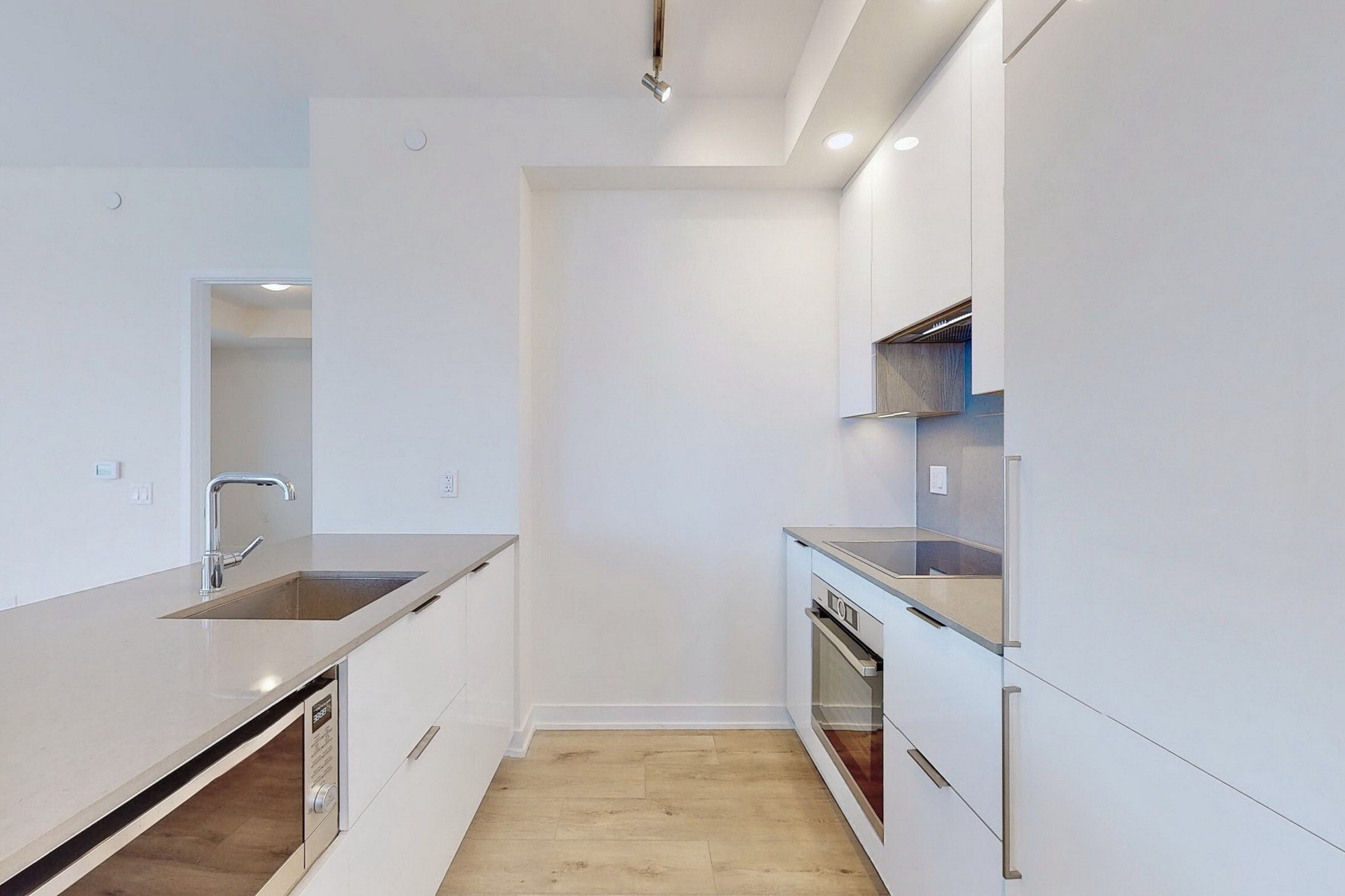 • Contemporary kitchen with built-in appliances and ample storage.