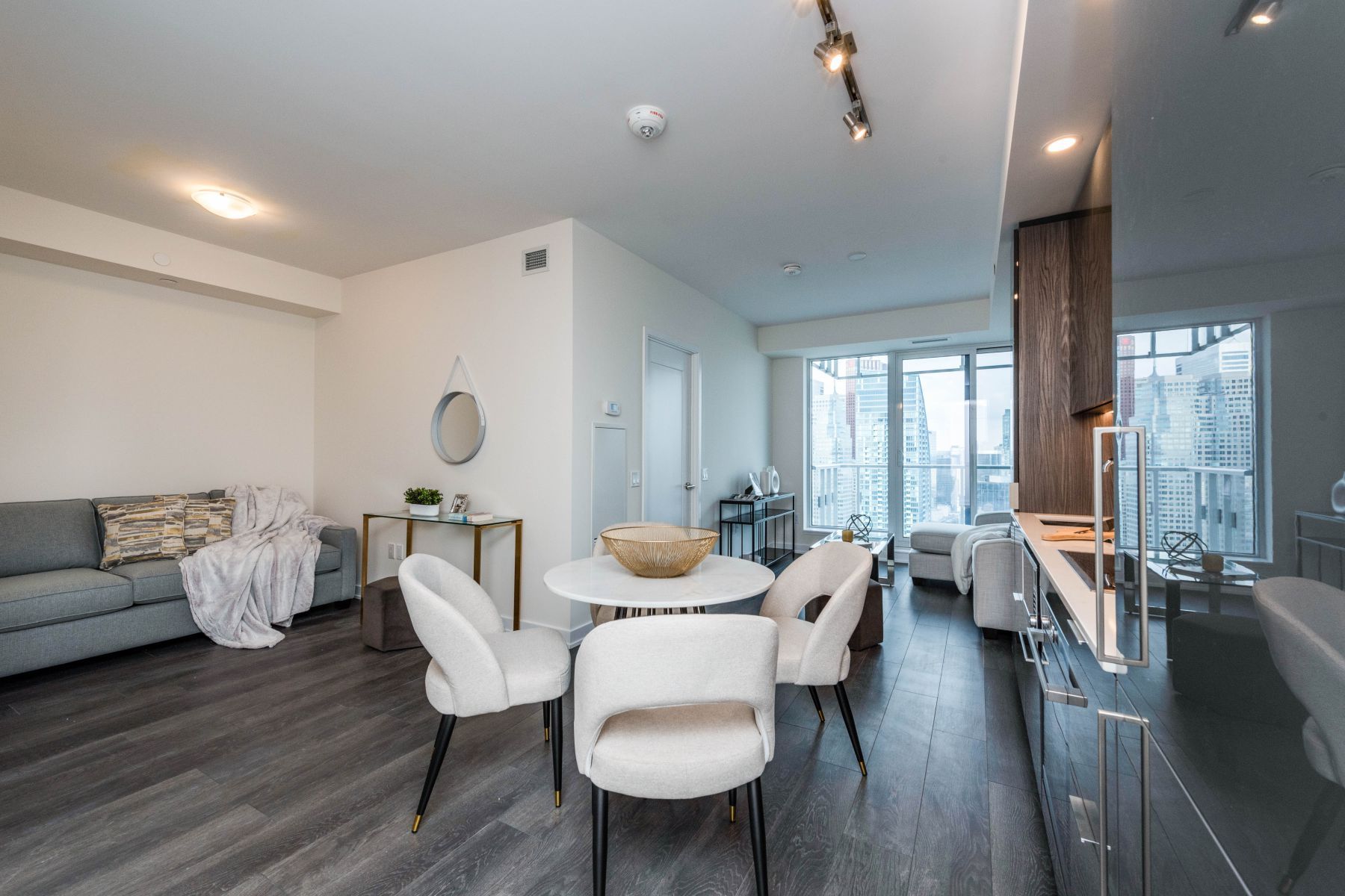 Fully furnished beautiful luxury condo by pinnacle one yonge. Beautiful skyline with down town views, breathtaking views at night. Steps to lake, beaches, downtown, shopping, transit, grocery. Designed & staged by best interior designer, comes with luxury modern & contemporary finishes and top of the line furniture, linens and decorations. Steps to harbour front, u of t, lake, union station, & downtown. Den is fully equipped with a queen size sofa bed. Den can also be used as office space.