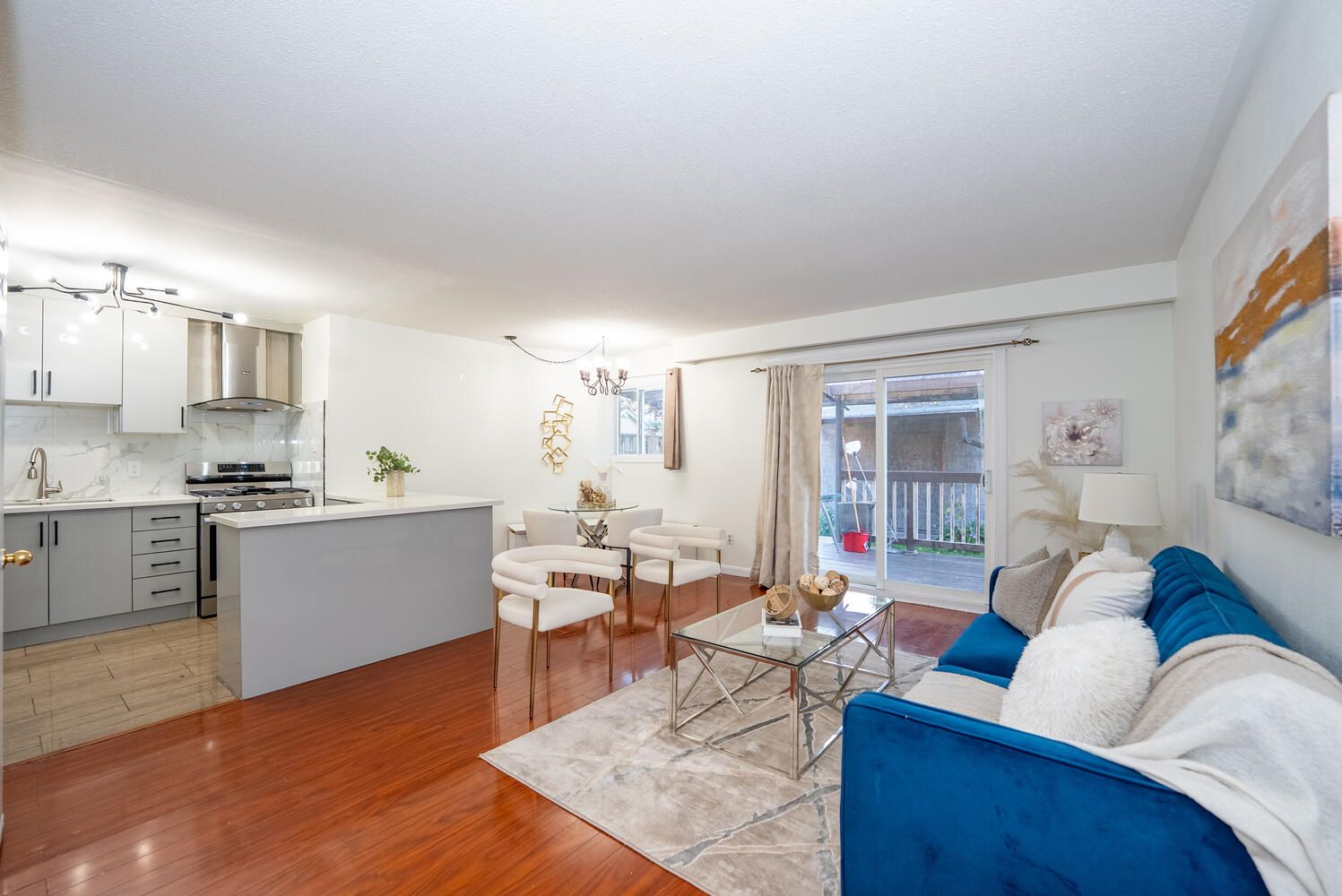 • Open-concept living, dining, and kitchen area leading to a covered deck.