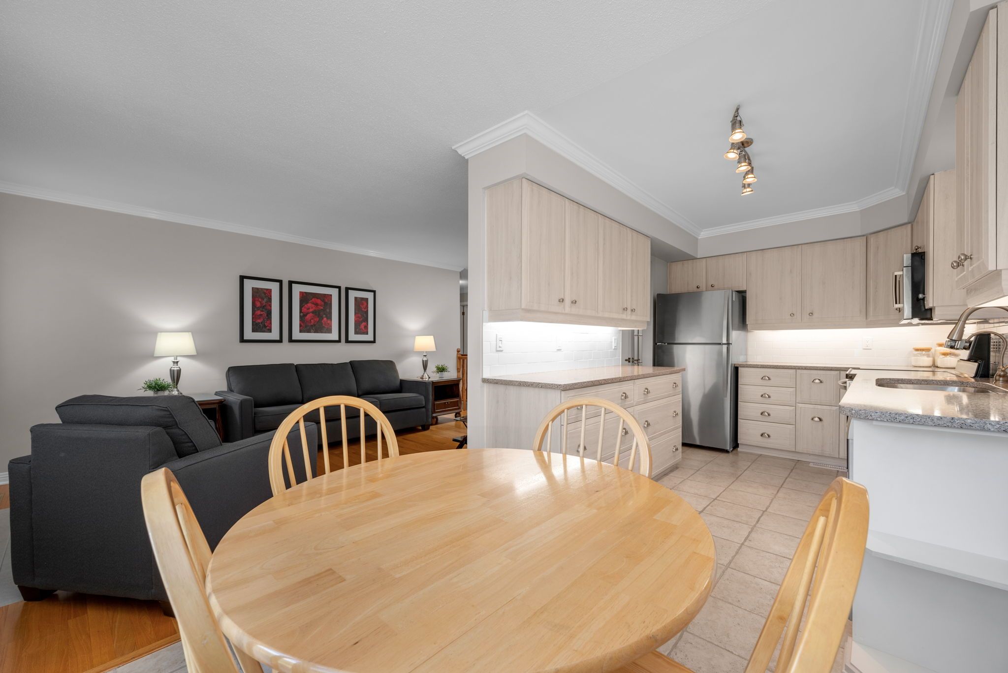 • Generous eat-in kitchen featuring stone countertops and stainless steel appliances.