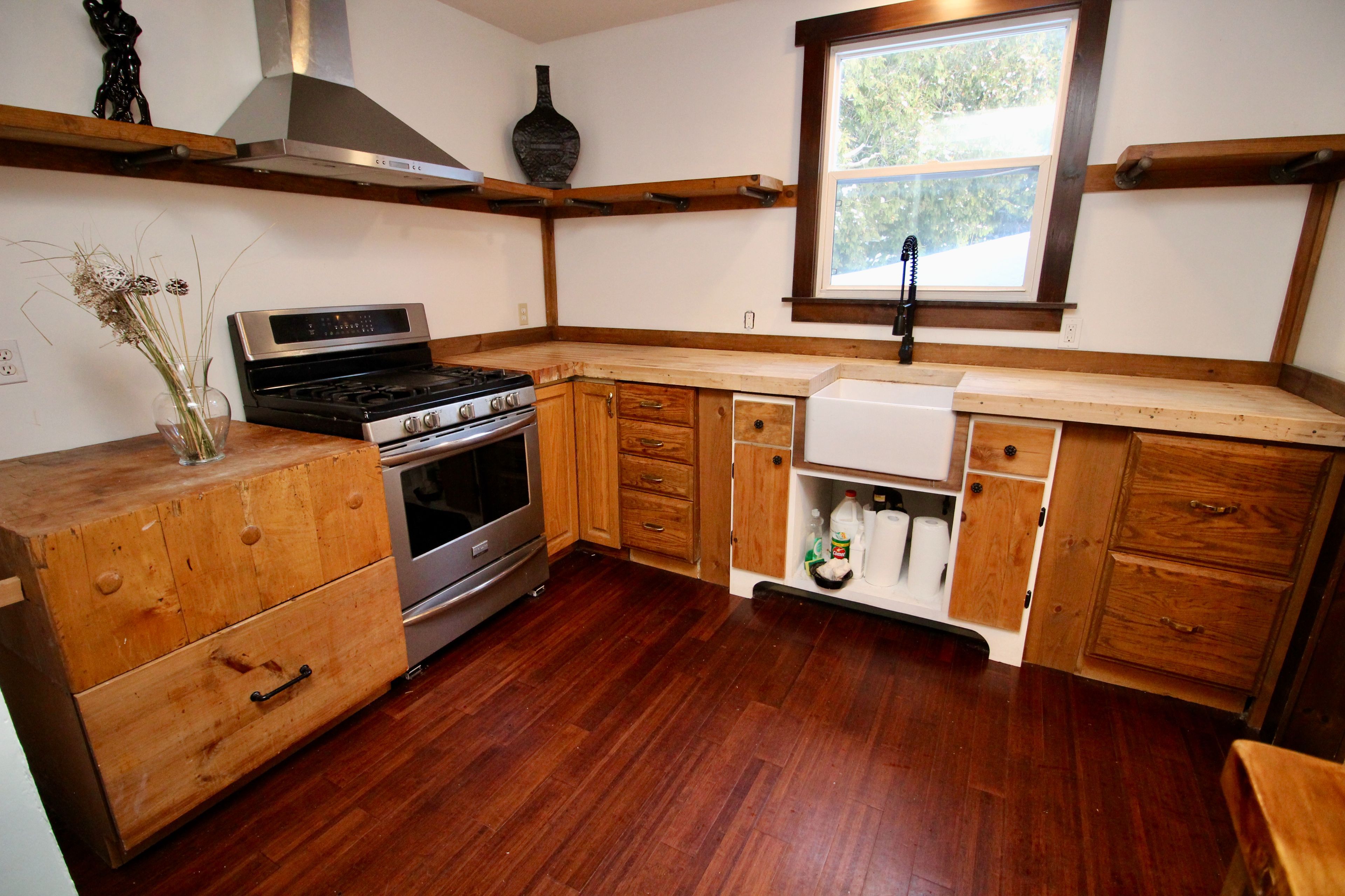 • Unique rustic kitchen counters made from an old bowling alley.