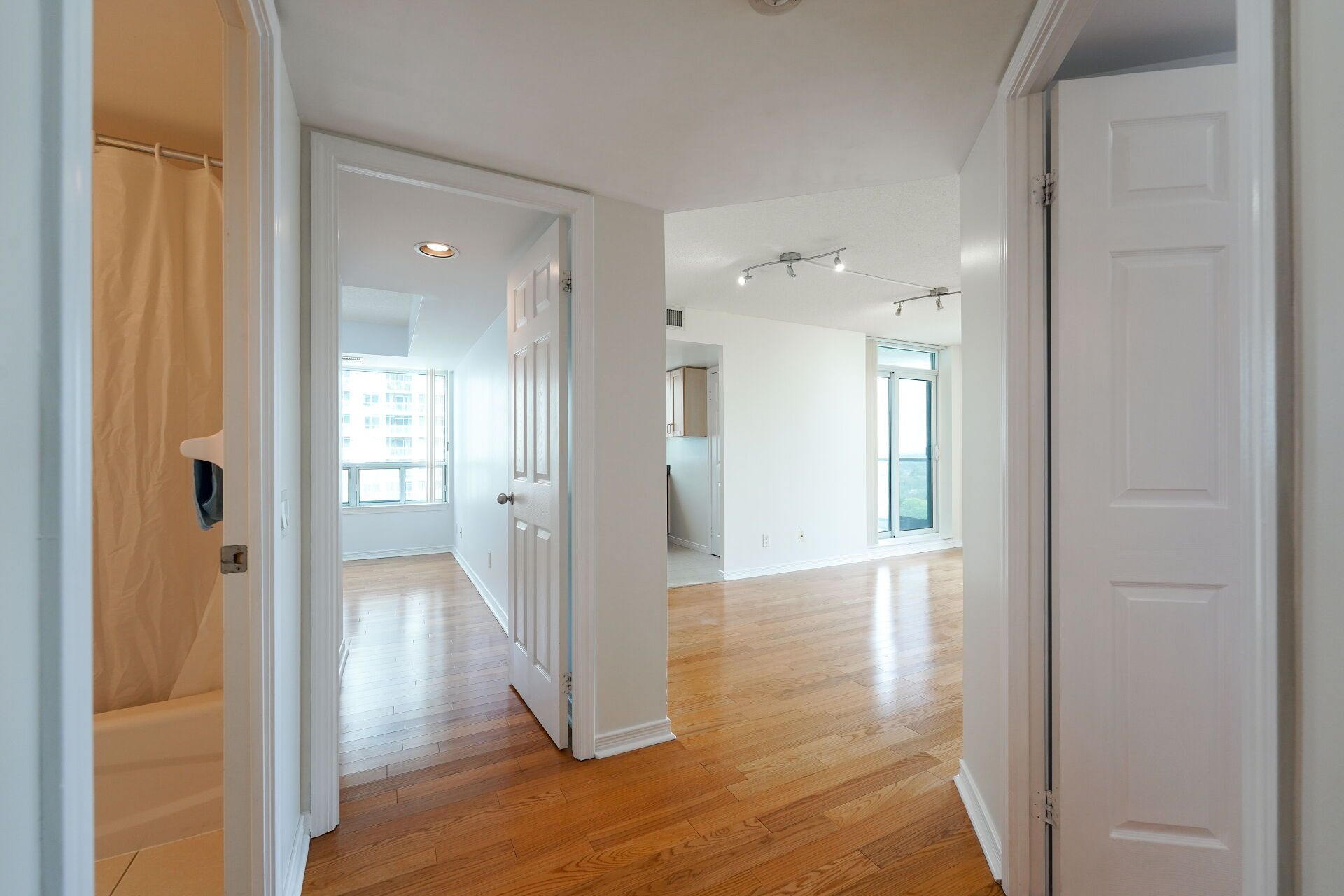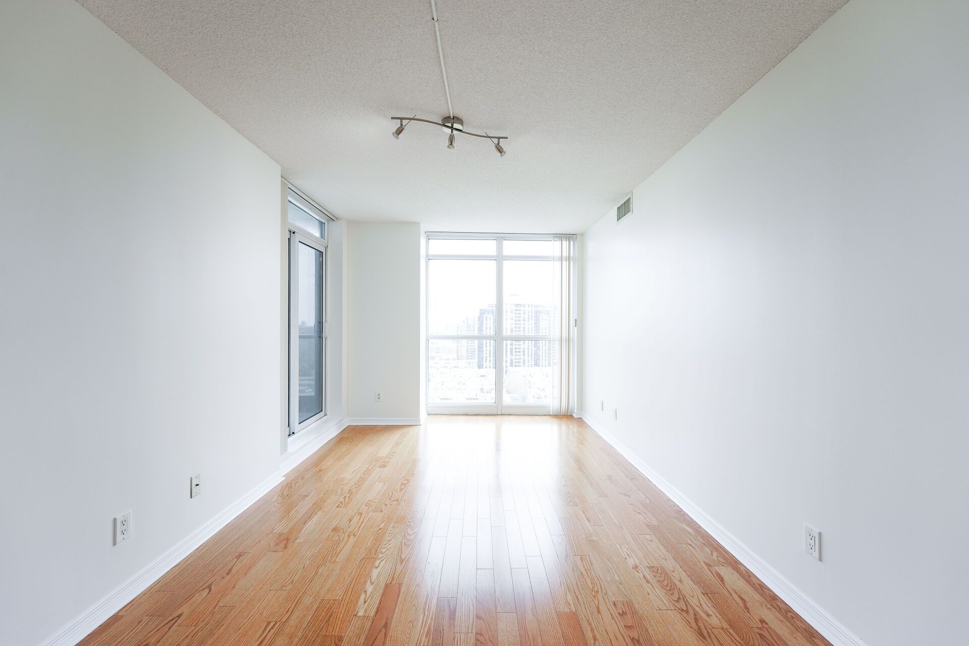 Immaculate 2 bedrooms, 2 bathroom suite in the spectrum by menkes. This gorgeous bright 863 sq. Ft unit features a split bedroom layout, 2 full baths, beautiful hardwood floors throughout, freshly painted, floor to ceiling windows and balcony with unobstructed east view of the city and overlooking the park. No pets, no smokers.