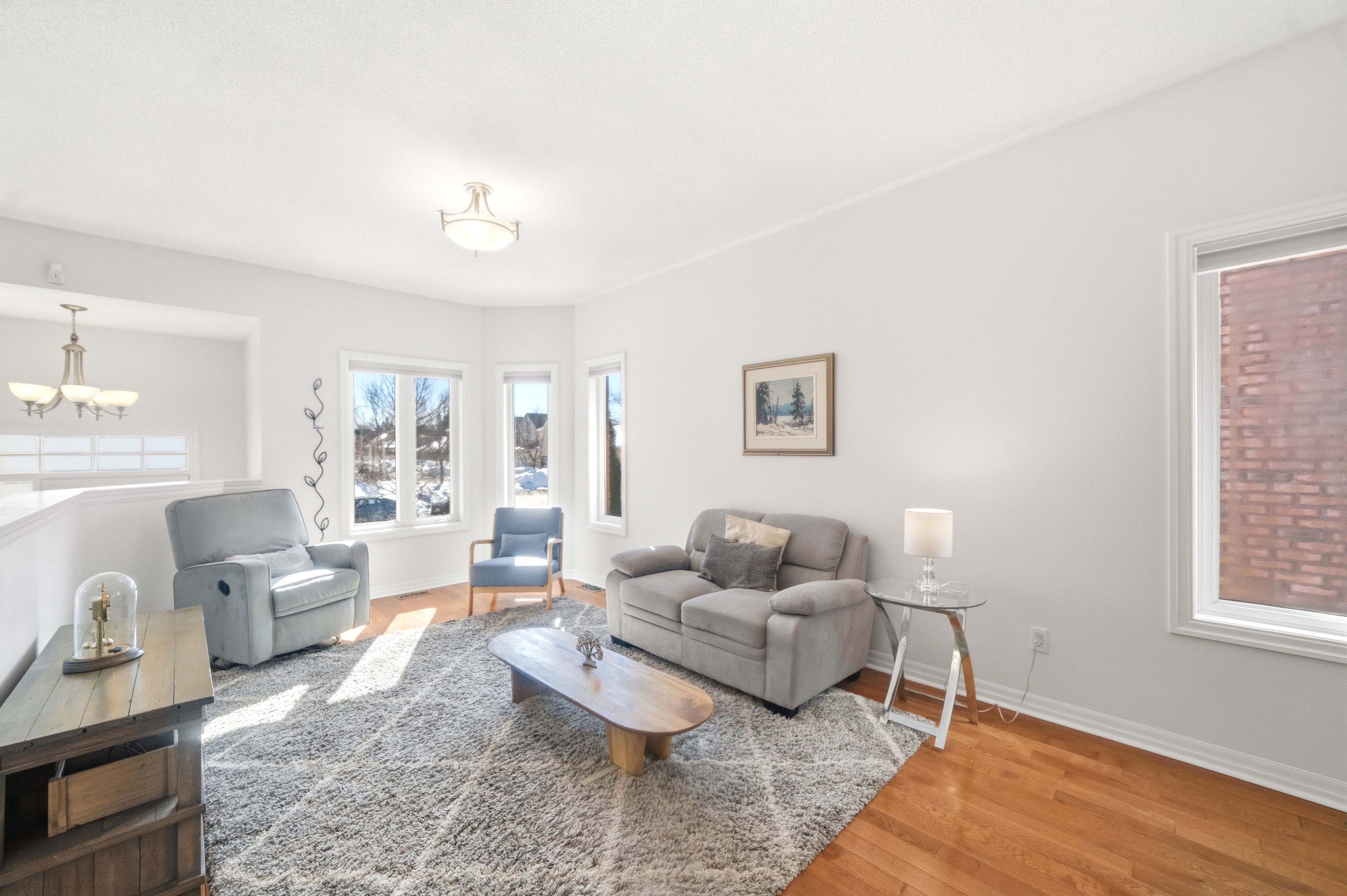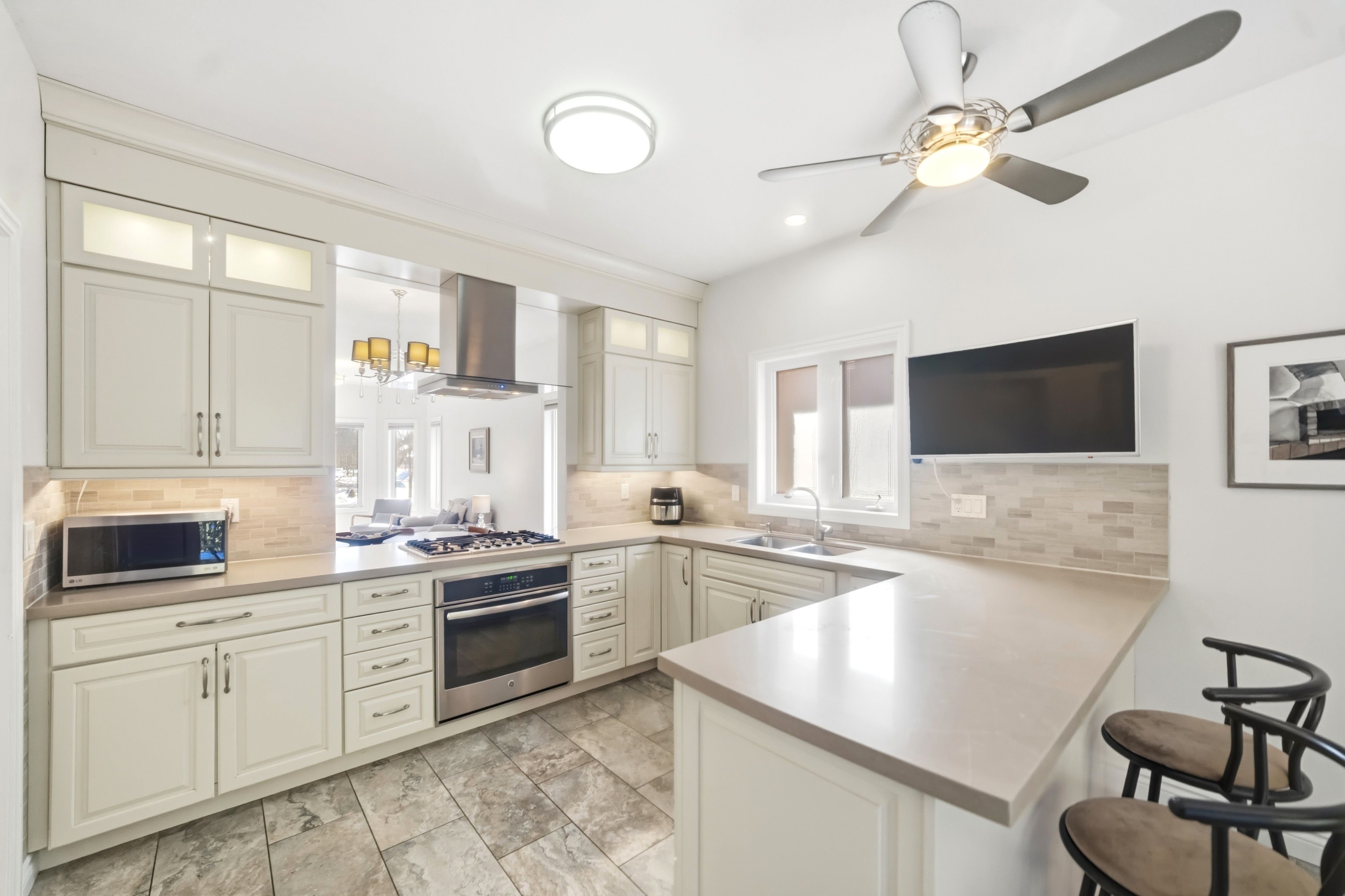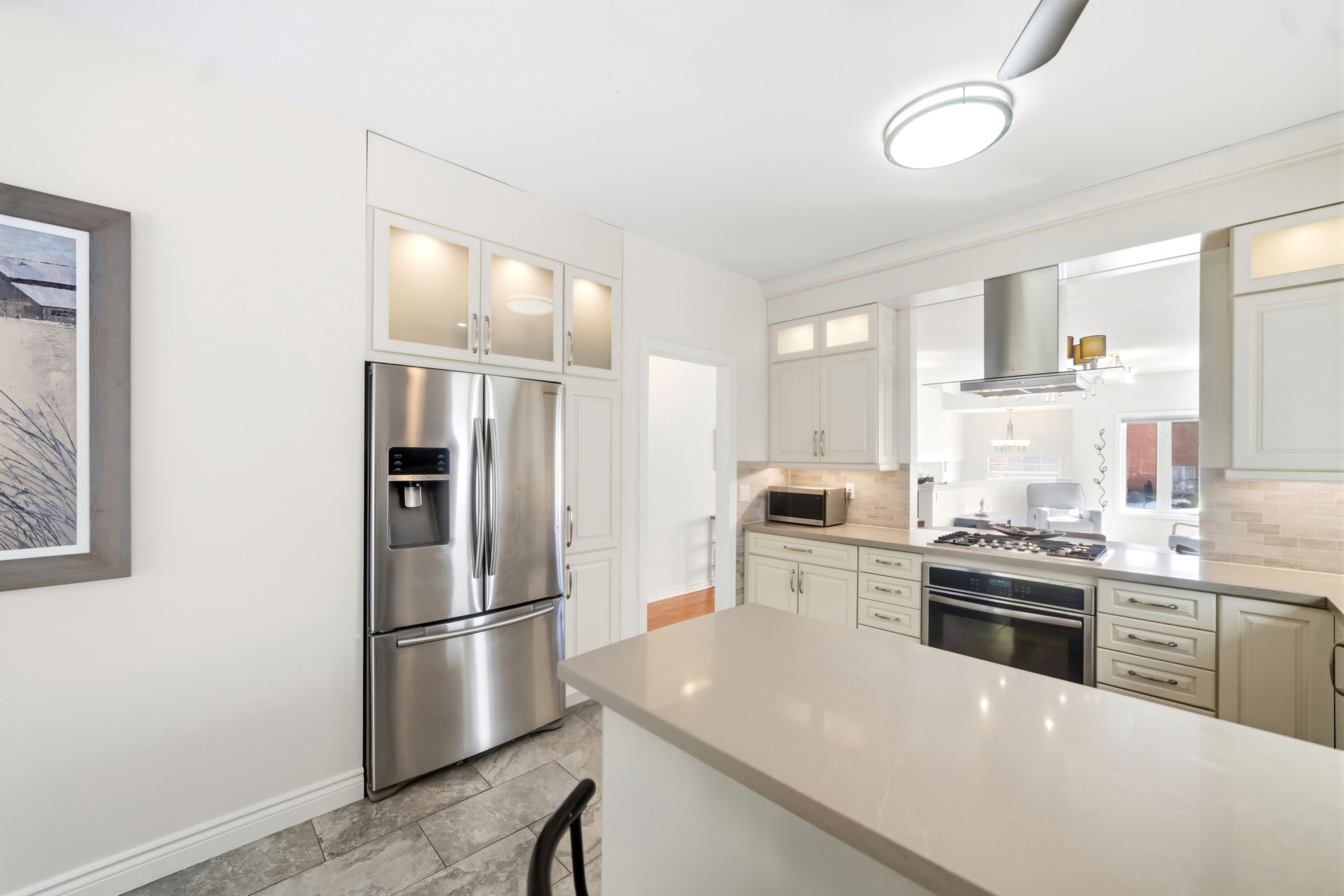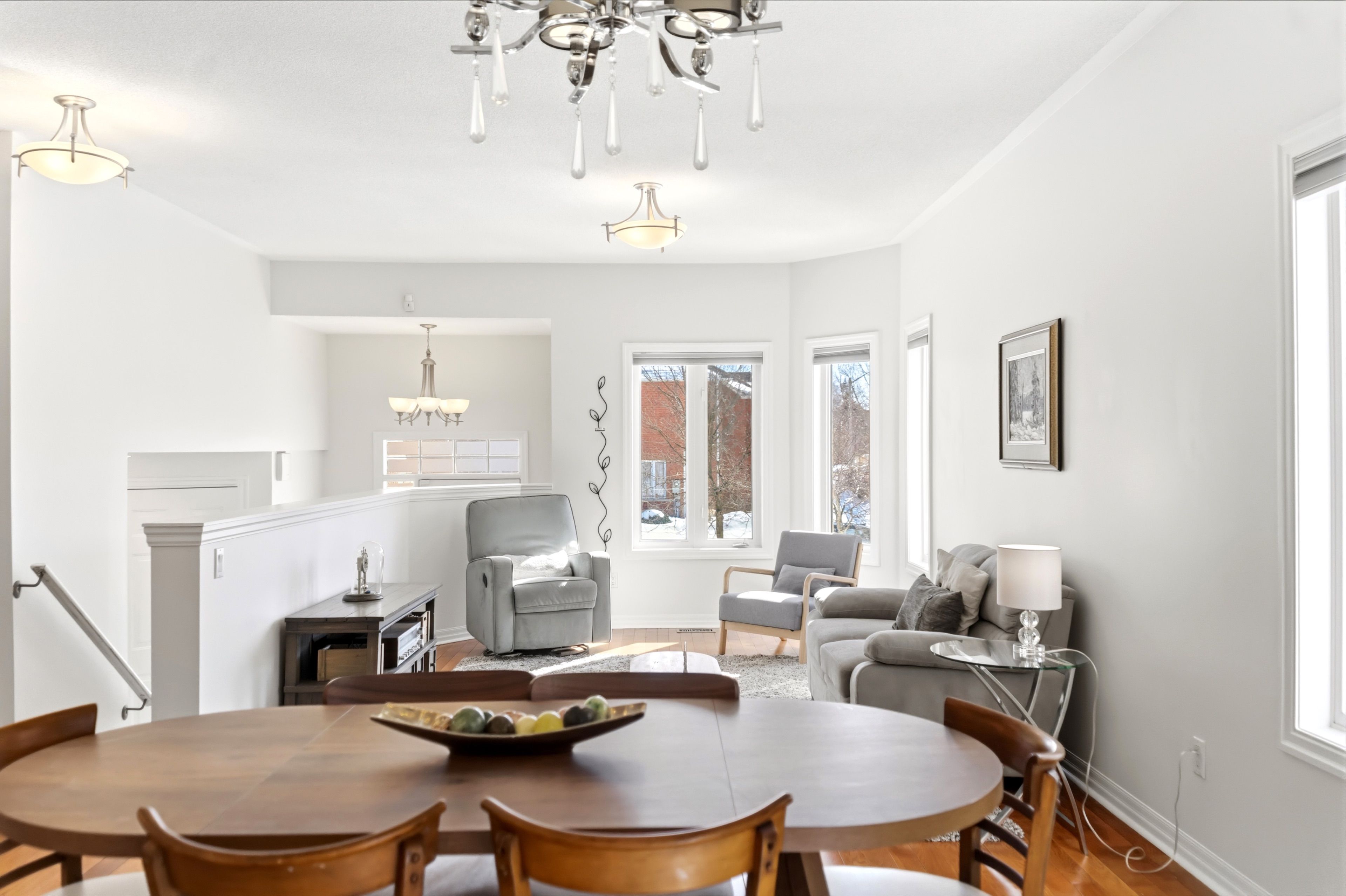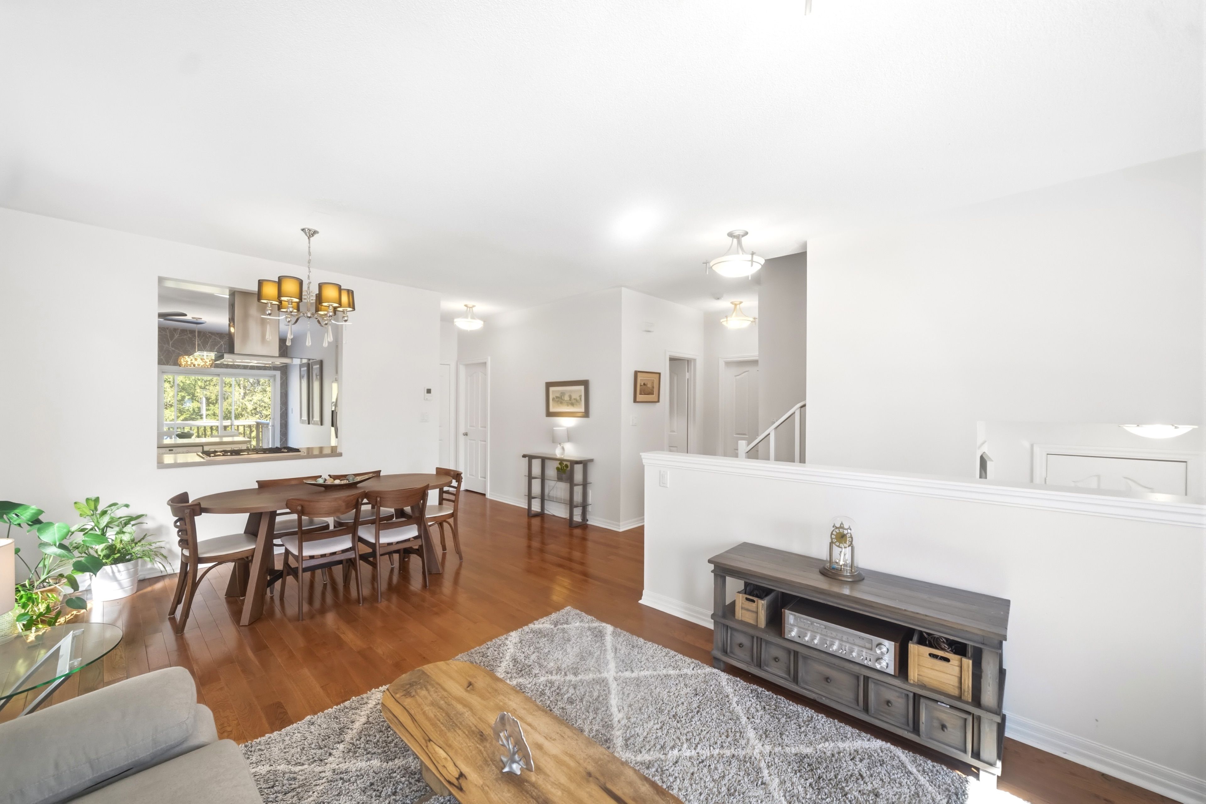• Open-concept design with high ceilings and hardwood floors.