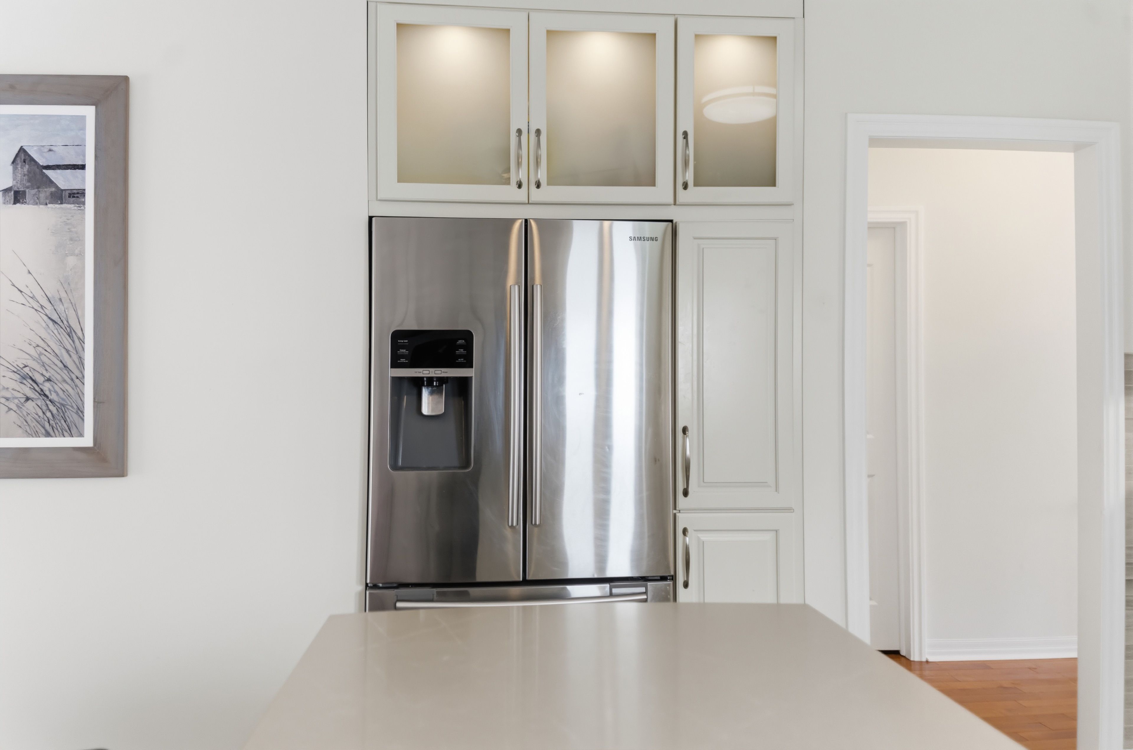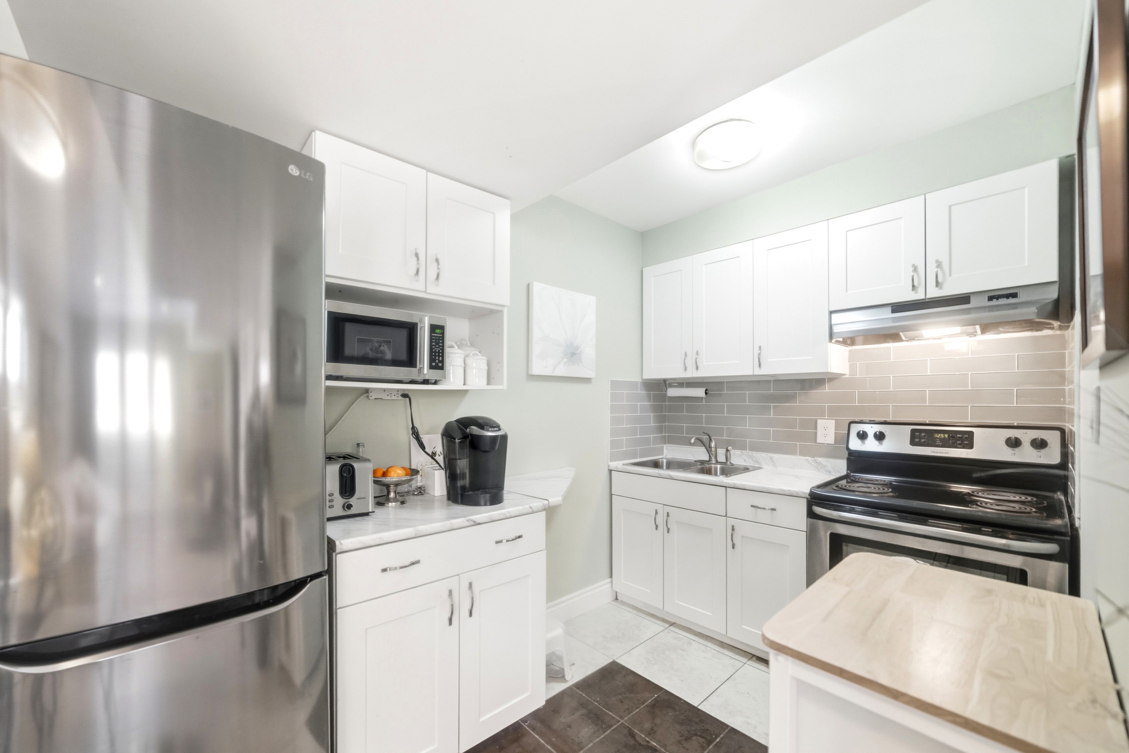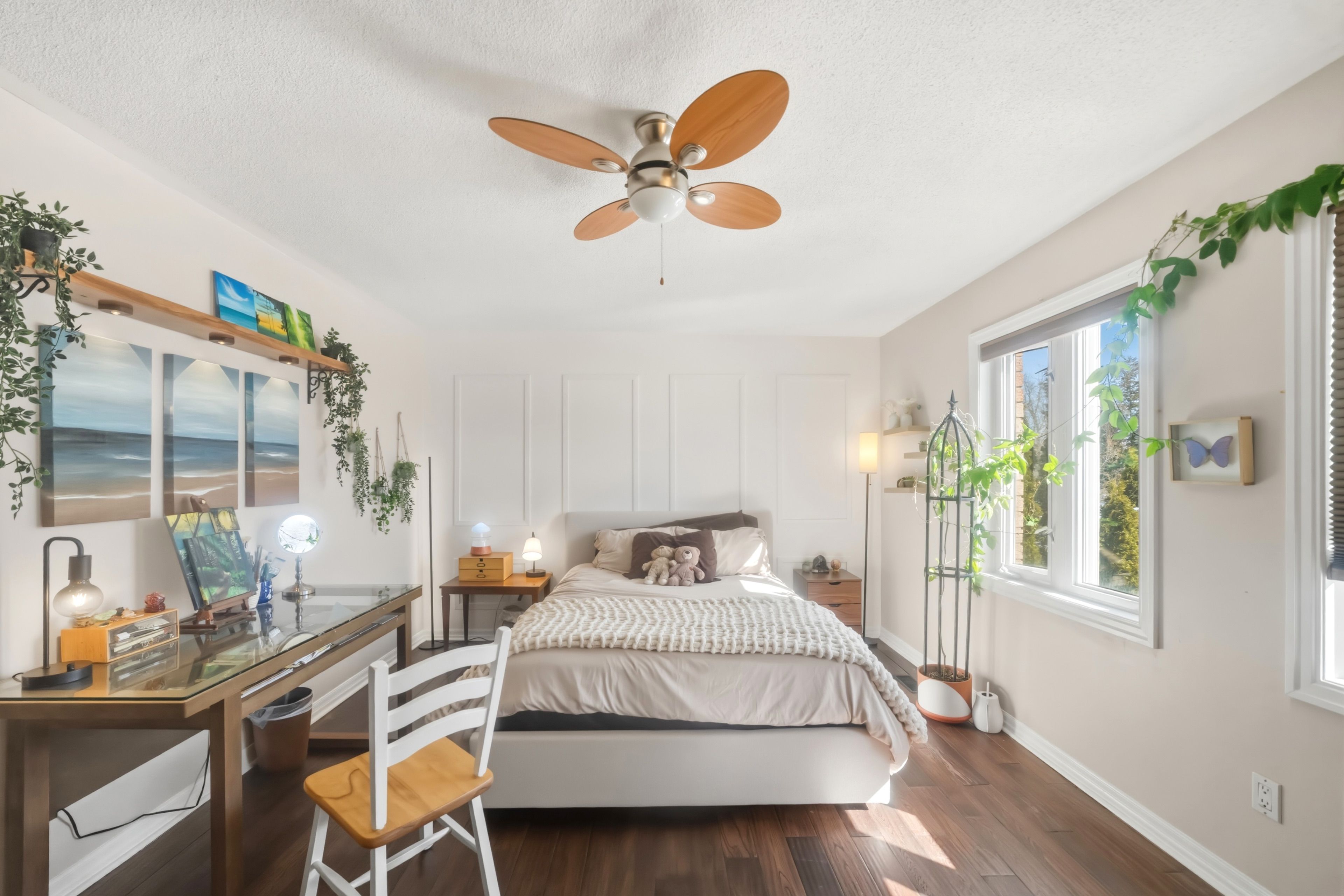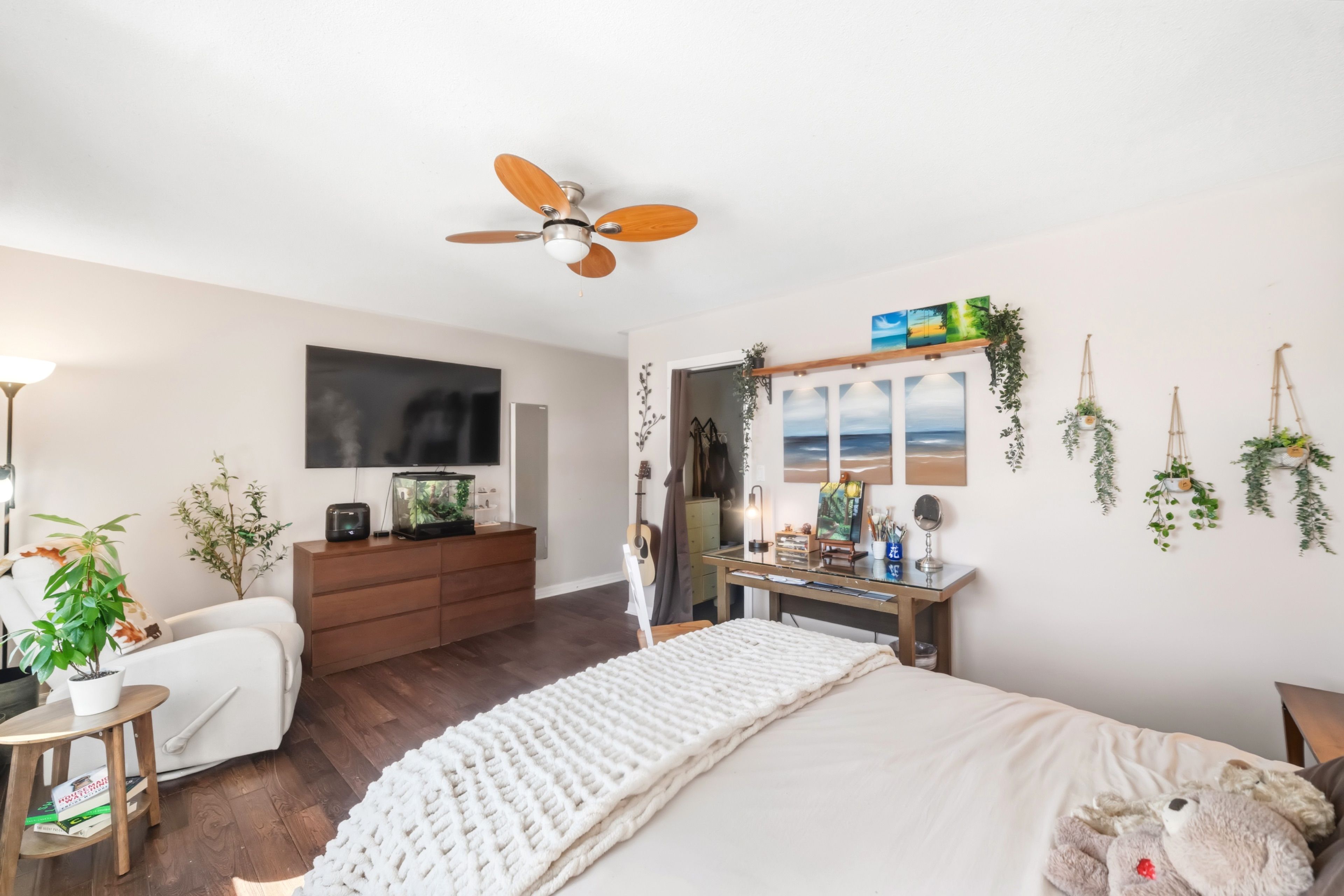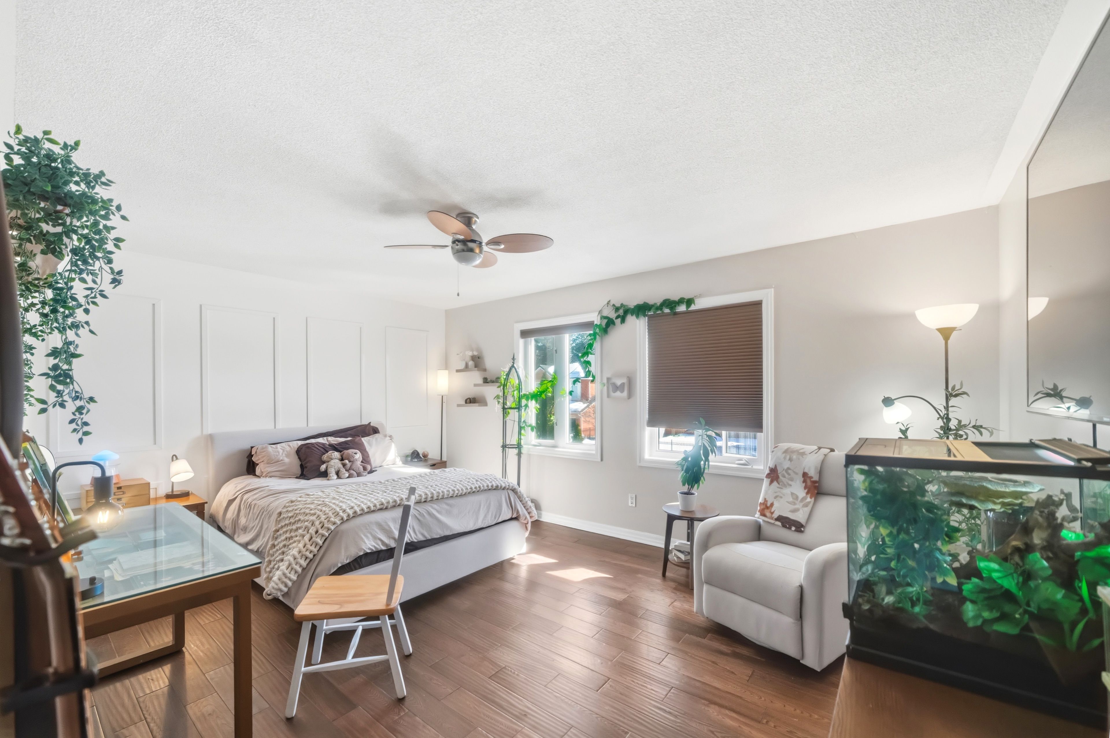 • Open-concept design with high ceilings and hardwood floors.