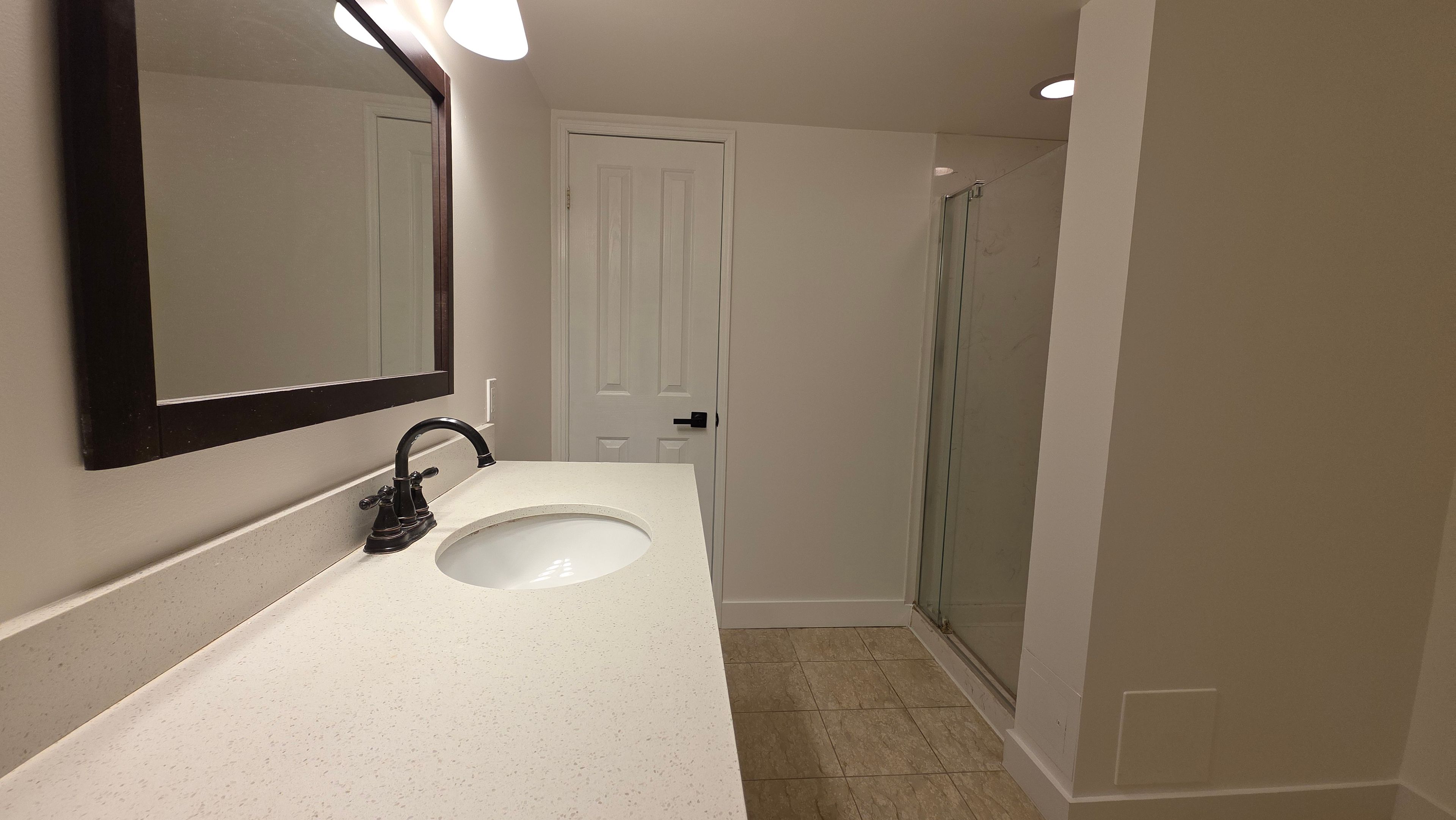 • Modern kitchen featuring quartz countertops and stylish pot lights.