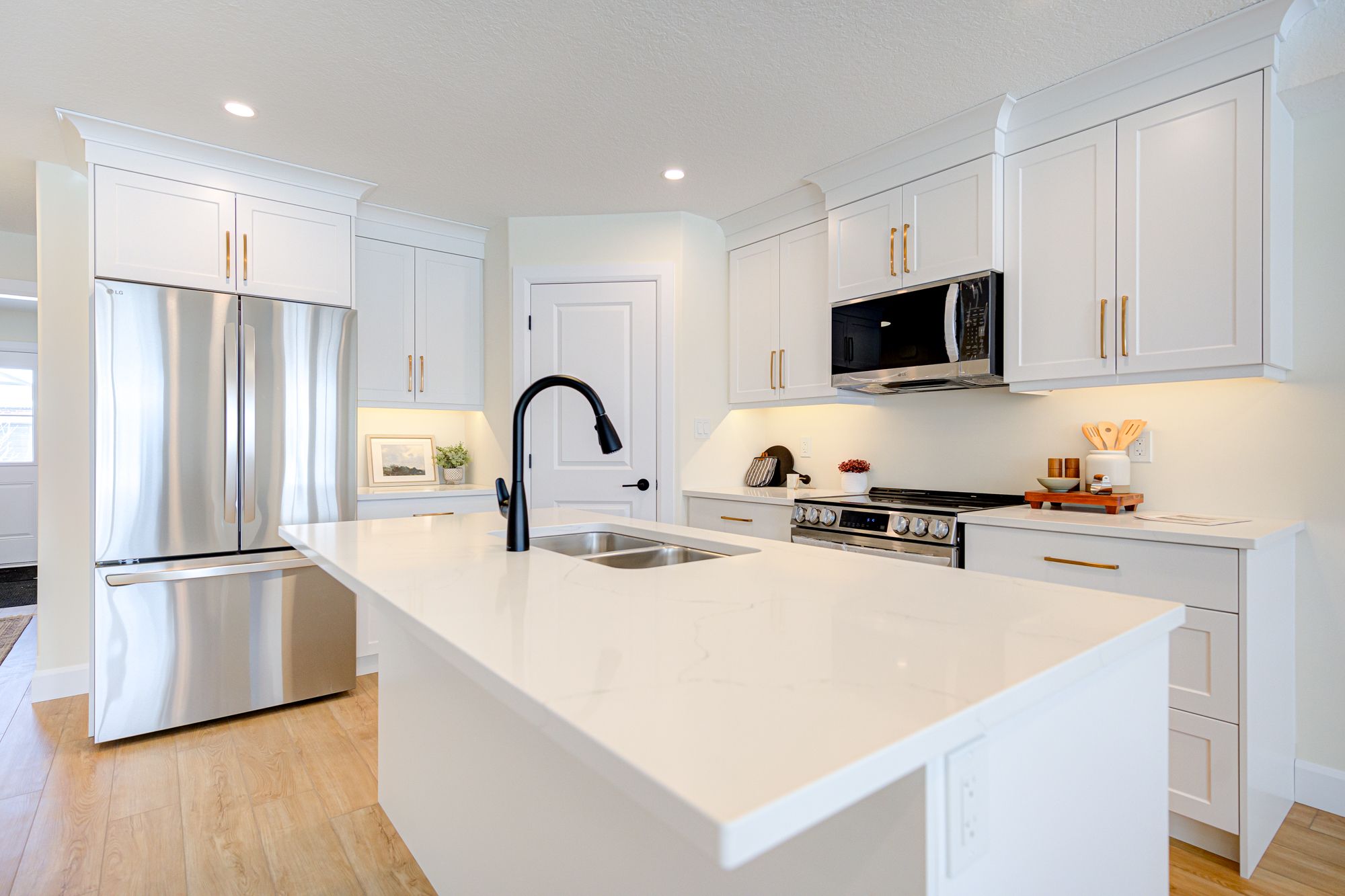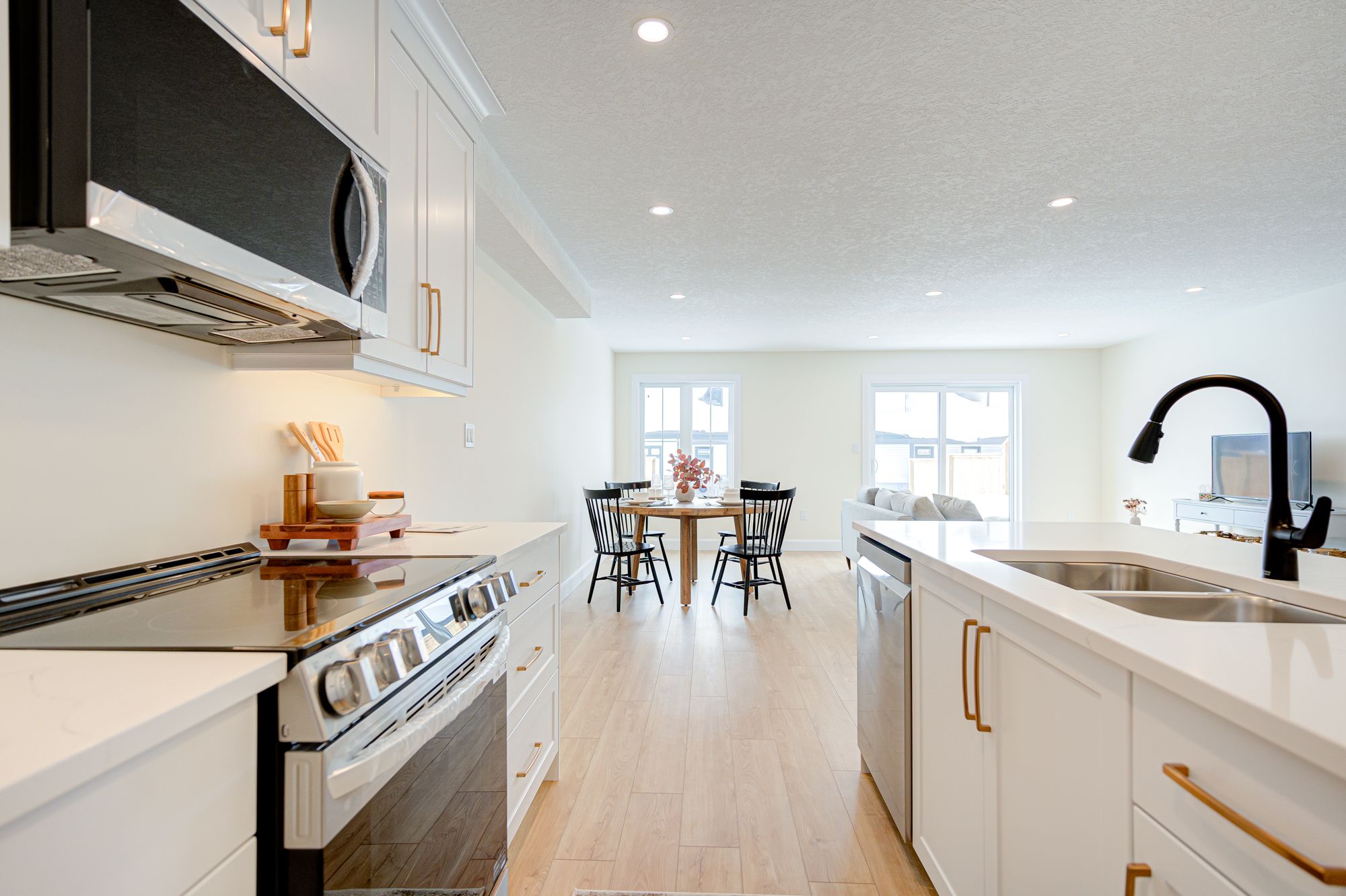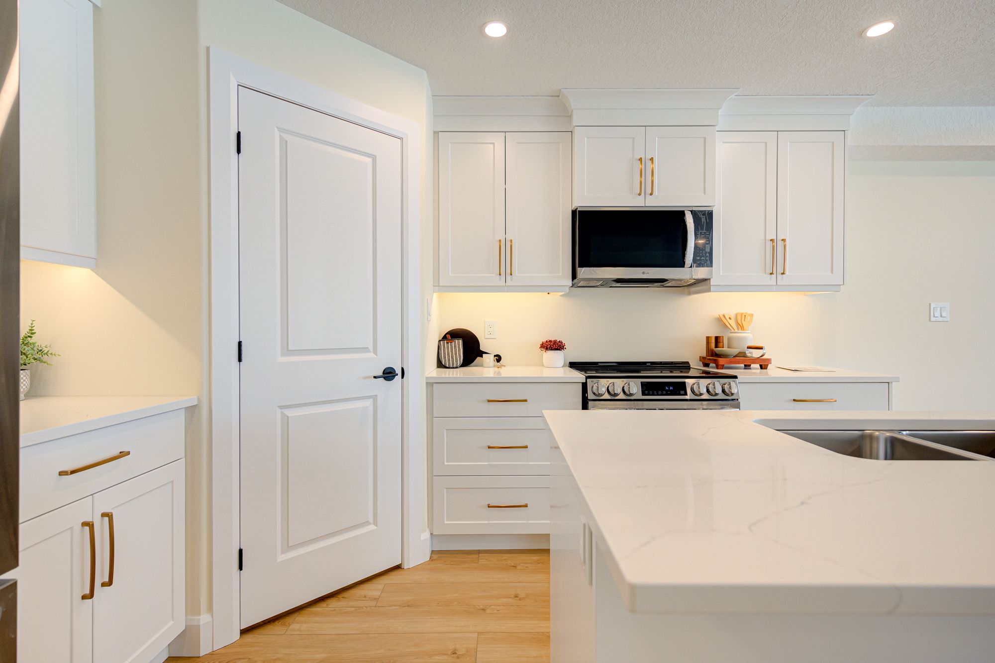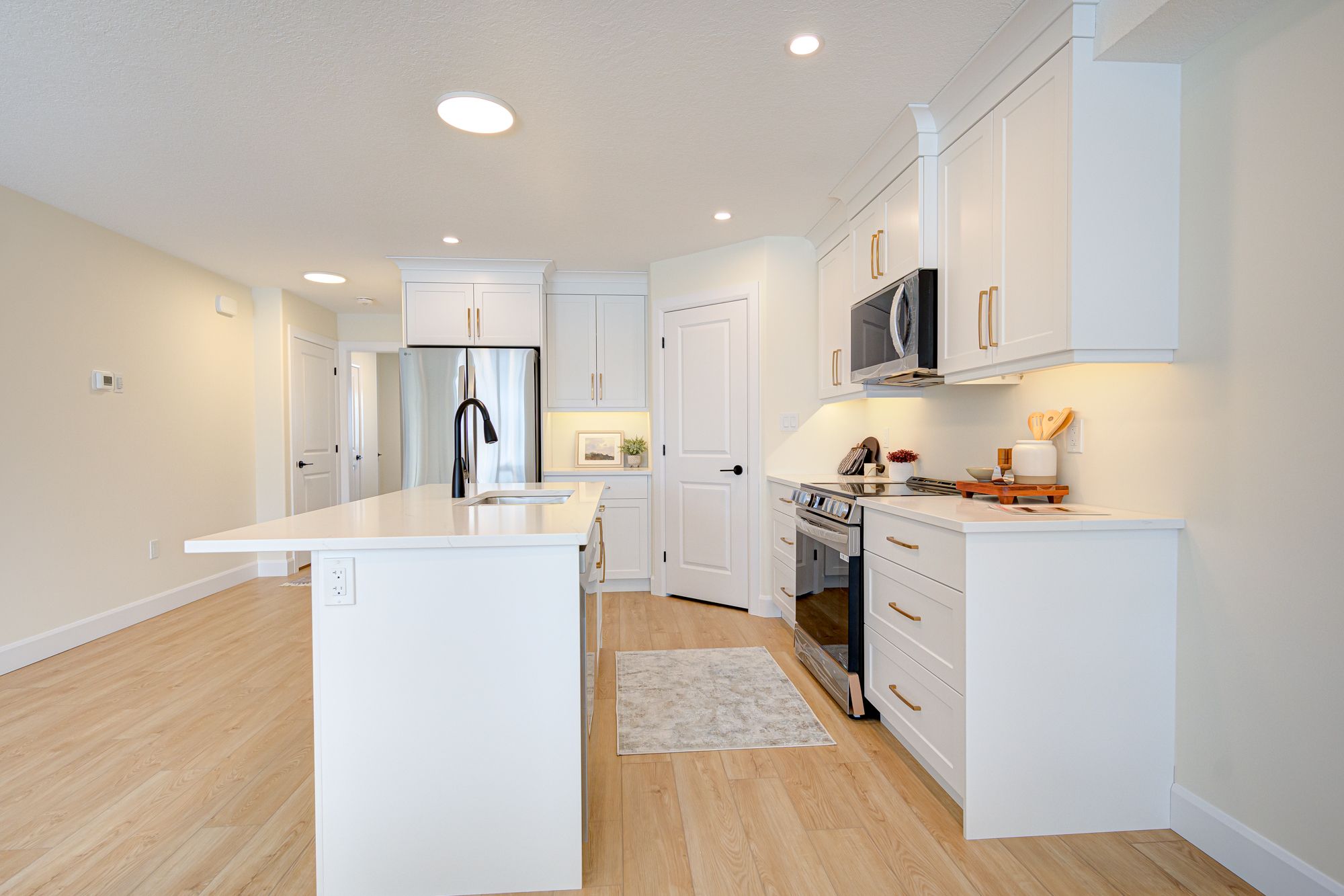 • Modern features like hard surface countertops and custom cabinetry.