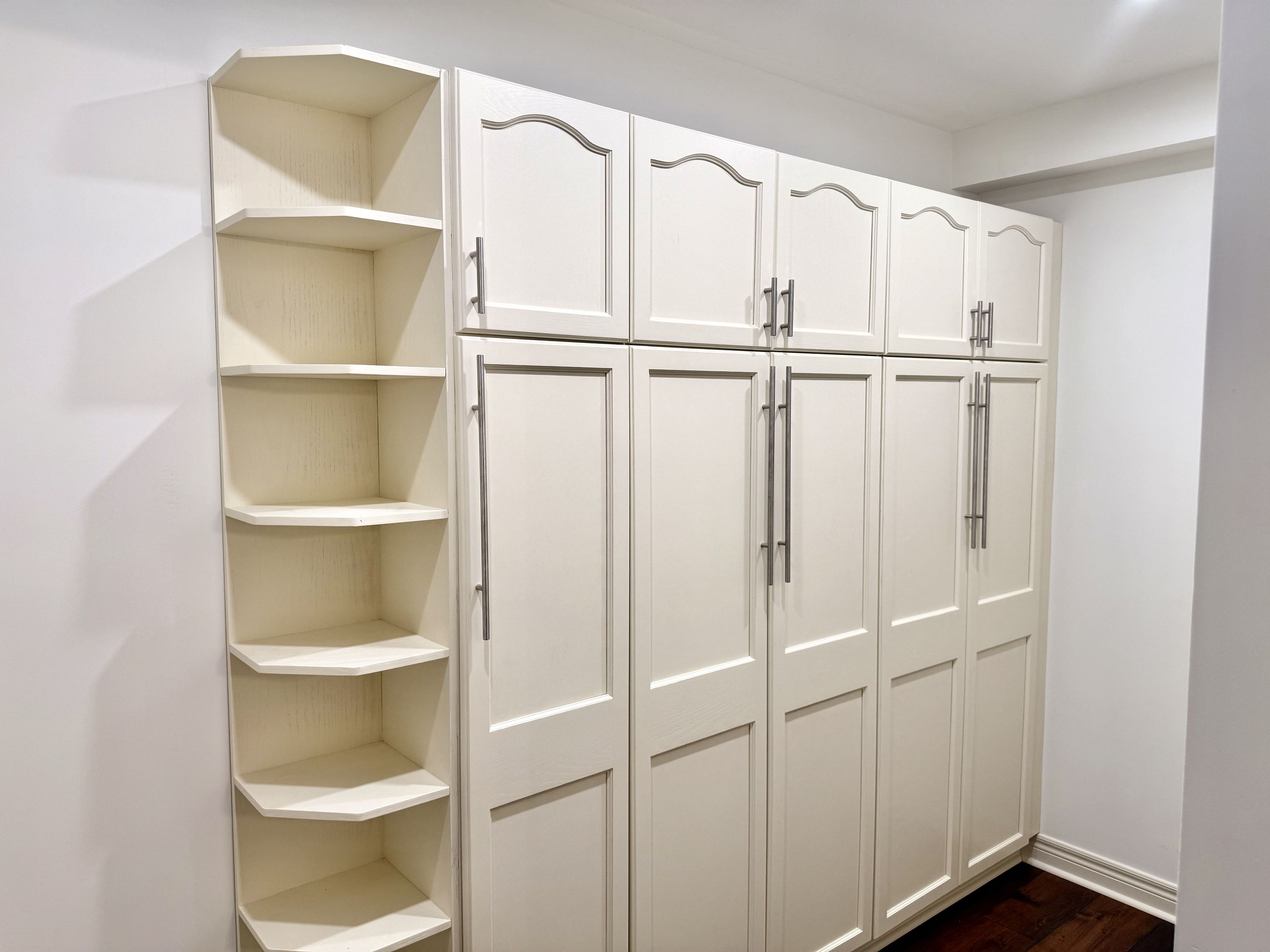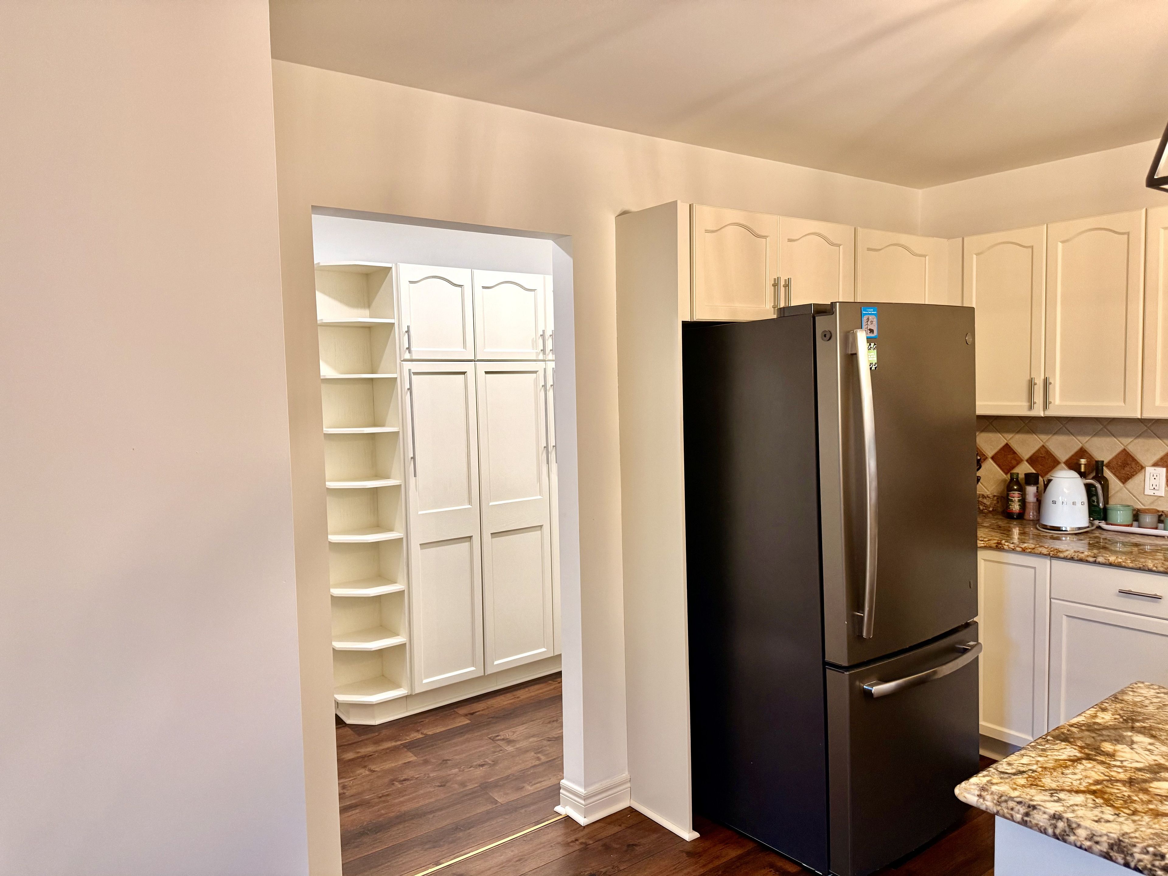 • Modern kitchen with stone countertops and a custom walk-in pantry.