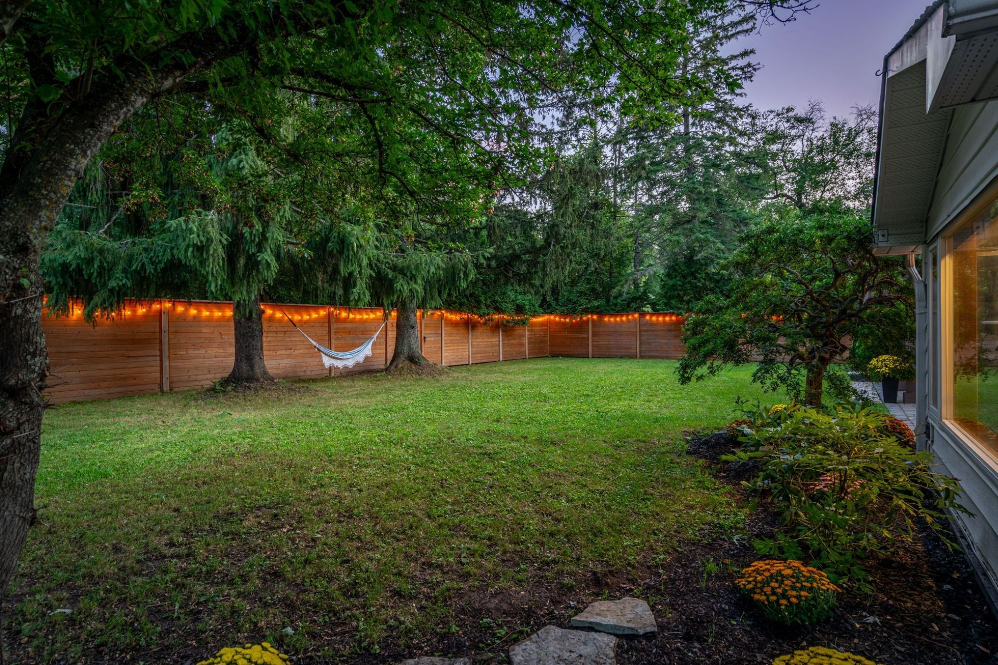 • South-facing fenced backyard with a hot tub, fire pit, and play structure.