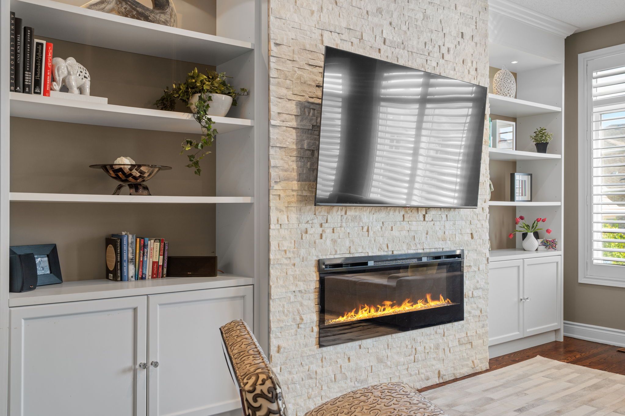 • Open-concept great room features built-ins and a floor-to-ceiling fireplace.