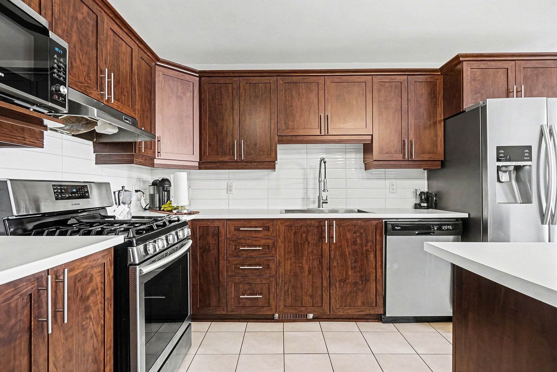 • Modern kitchen featuring stainless steel appliances and oversized island.
