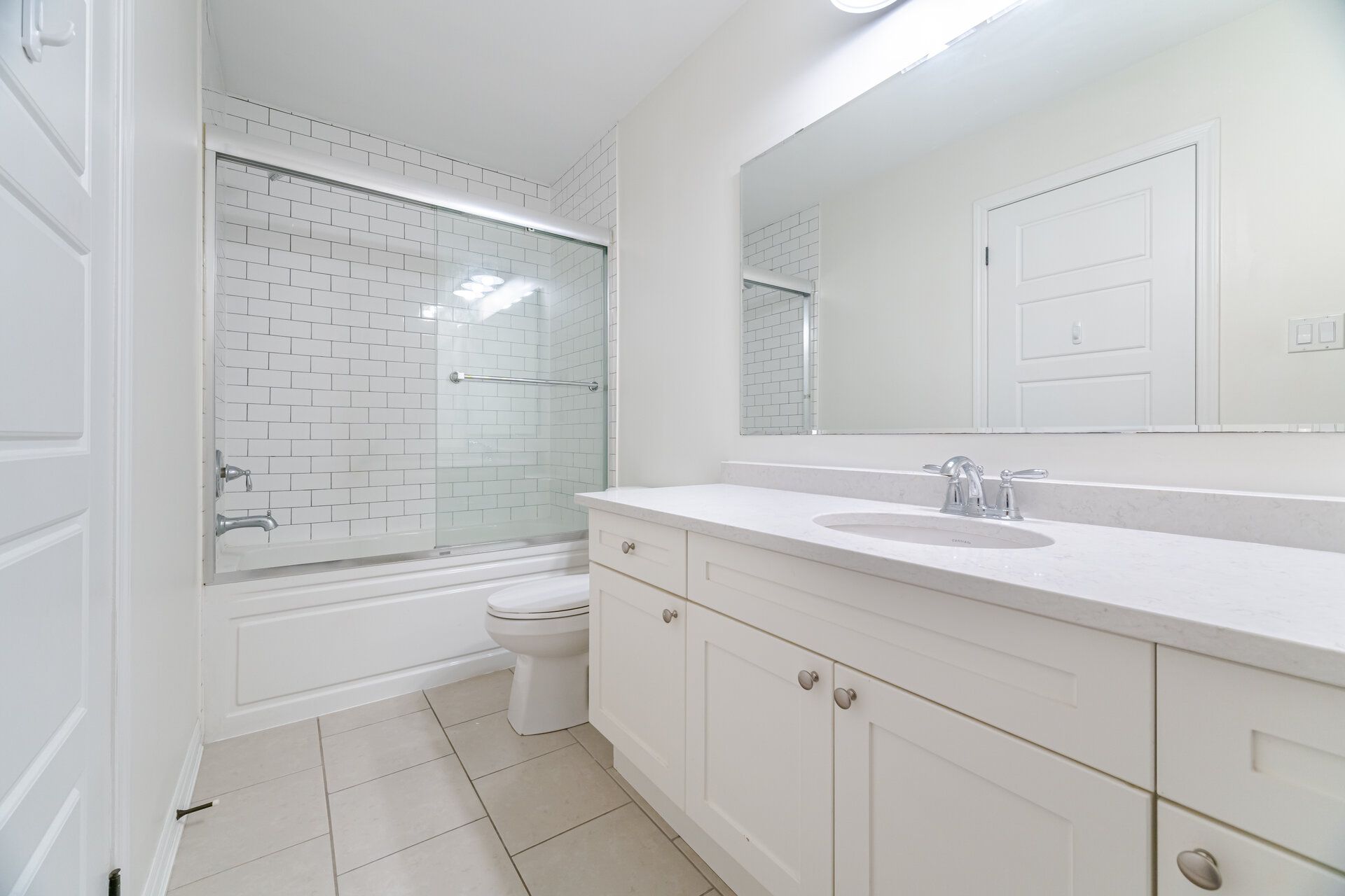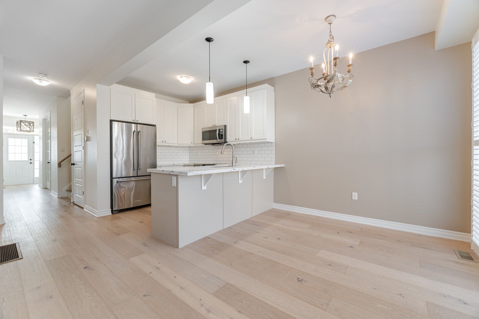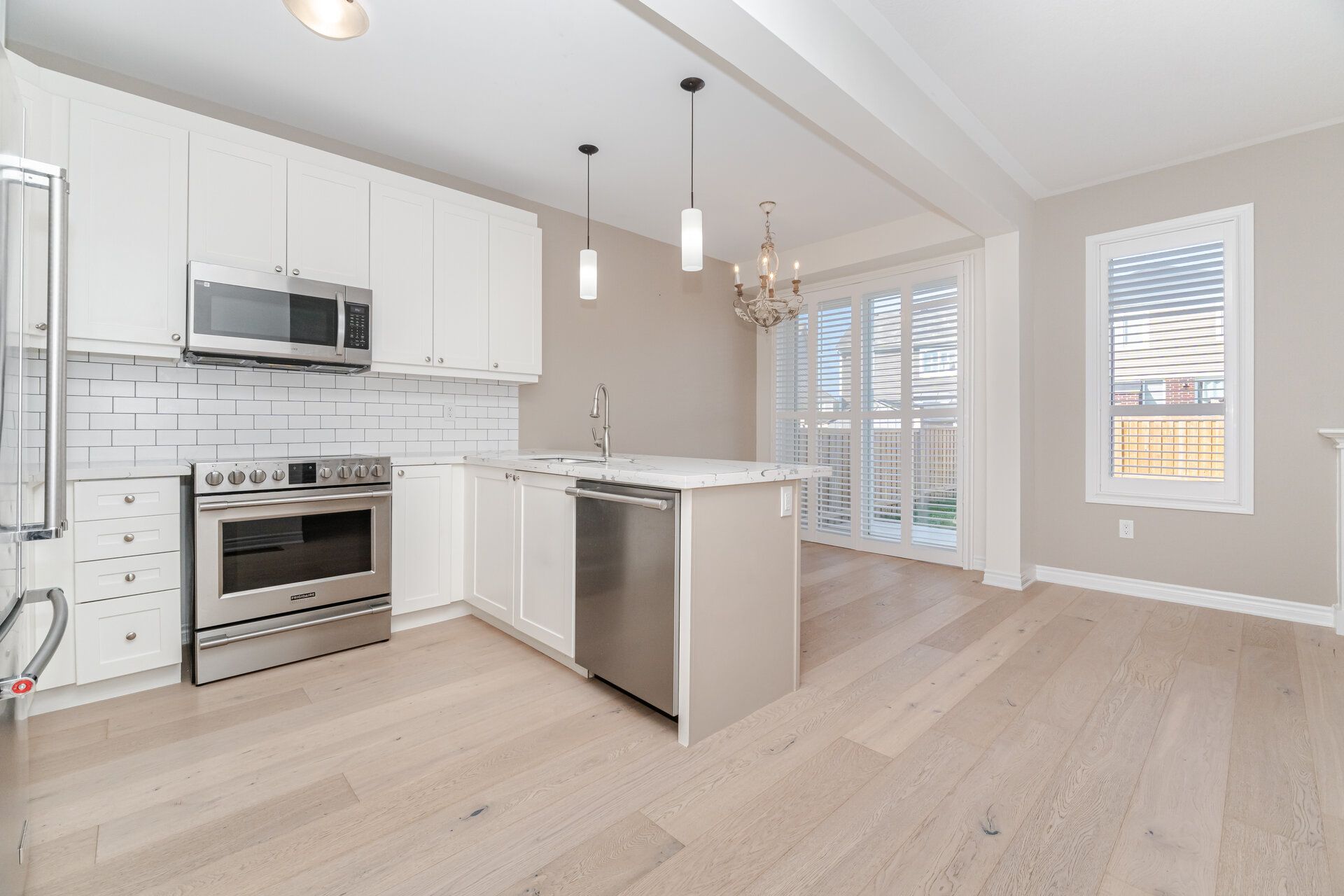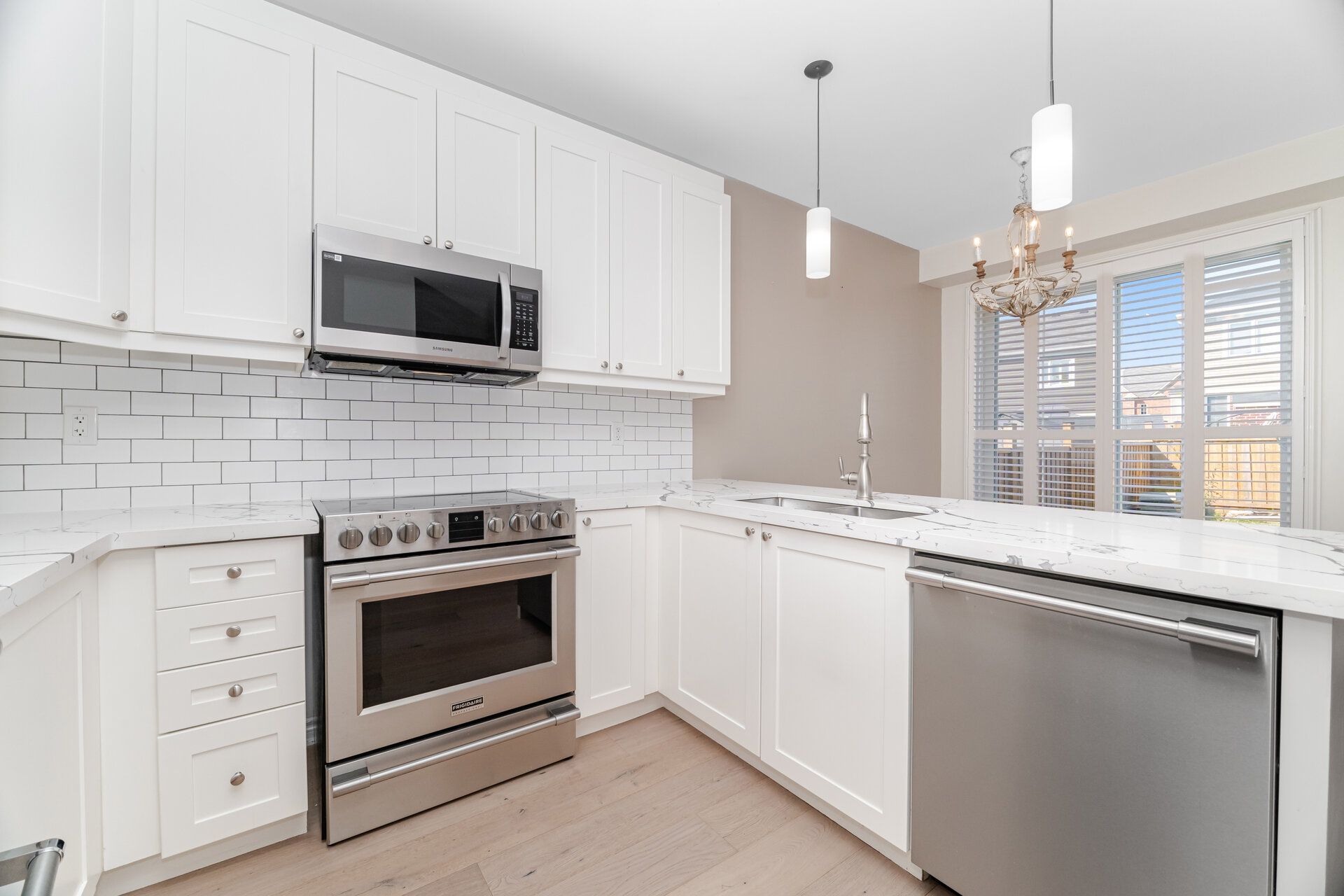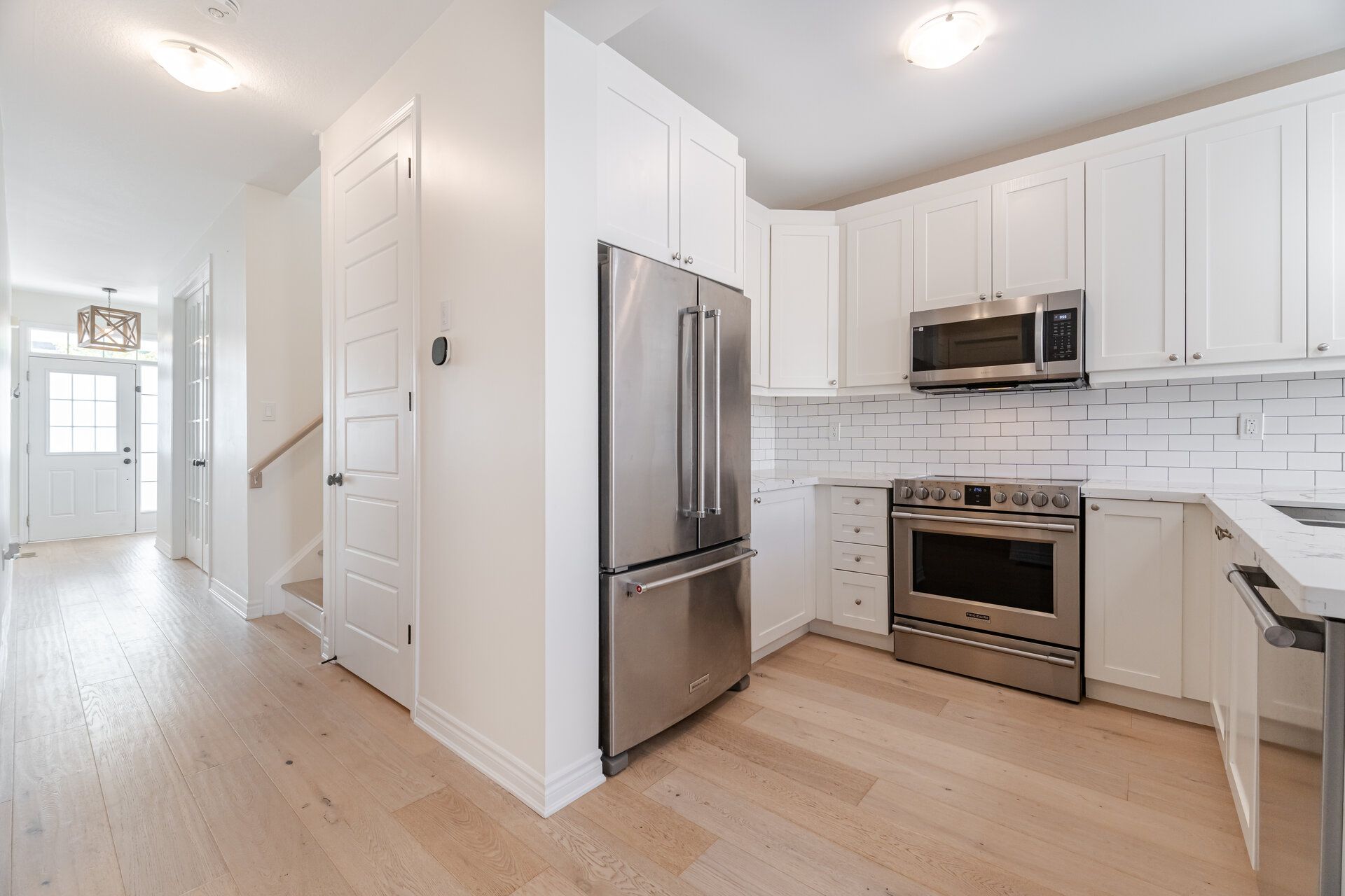 • Chef-style kitchen equipped with quartz counters and stainless steel appliances.