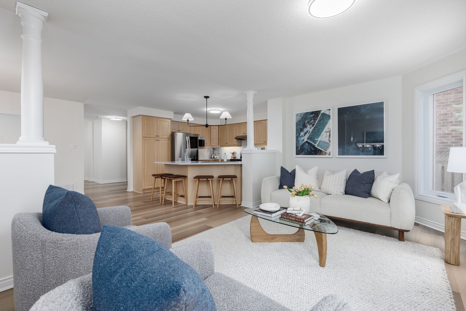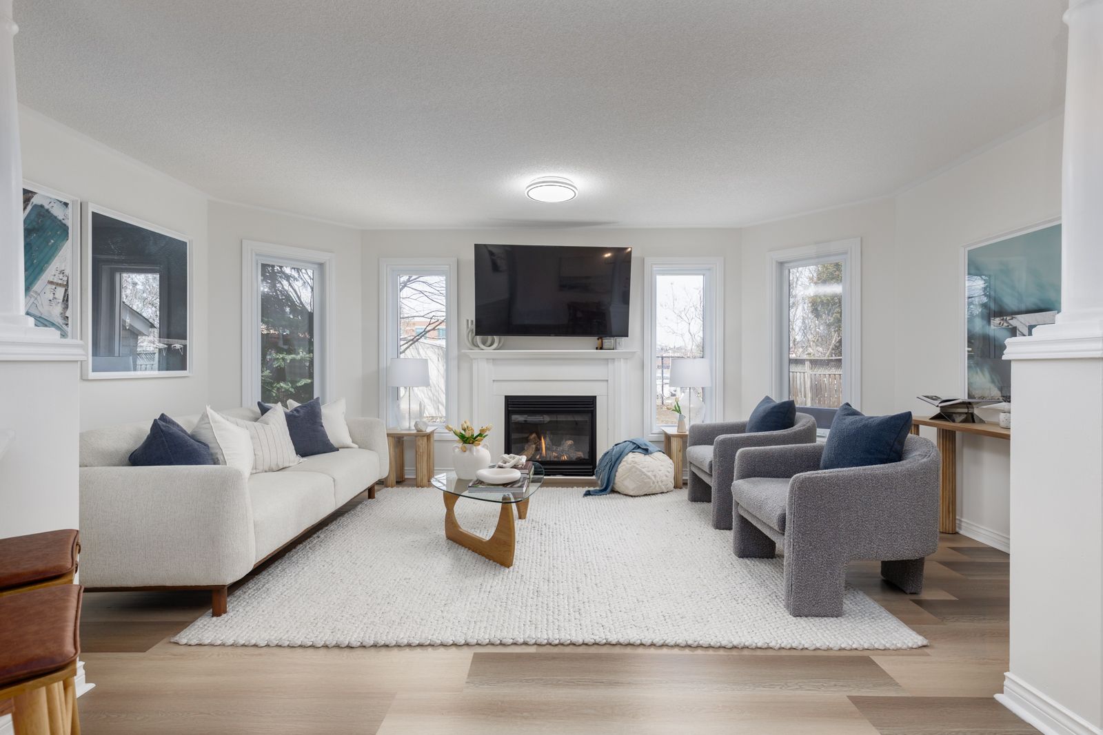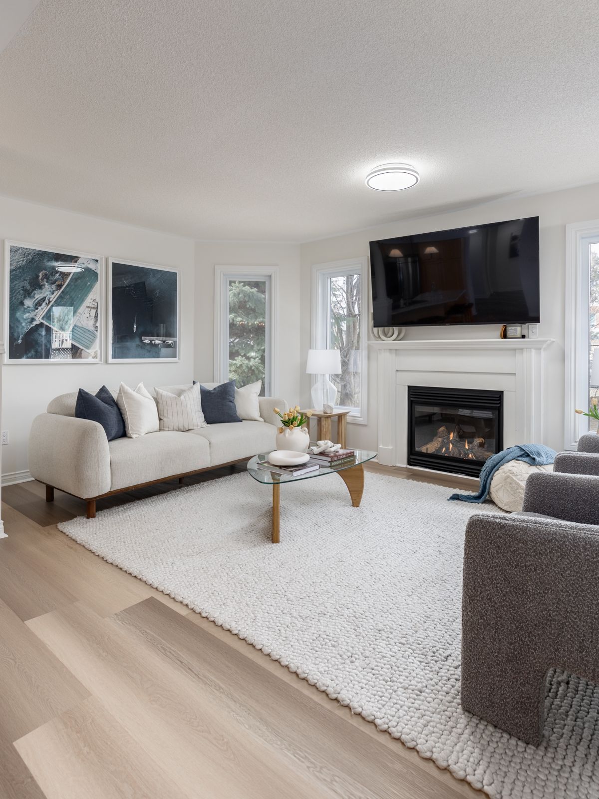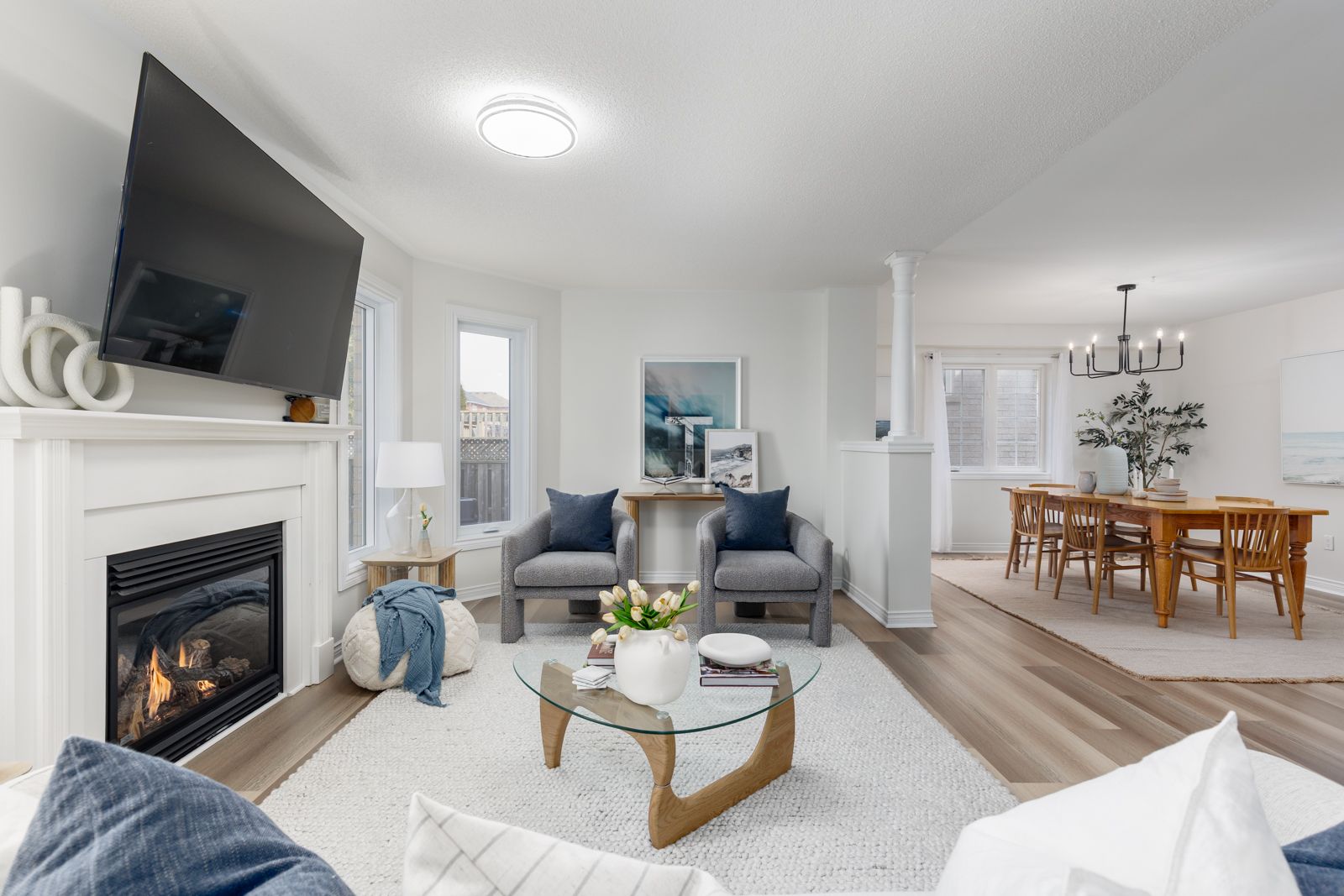 • Open-concept layout with versatile living spaces and a cozy gas fireplace.