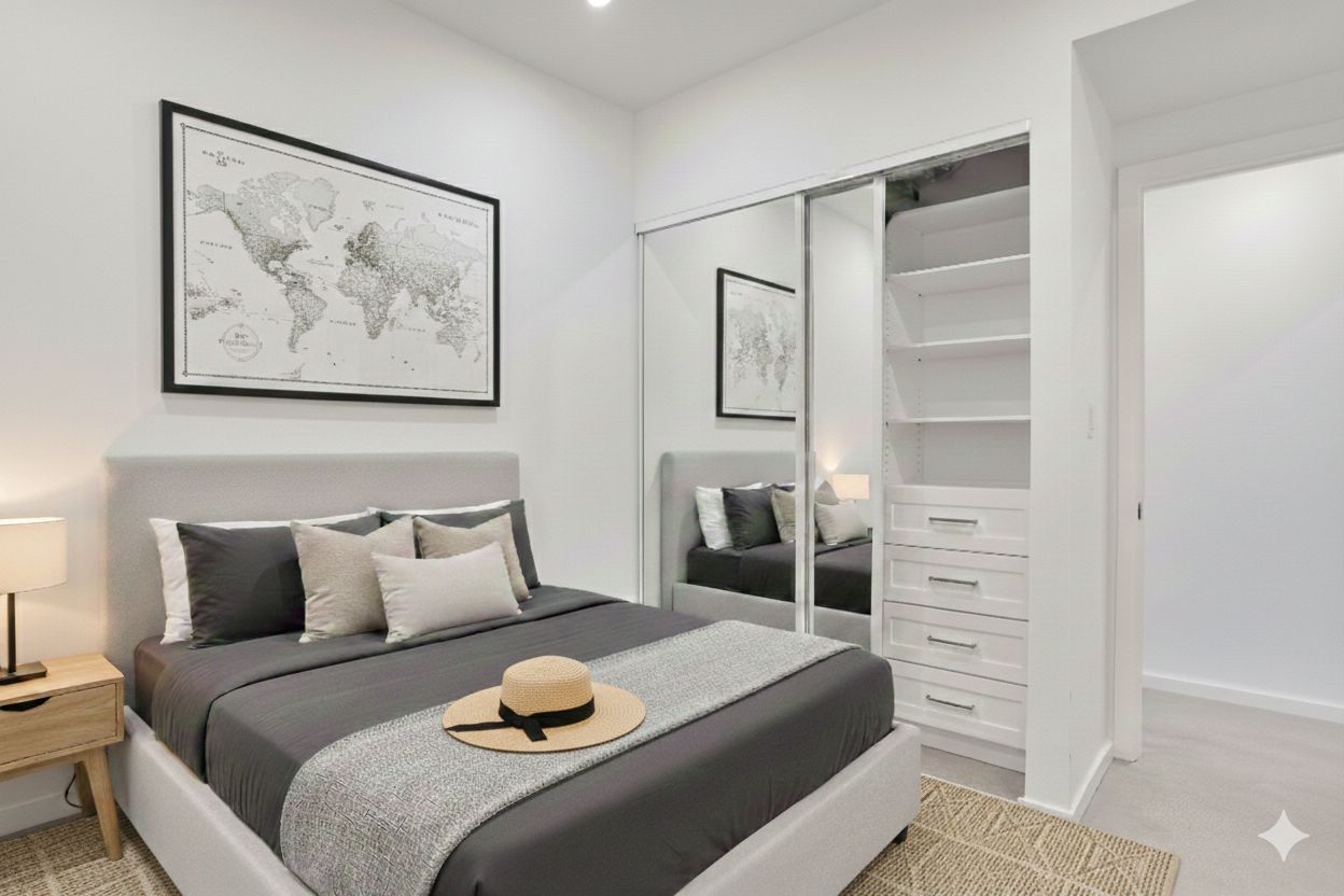 • Convenient in-suite laundry and ample storage throughout.