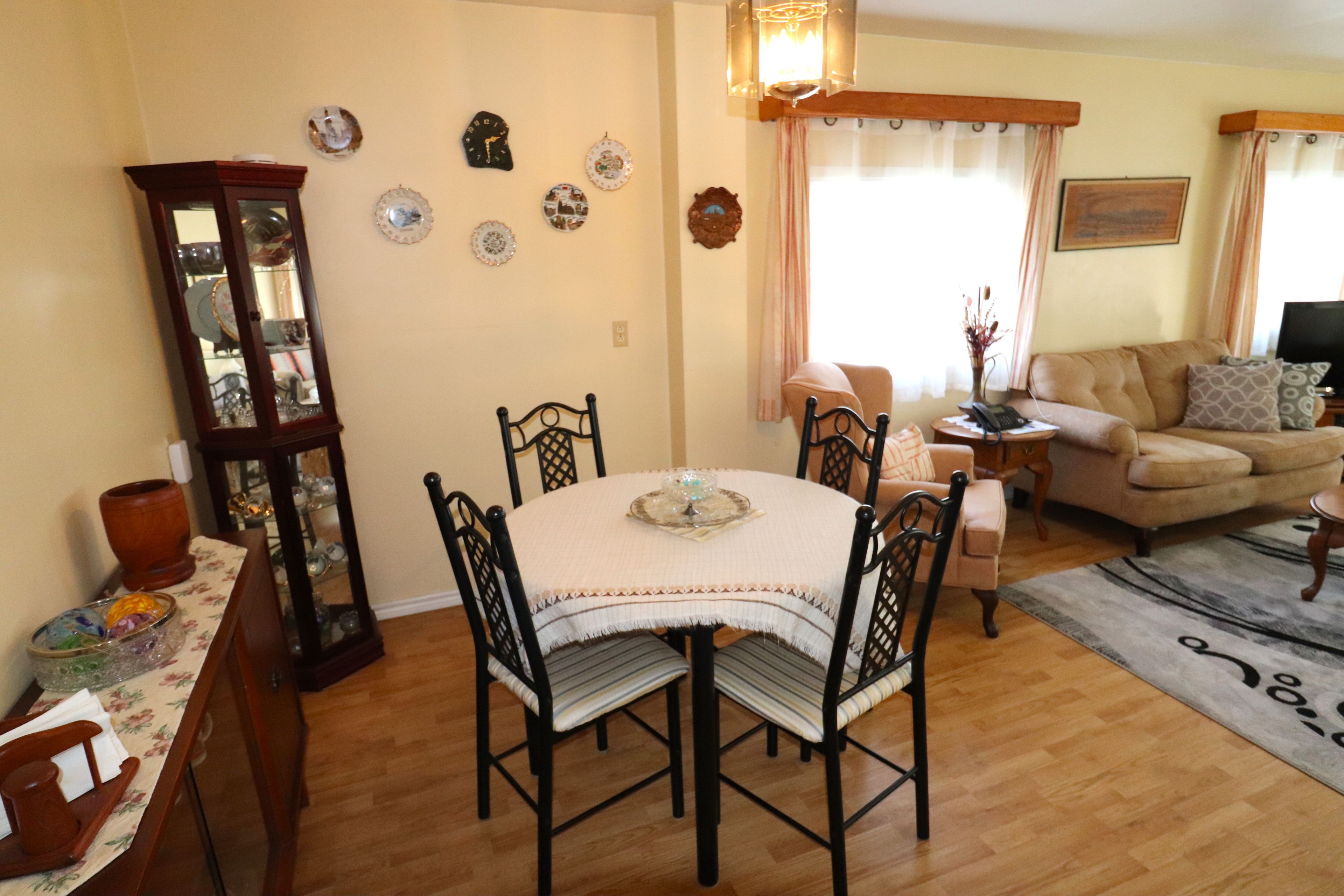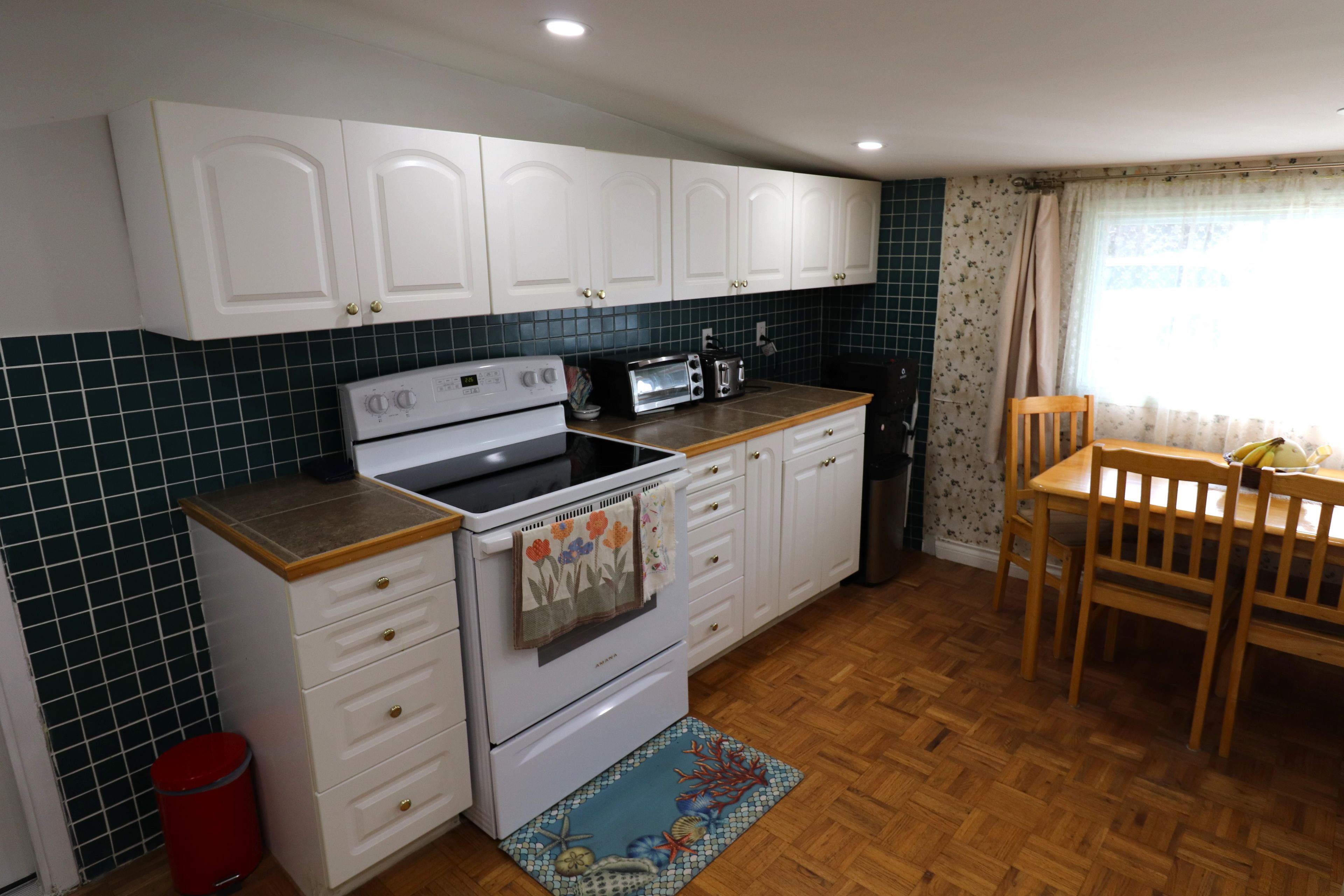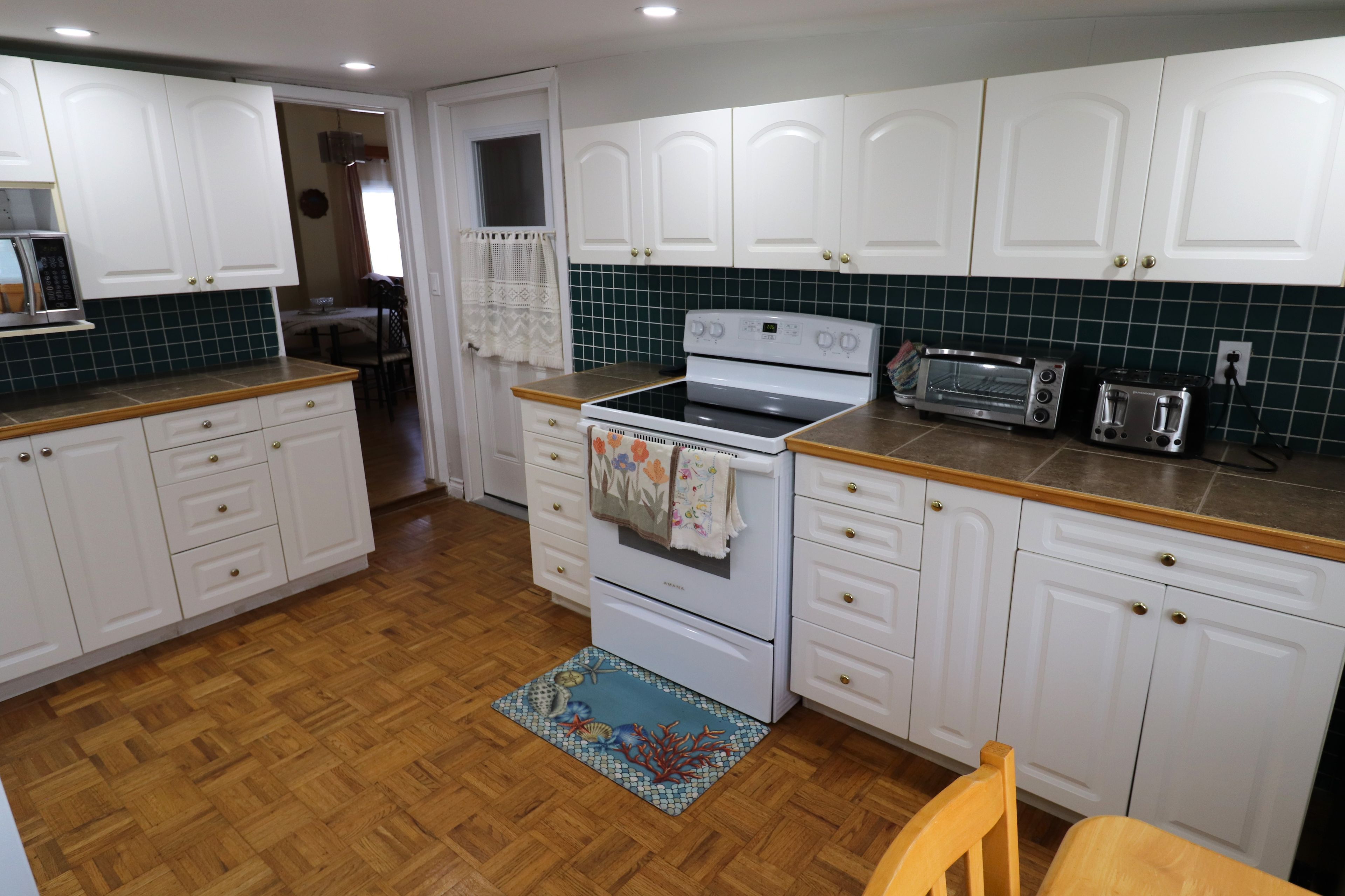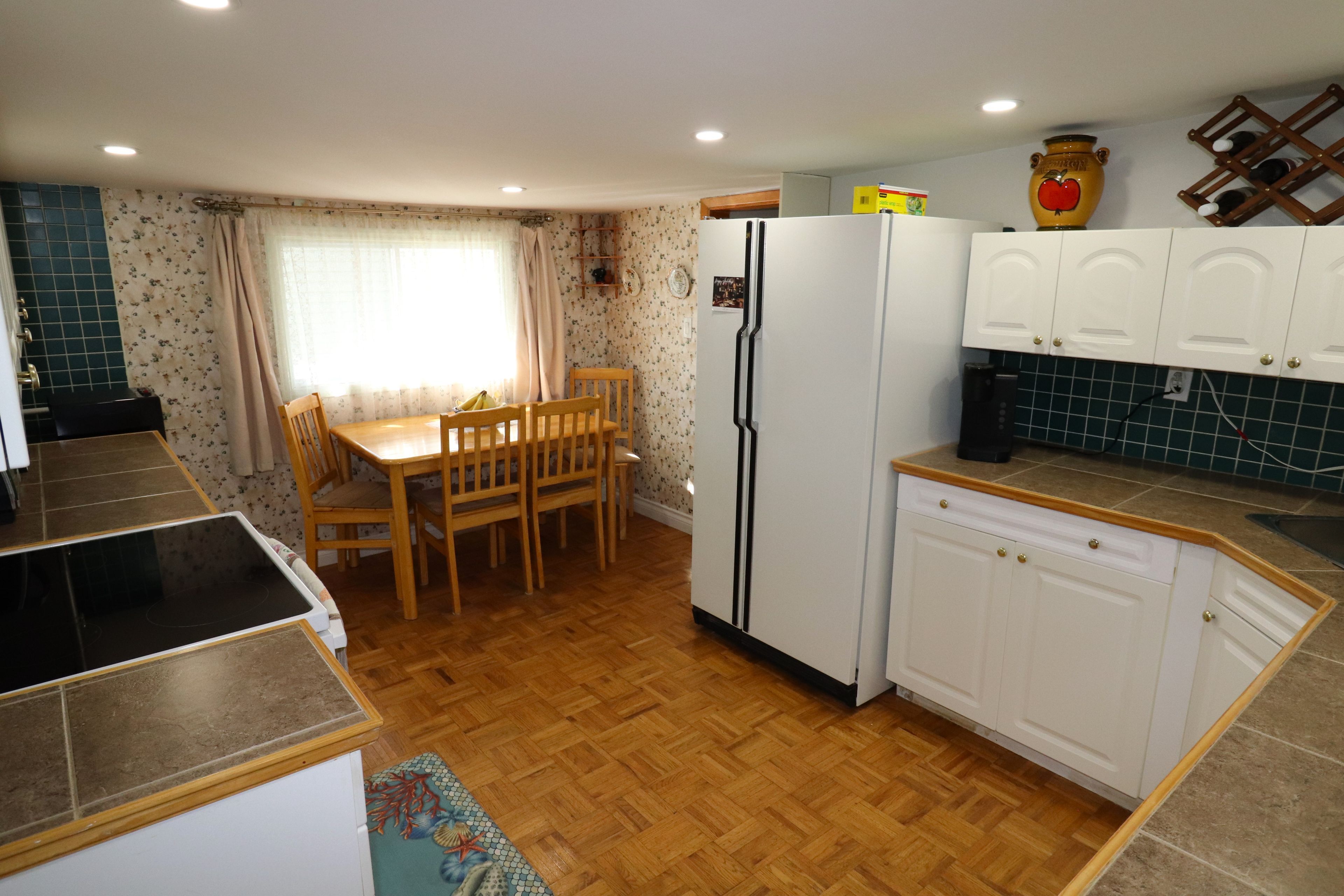 • Spacious eat-in kitchen with lots of cabinets and updated pot lighting.