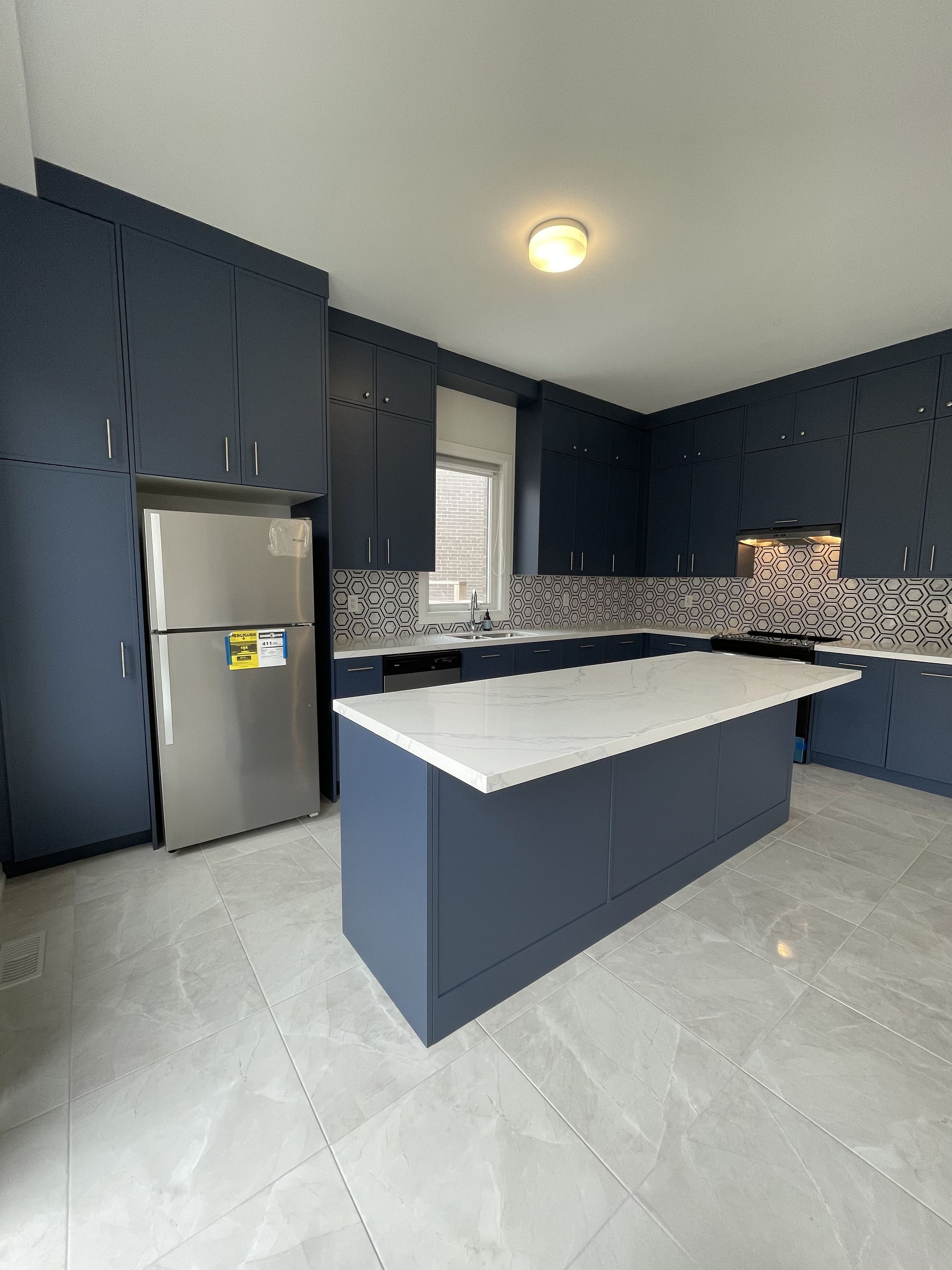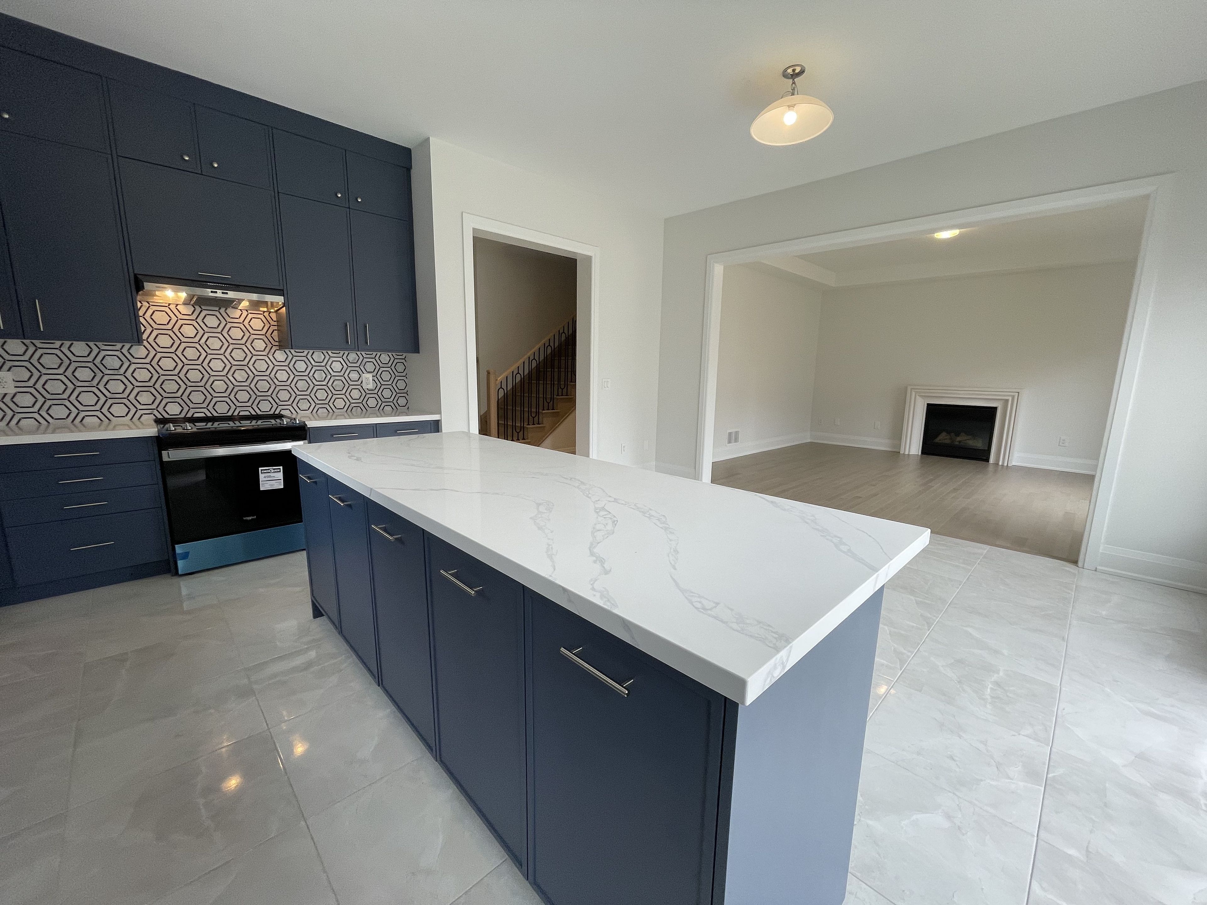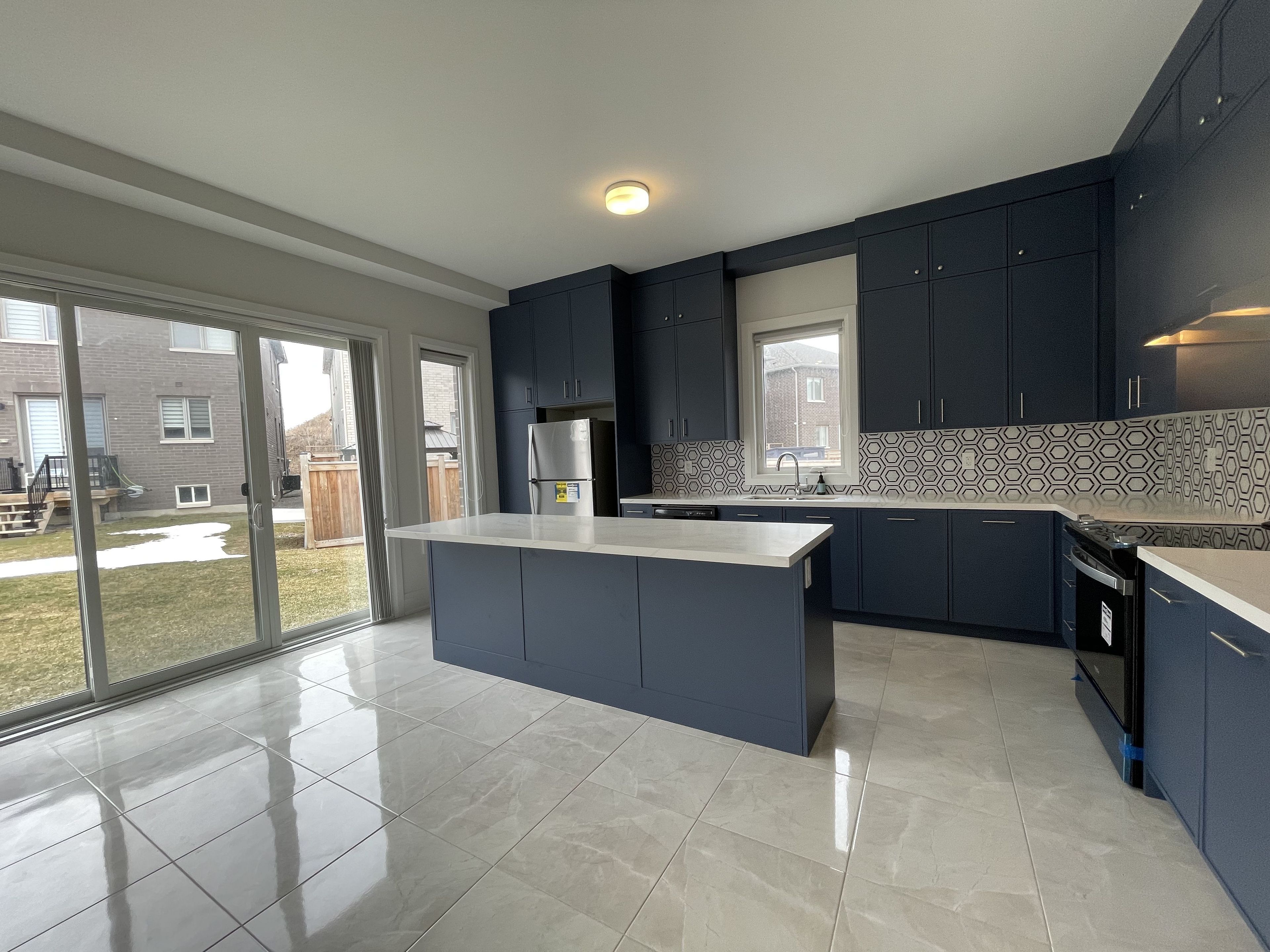 • Functional kitchen features a huge center island and stainless steel appliances.