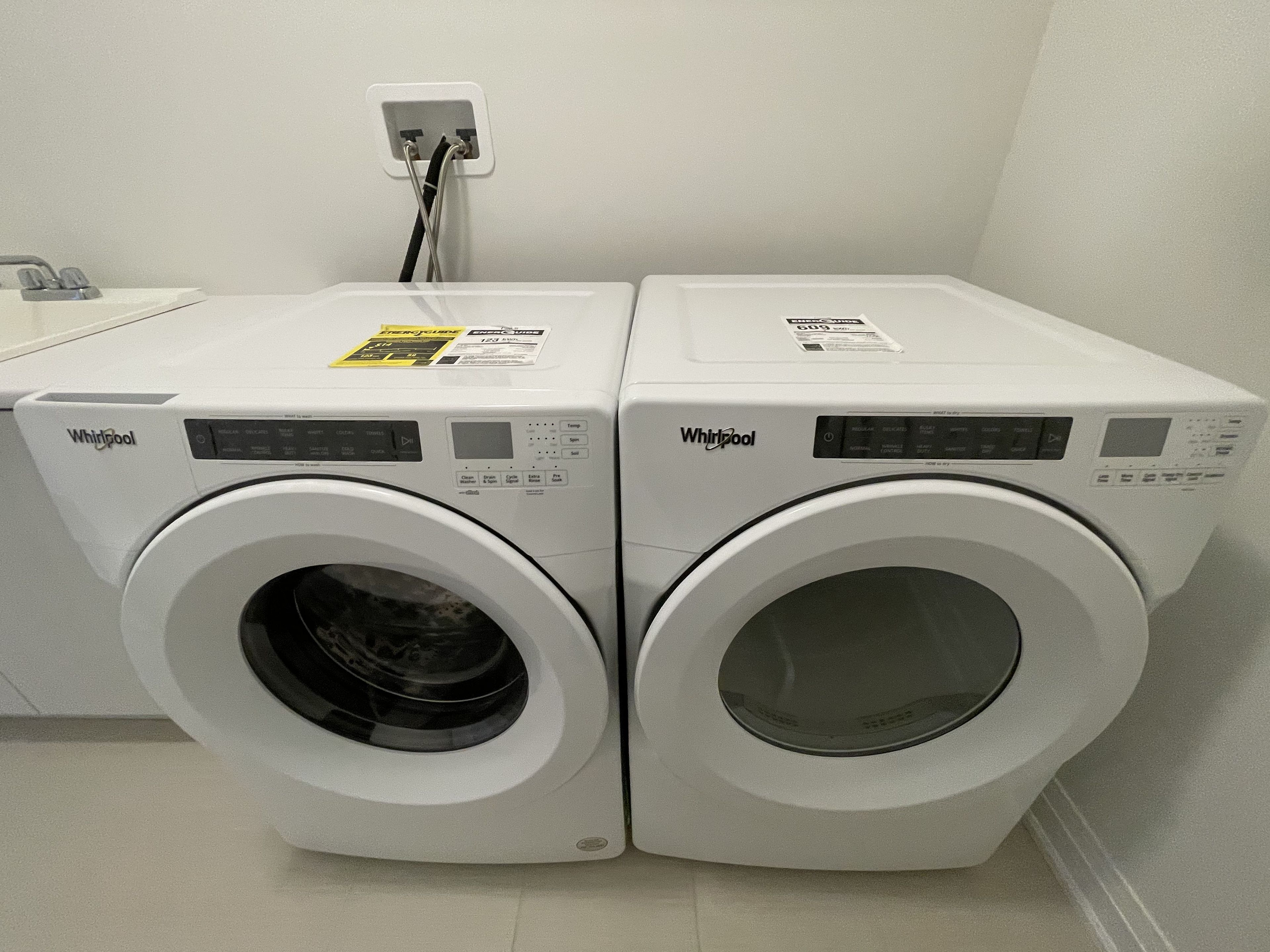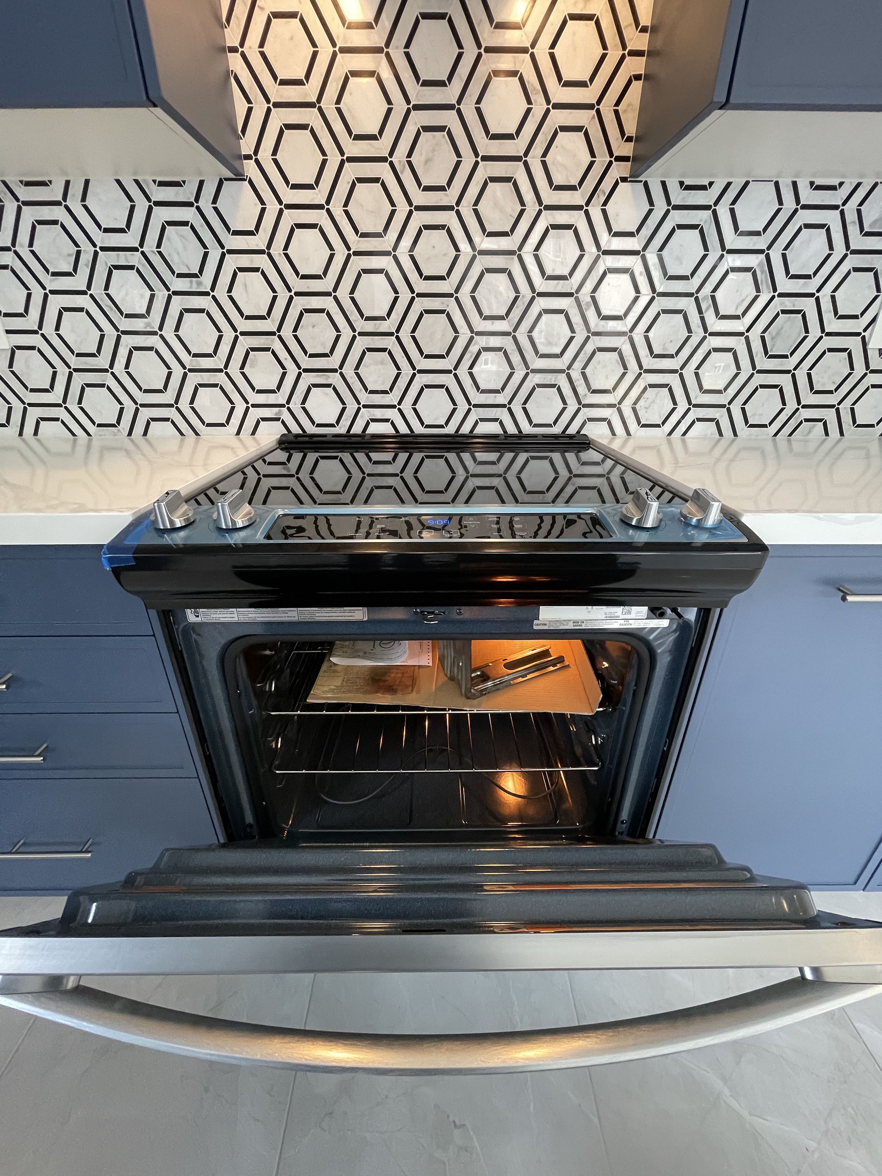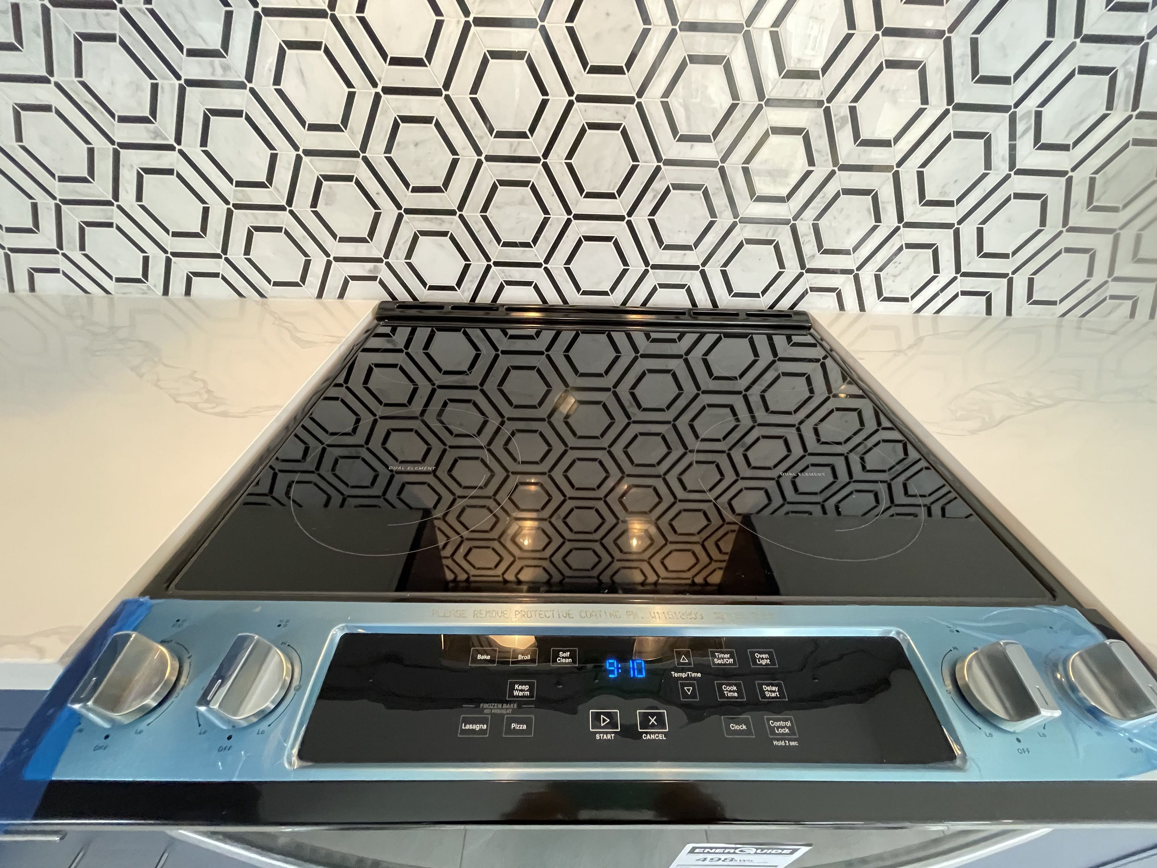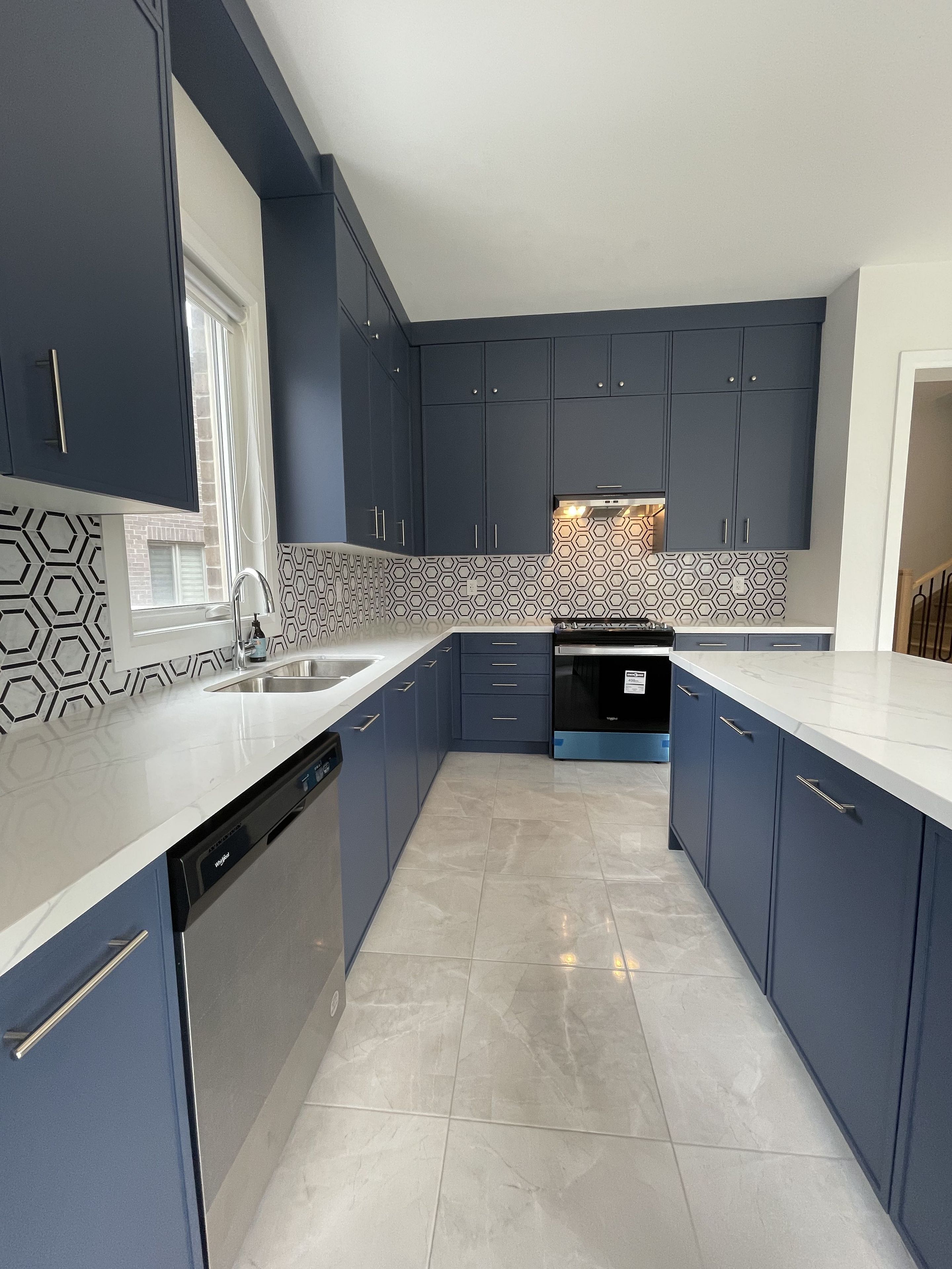 • Functional kitchen features a huge center island and stainless steel appliances.