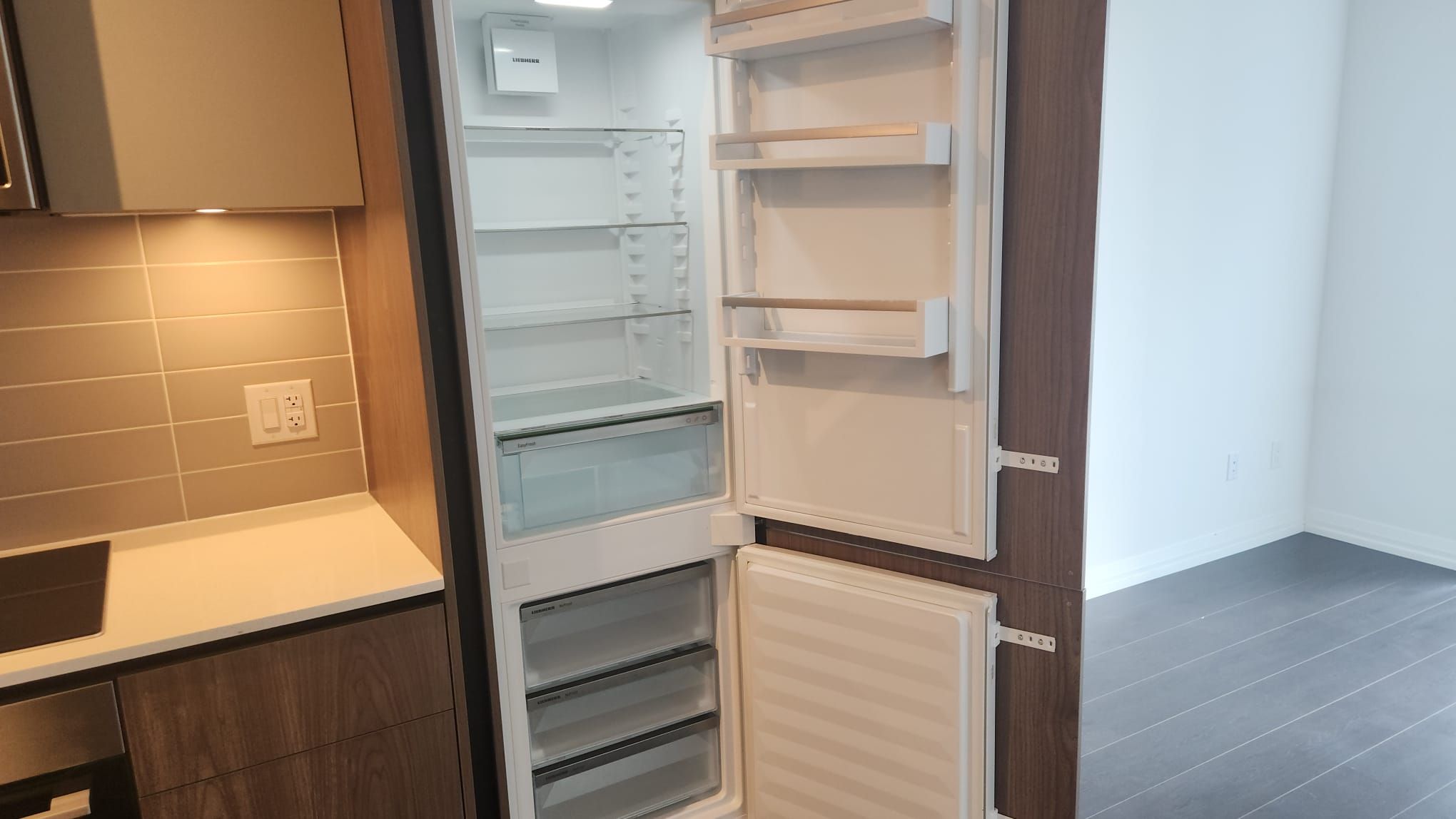 • Designer kitchen with stone countertops and stylish cabinetry.