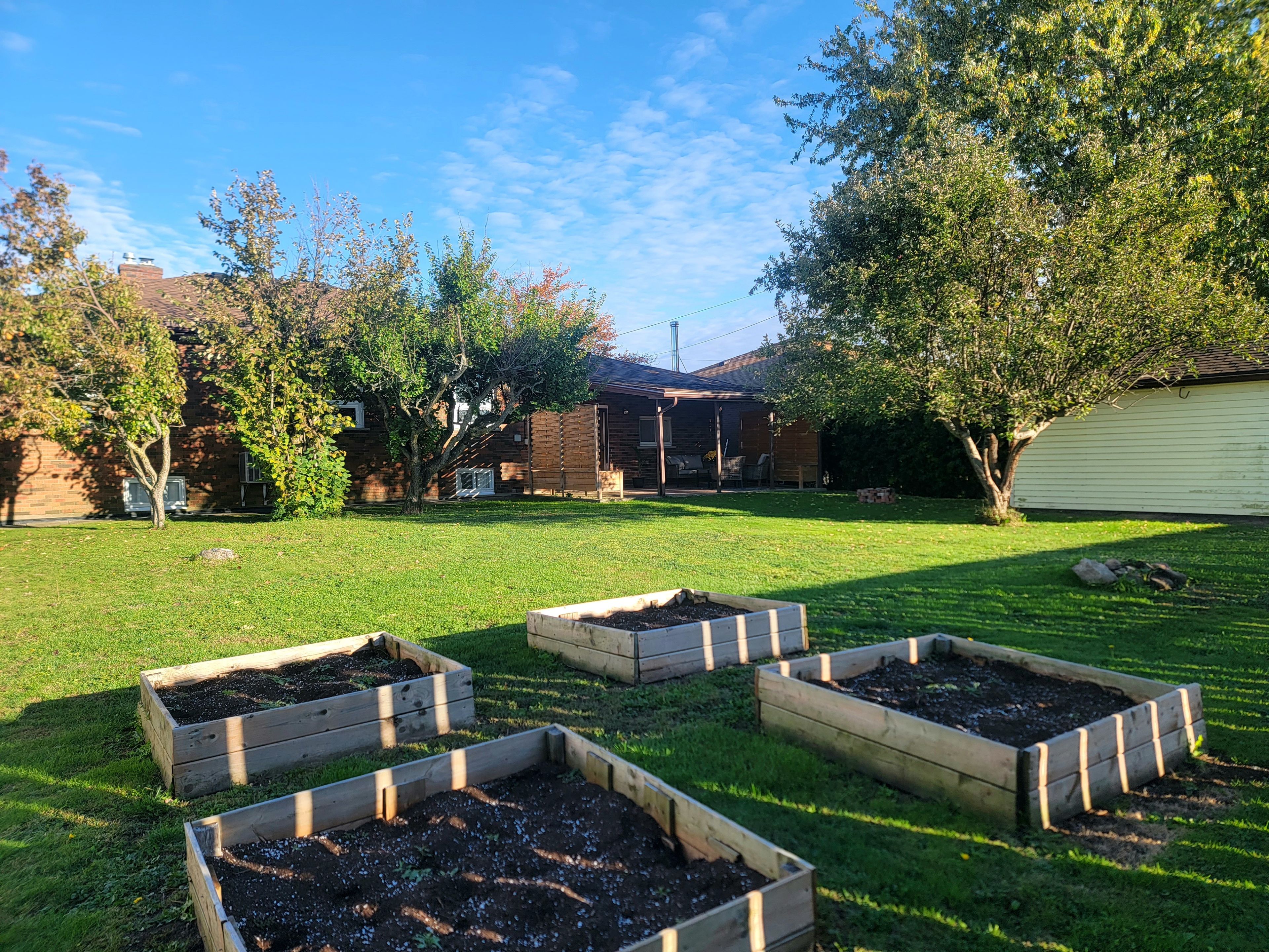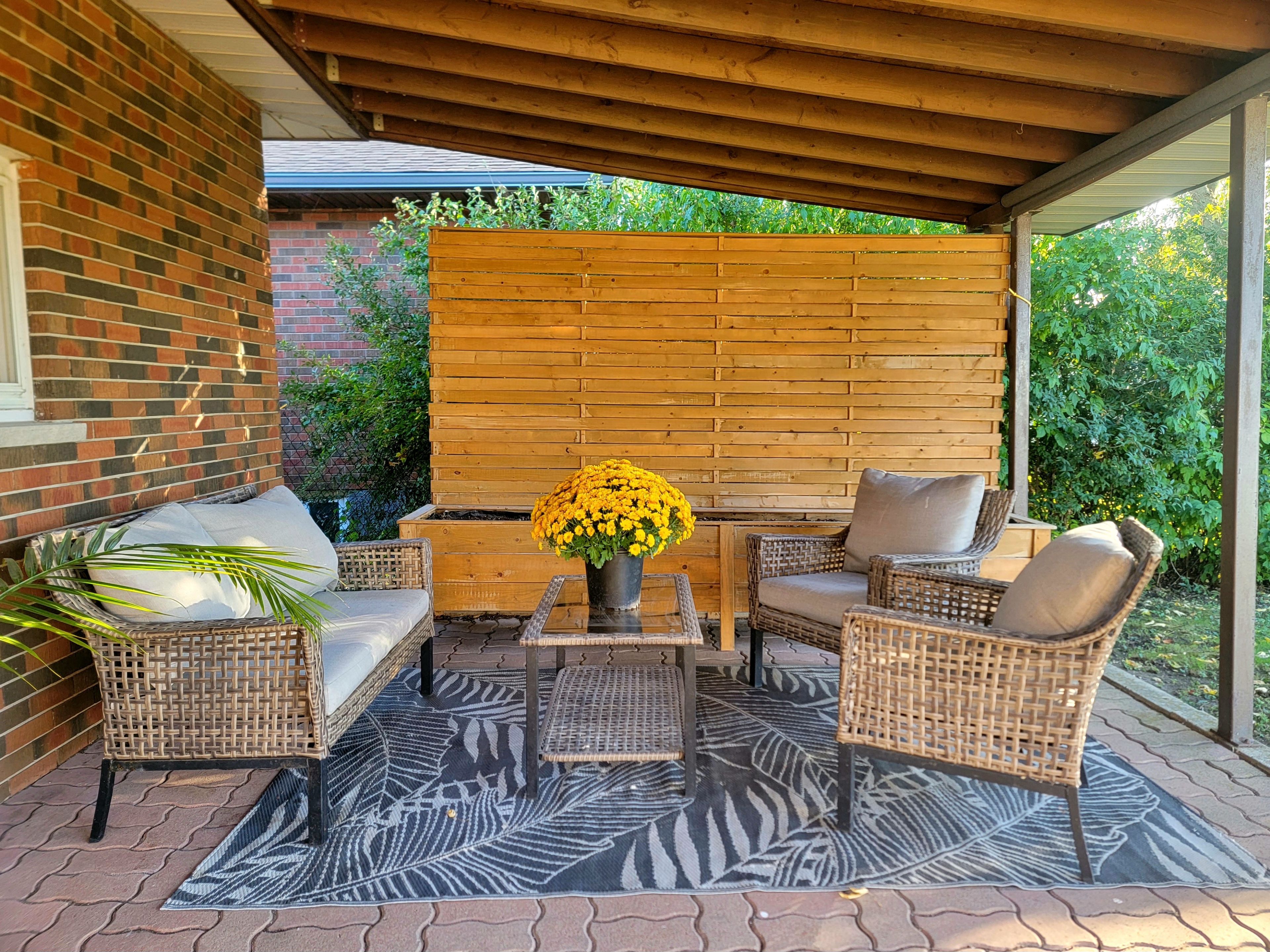 • Fully fenced backyard featuring a covered patio and garden boxes.