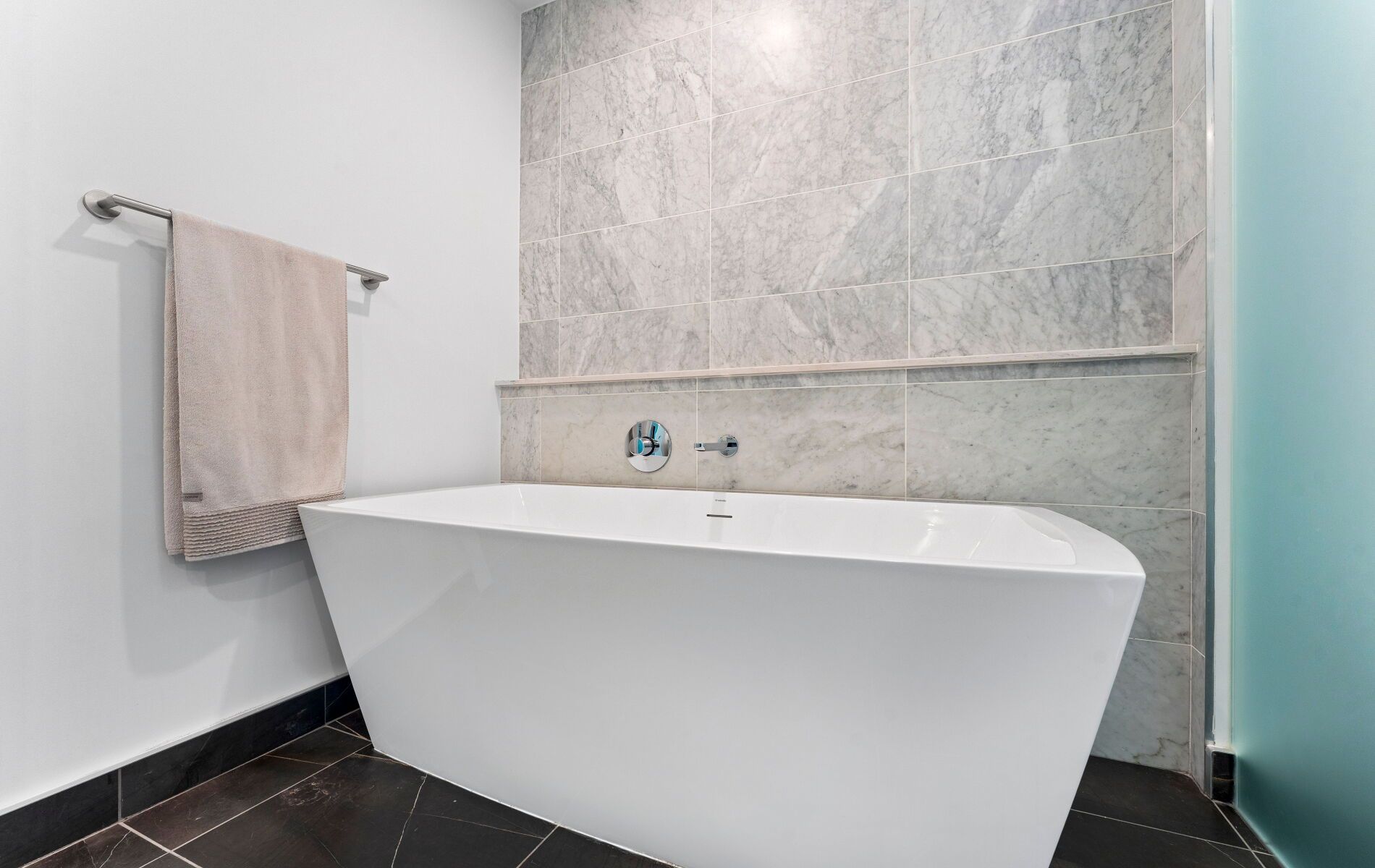 • Sleek kitchen with Miele appliances and a dramatic waterfall quartz island.