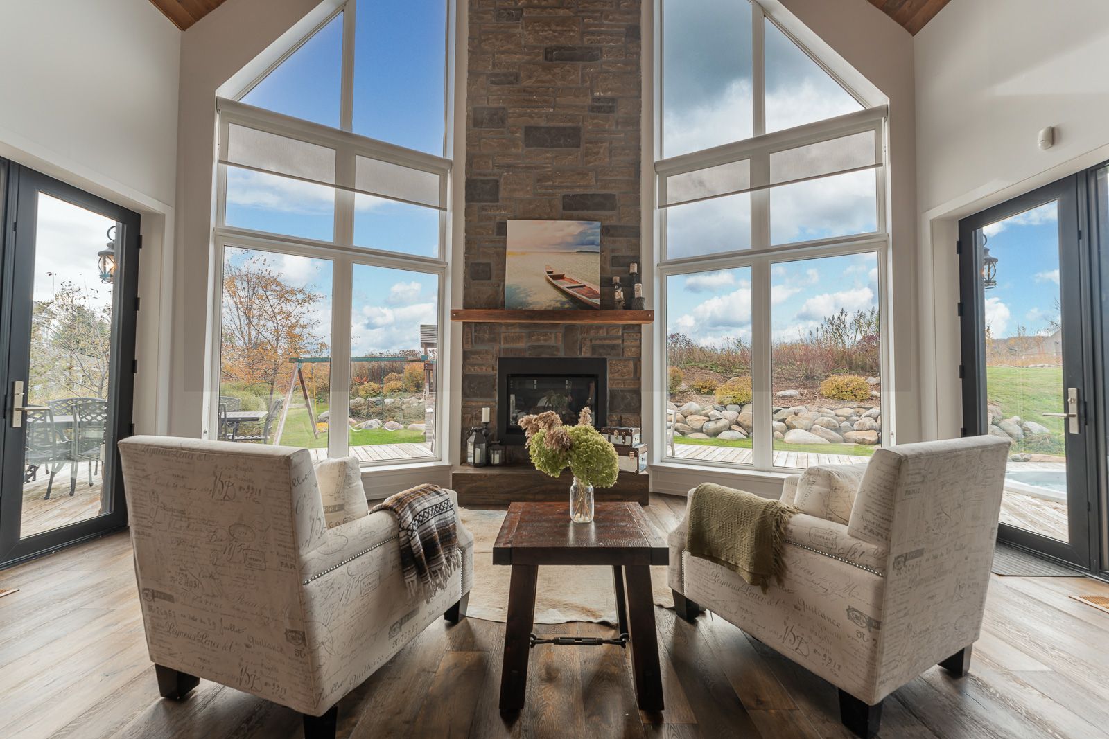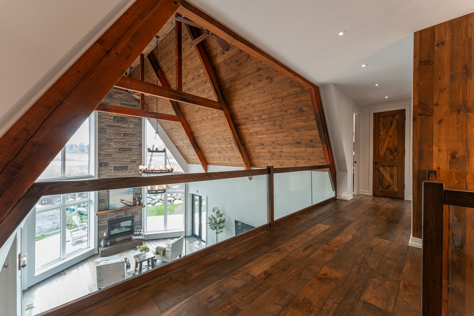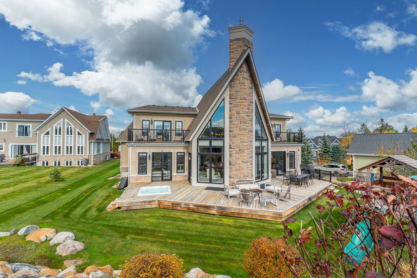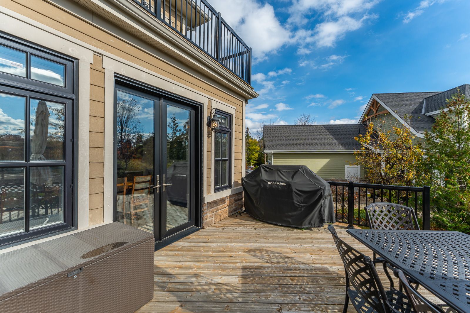 This custom-designed lora bay home in the blue mountains seamlessly combines contemporary chalet style with eco-conscious materials, like precast concrete and recycled steel, ensuring a low carbon footprint and long-lasting durability. The great room features vaulted ceilings, wood beams, and panoramic golf course views. A modern concrete fireplace adds elegance, and the chef's dream kitchen boasts granite counters, high-end appliances, and a wine fridge. The main floor offers a primary bedroom with a spa-like ensuite, walk-in closet, and a hot tub on the deck. Upstairs, three bedrooms and ensuites provide ample space, and the lower level includes a rec room, two bedrooms, a bathroom, and storage. Outside, an expansive back deck with a hot tub and beautiful landscaping invites relaxation and outdoor enjoyment.