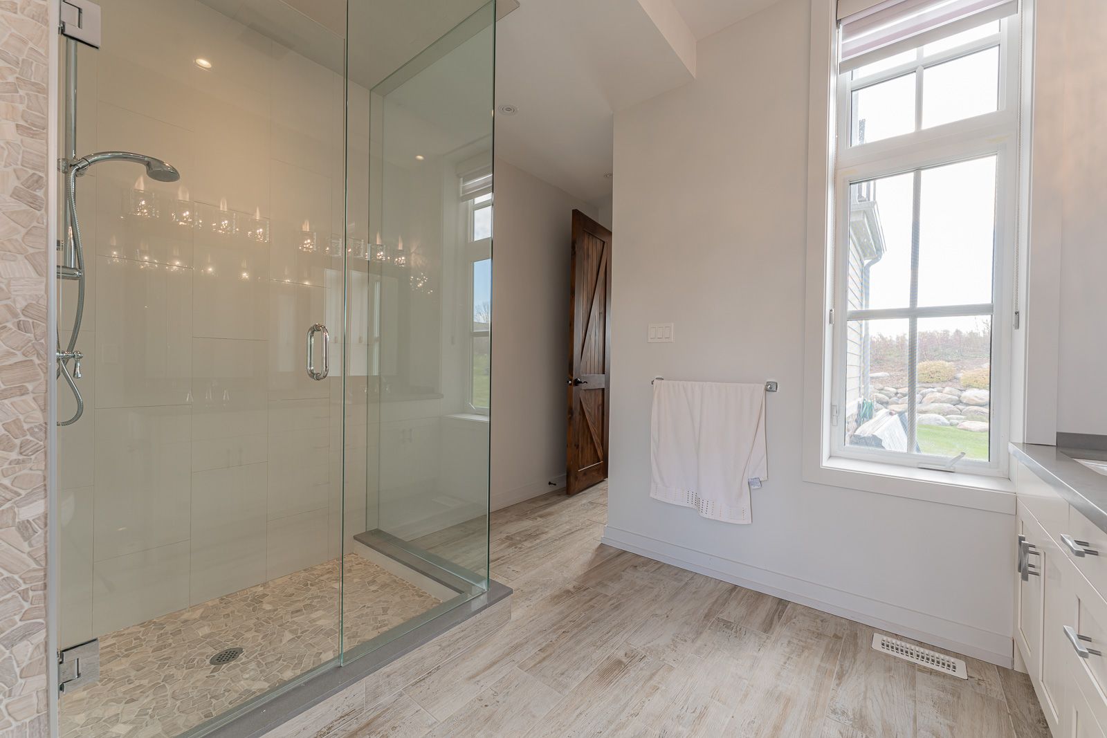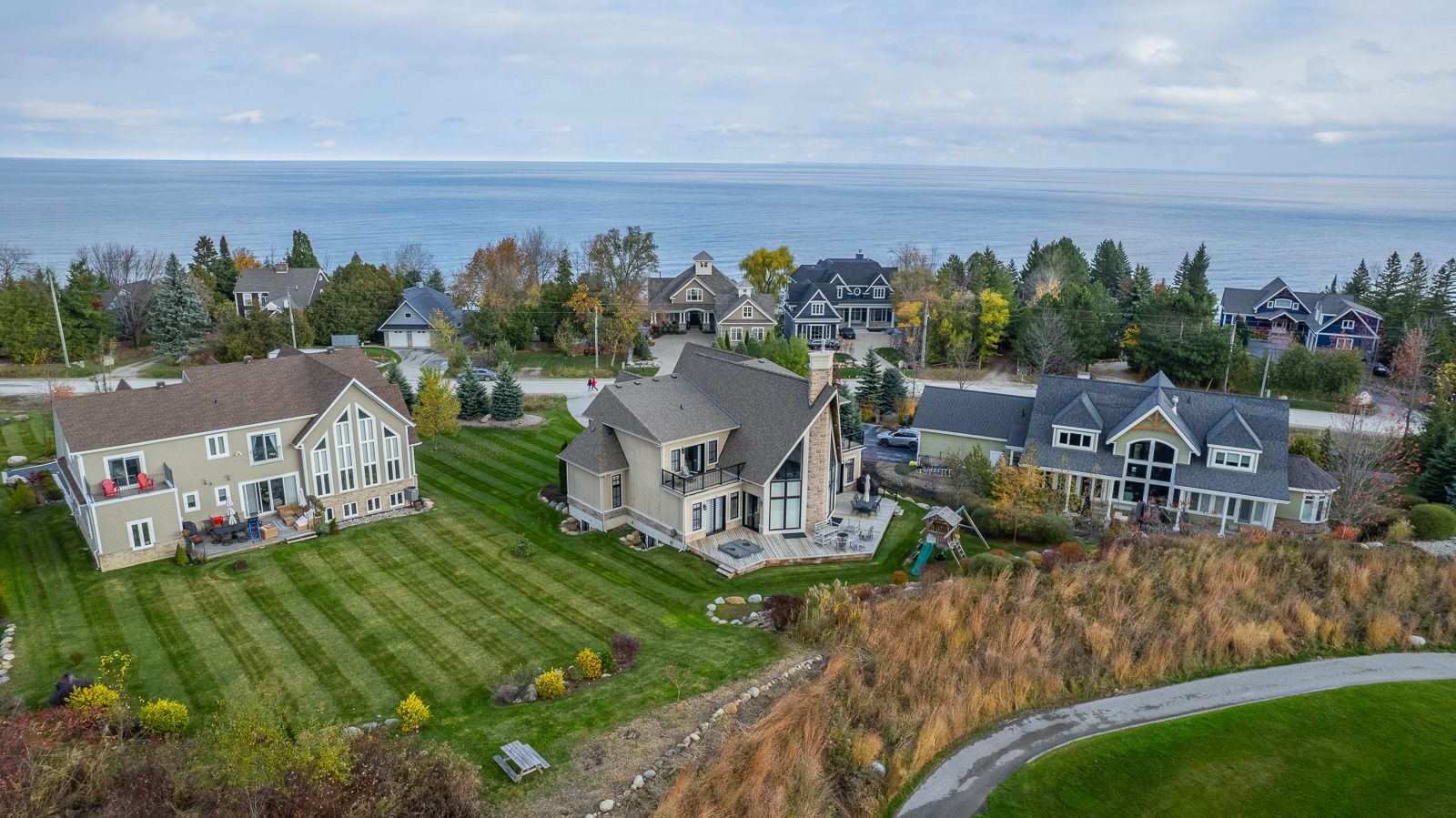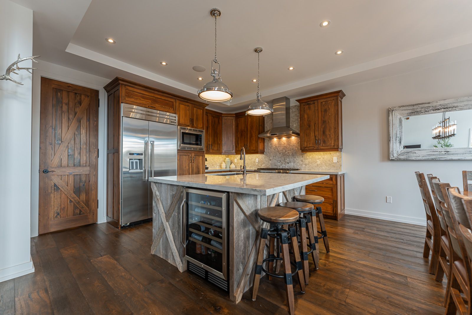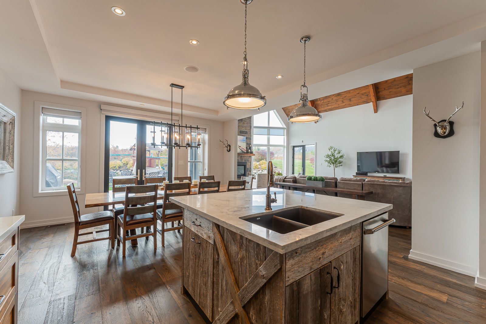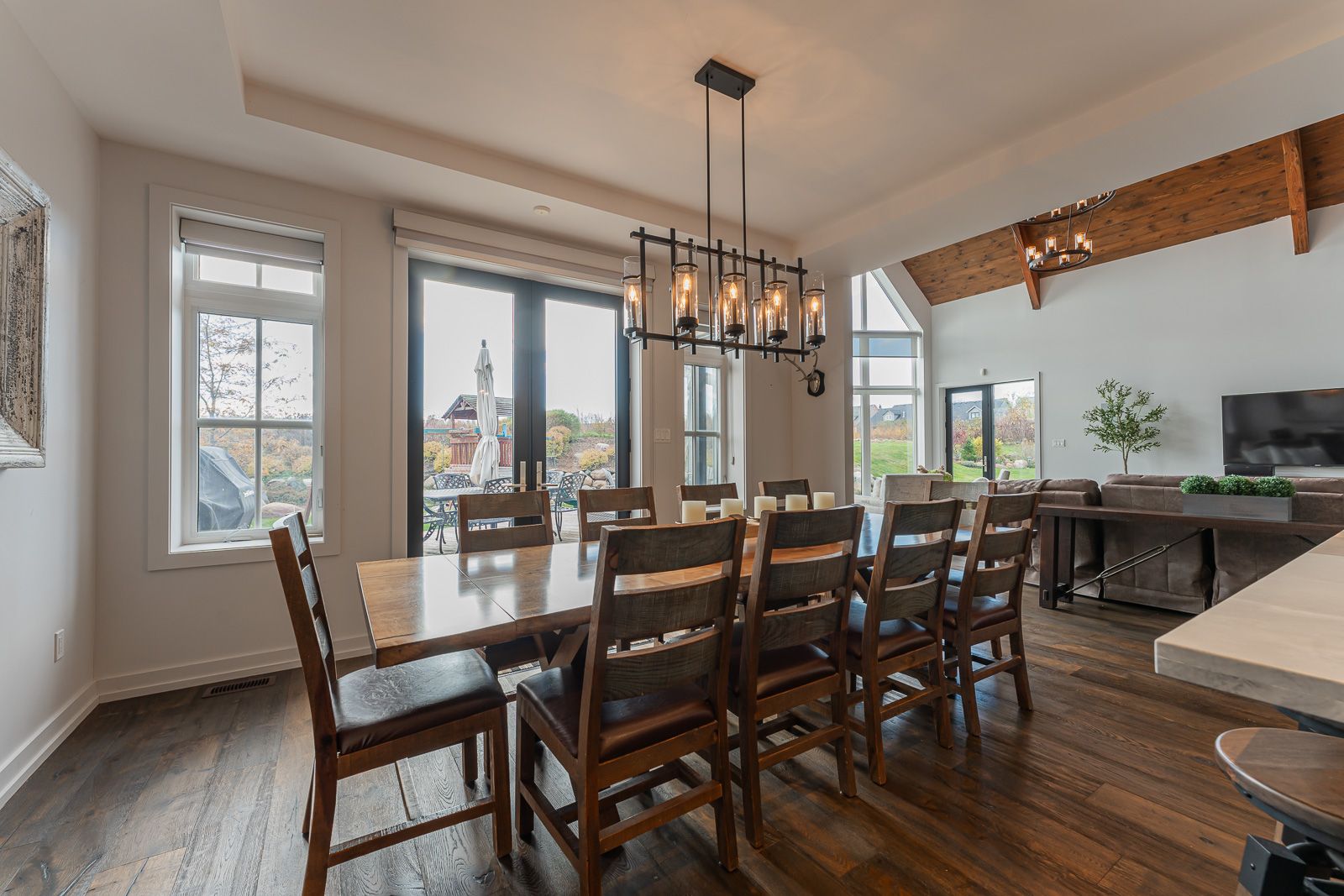 This custom-designed lora bay home in the blue mountains seamlessly combines contemporary chalet style with eco-conscious materials, like precast concrete and recycled steel, ensuring a low carbon footprint and long-lasting durability. The great room features vaulted ceilings, wood beams, and panoramic golf course views. A modern concrete fireplace adds elegance, and the chef's dream kitchen boasts granite counters, high-end appliances, and a wine fridge. The main floor offers a primary bedroom with a spa-like ensuite, walk-in closet, and a hot tub on the deck. Upstairs, three bedrooms and ensuites provide ample space, and the lower level includes a rec room, two bedrooms, a bathroom, and storage. Outside, an expansive back deck with a hot tub and beautiful landscaping invites relaxation and outdoor enjoyment.